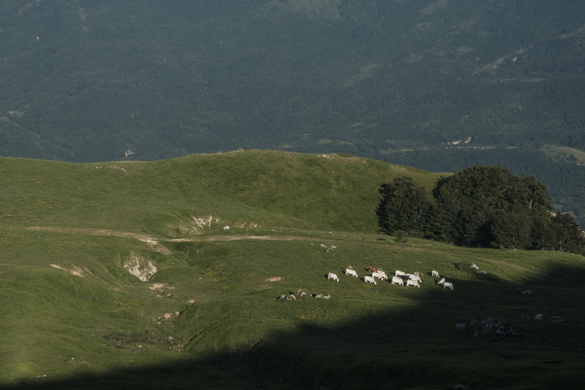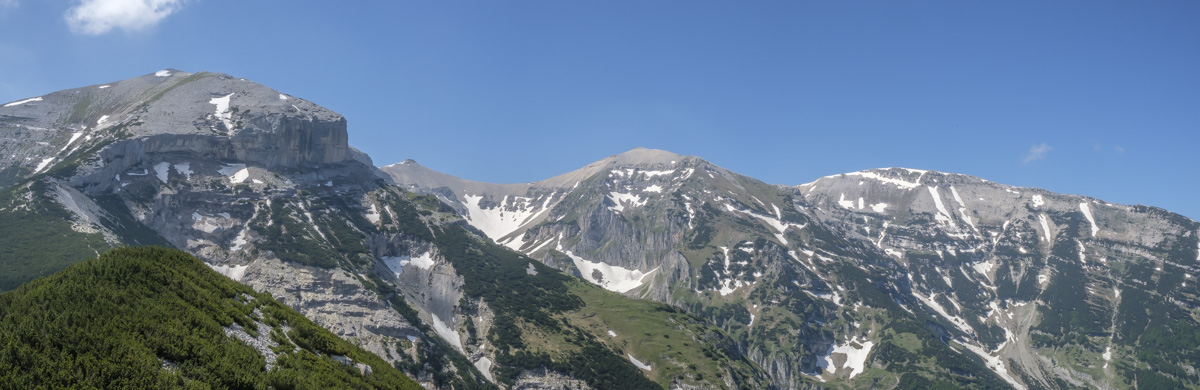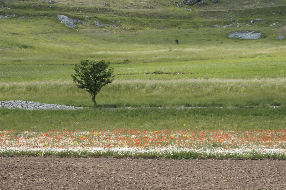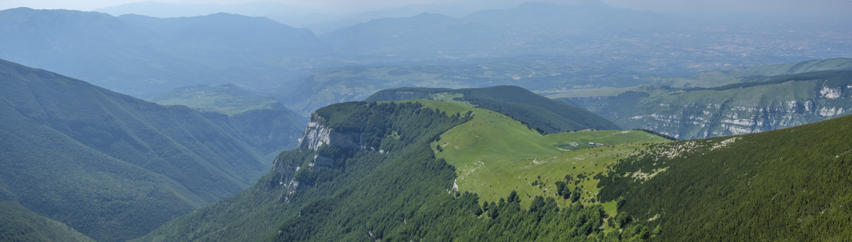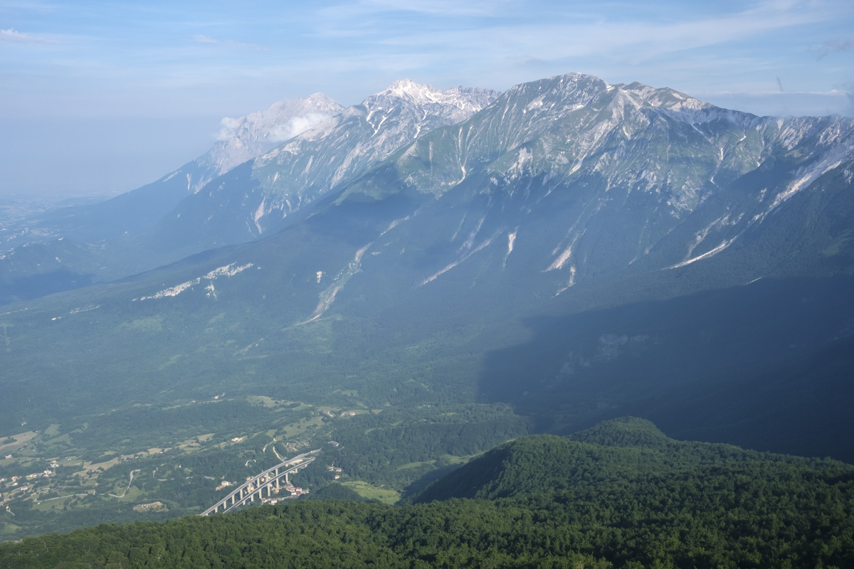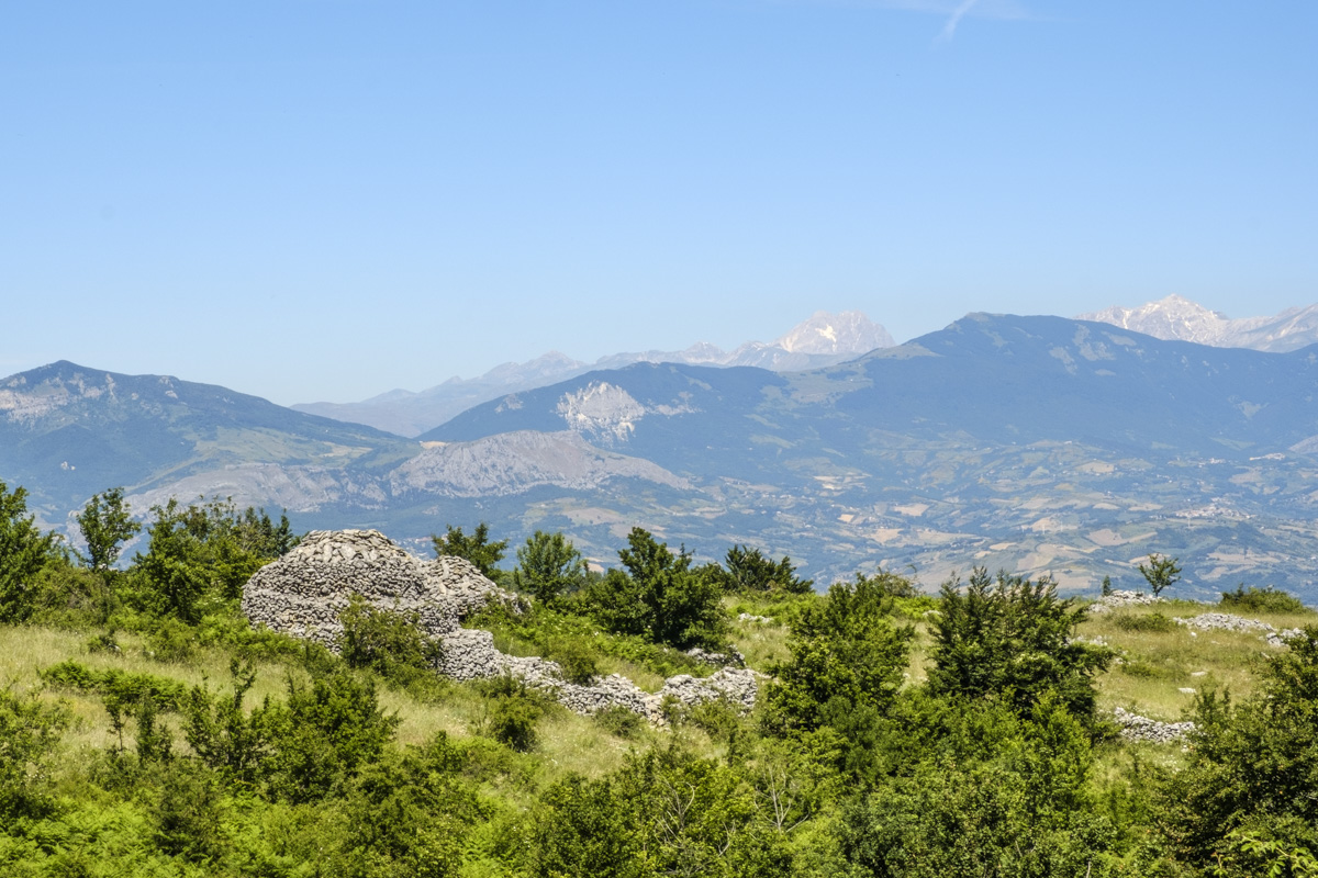 Der Bus fährt hoch hinauf zum Rifugio Bruno Pomilio. Viele Sendemasten stehen hier rum. Auf einem langen Rücken geht es dahin, und dann steilt sich der Weg auf bis hin zur Biwakschachtel. Eine weite Landschaft. Graue Felskuppen, die wie Dünen ausschauen, Schneefelder, grüne Wiesen mit vielen Blumen, Schluchten mit Buchenwäldern, die ins flache Land münden, und im fernen Dunst das Meer. Und alles ist weit, und auch weit zu laufen.