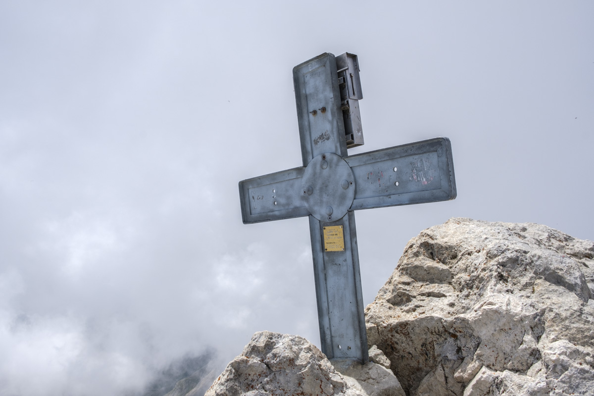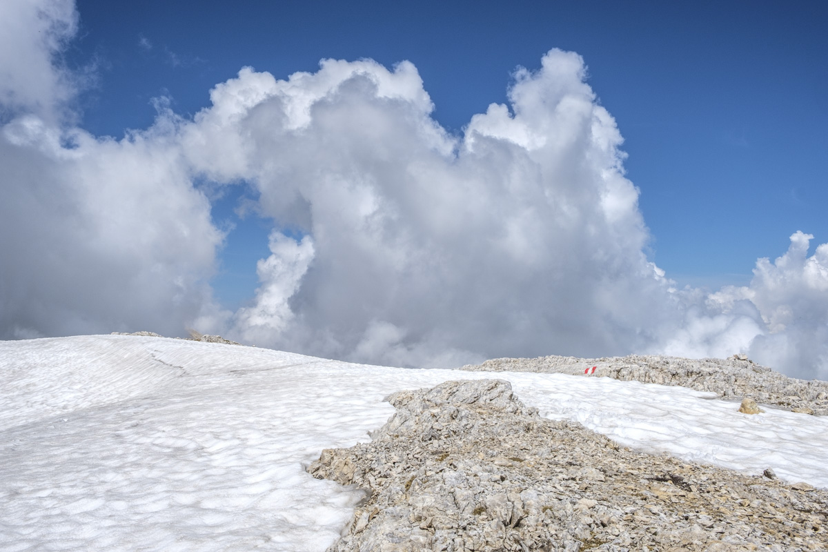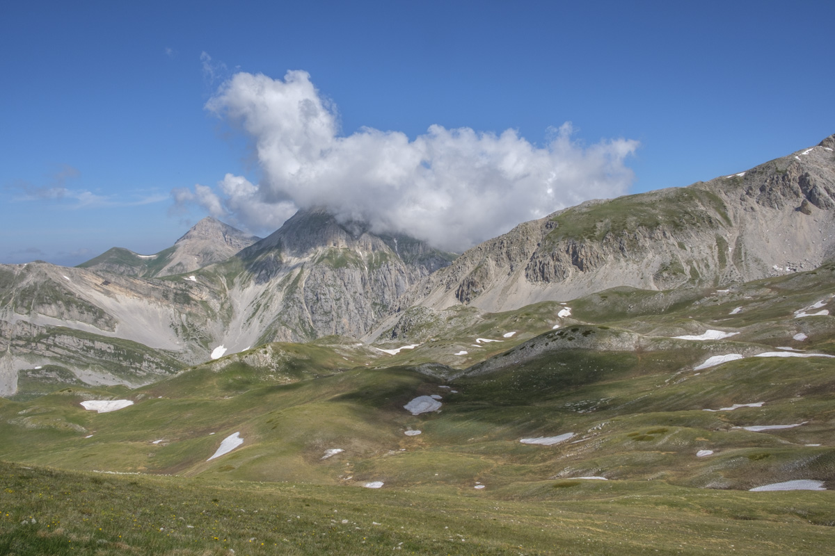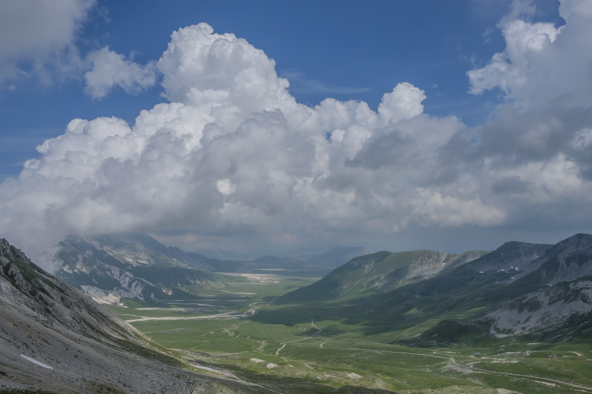 Wir fahren hinauf auf das Campo Imperatore, und da steht er, der Felsenklotz, und erwartet uns. Die Fahrt geht noch weiter bis zur Bergstation der Seilbahn. Wie immer muss erst Strecke gemacht werden, bevor die Steigung beginnt. Und wie immer ist die Landschaft weit und großartig. Durch die schottrige Nordflanke zieht sich der Normalweg hoch, unterbrochen von kleinen Schneefeldern. Bei Erreichen des Gipfelkreuzes nehmen die Quellwolken überhand, es ist wie im Flugzeug, die überwältigende Aussicht lässt sich zumindest erahnen. Heute klappt es auch mit dem wohl erschwitzten Getränk.