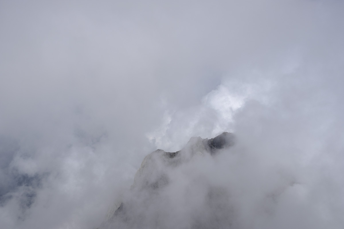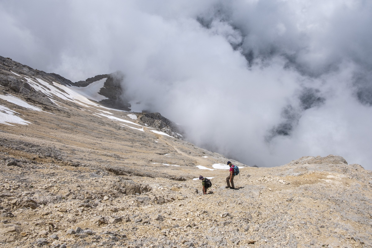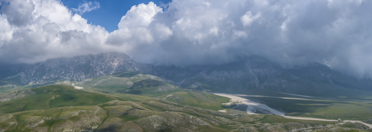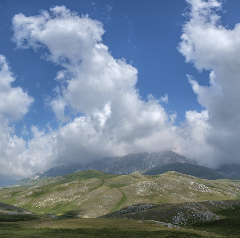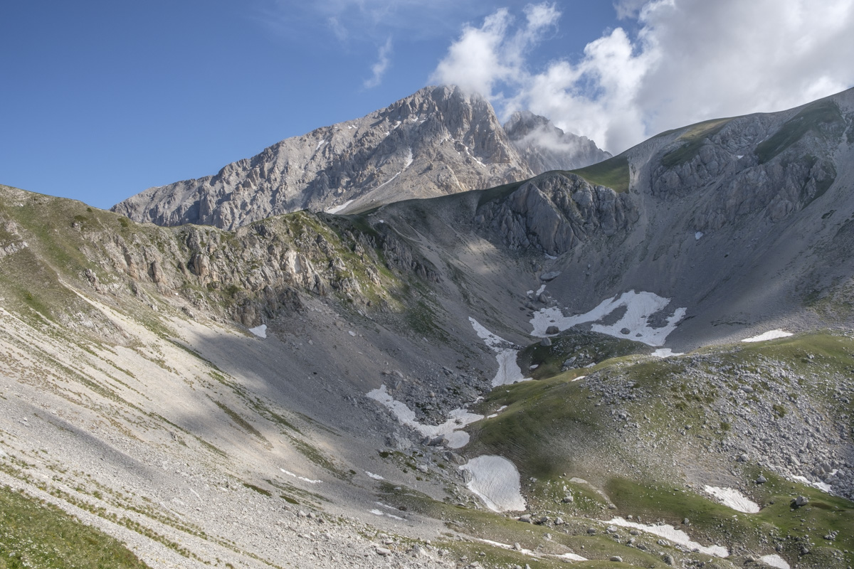 Wir fahren hinauf auf das Campo Imperatore, und da steht er, der Felsenklotz, und erwartet uns. Die Fahrt geht noch weiter bis zur Bergstation der Seilbahn. Wie immer muss erst Strecke gemacht werden, bevor die Steigung beginnt. Und wie immer ist die Landschaft weit und großartig. Durch die schottrige Nordflanke zieht sich der Normalweg hoch, unterbrochen von kleinen Schneefeldern. Bei Erreichen des Gipfelkreuzes nehmen die Quellwolken überhand, es ist wie im Flugzeug, die überwältigende Aussicht lässt sich zumindest erahnen. Heute klappt es auch mit dem wohl erschwitzten Getränk.