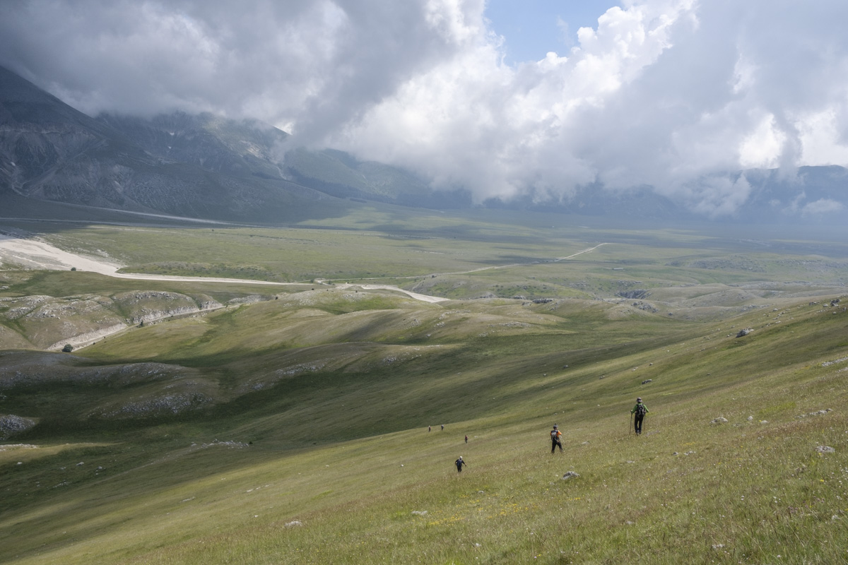 Wir gehen gegenüber, auf der anderen Seite des Campo Imperatore, auf einen Grasbuckel und wieder hinunter und weiter durch eine Art Wadi bis zu einer Art Grill-Garten.
