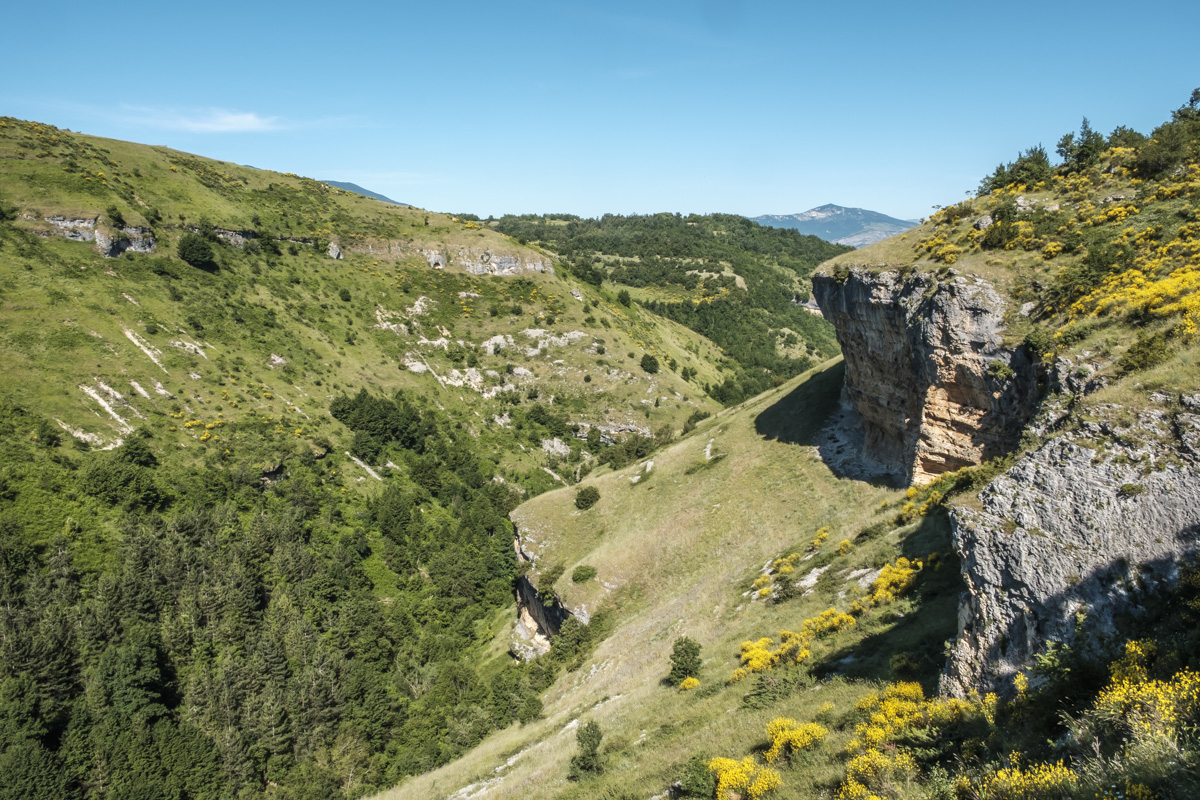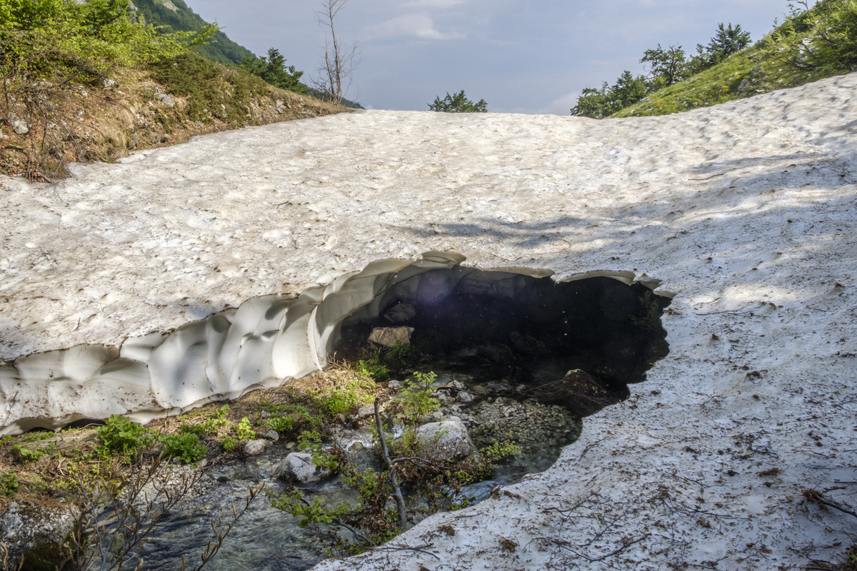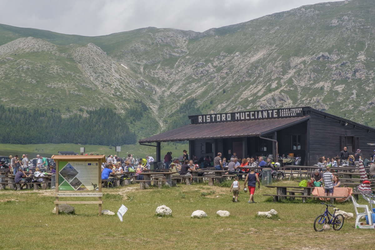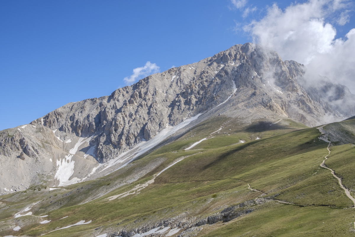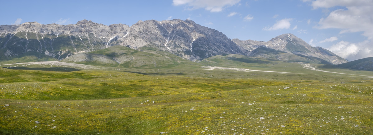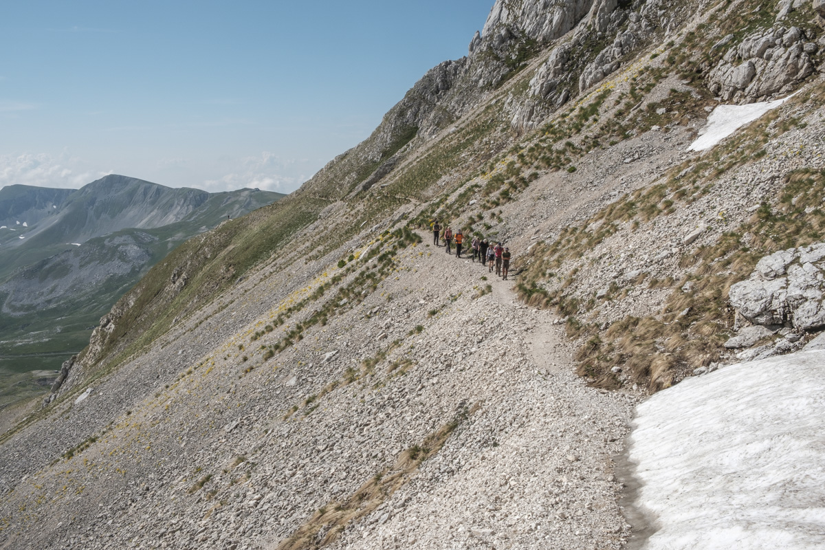 Zuerst hinab zum Rio Arno, der aber bald versiegt. Umgerissene Bäume und Waldschneisen zeugen von der Wucht der Lawinen. Beschaulich geht es dahin im Talgrund mit seinen grünen und blumigen Wiesen, die links und rechts hinaufführen zu steilen und senkrechten Felswänden. Über Schutt und gelegentlich Schnee steigen wir hoch in die Scharte La Portella. In der Ferne ist L’Aquila zu sehen. Nur noch eine Querung hinunter zur Bergstation der Funivia del Gran Sasso, dann könnte es ein Getränk geben. Aber leider ist heute die Bergstation auch Endstation einer Art von Giro d’Italia (RAI ist da), und so muss die Kompensation des Flüssigkeitsverlustes sich noch gedulden. Das neue Quartier ist in Santo Stefano di Sessanio.