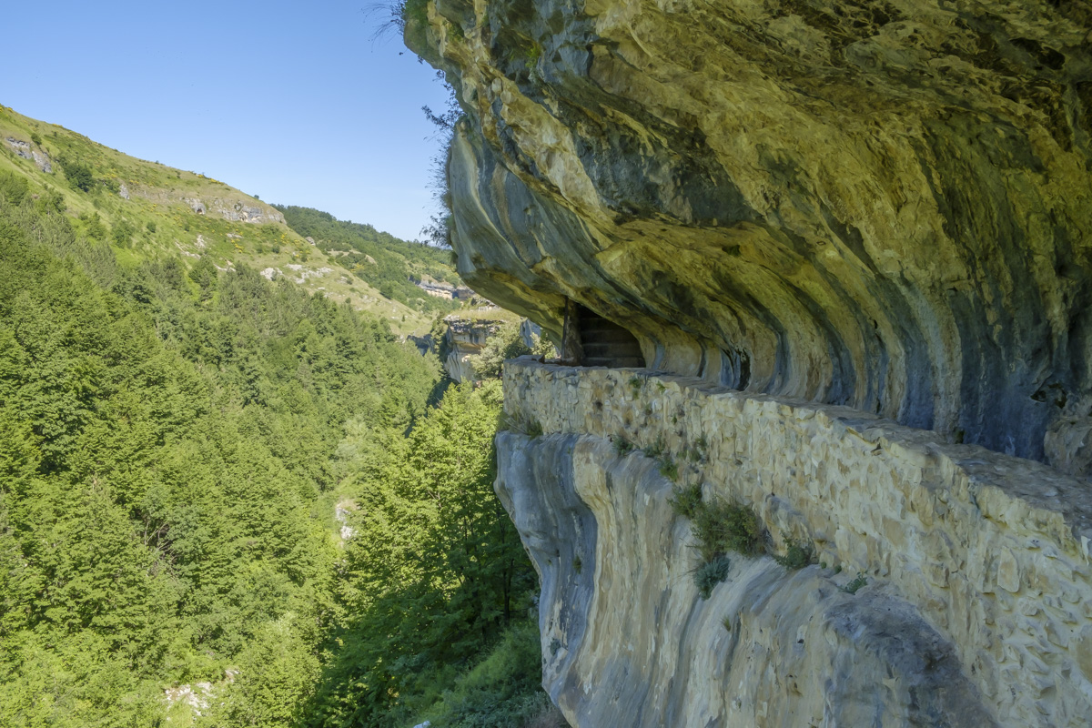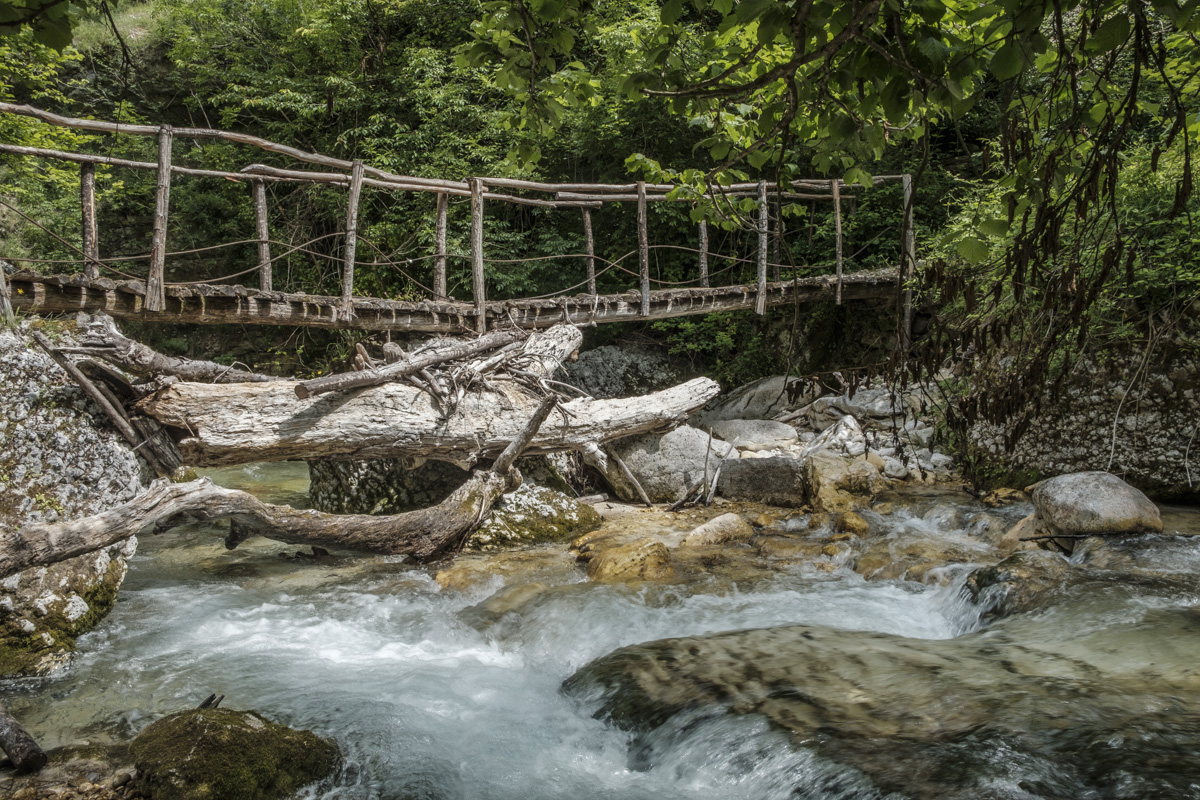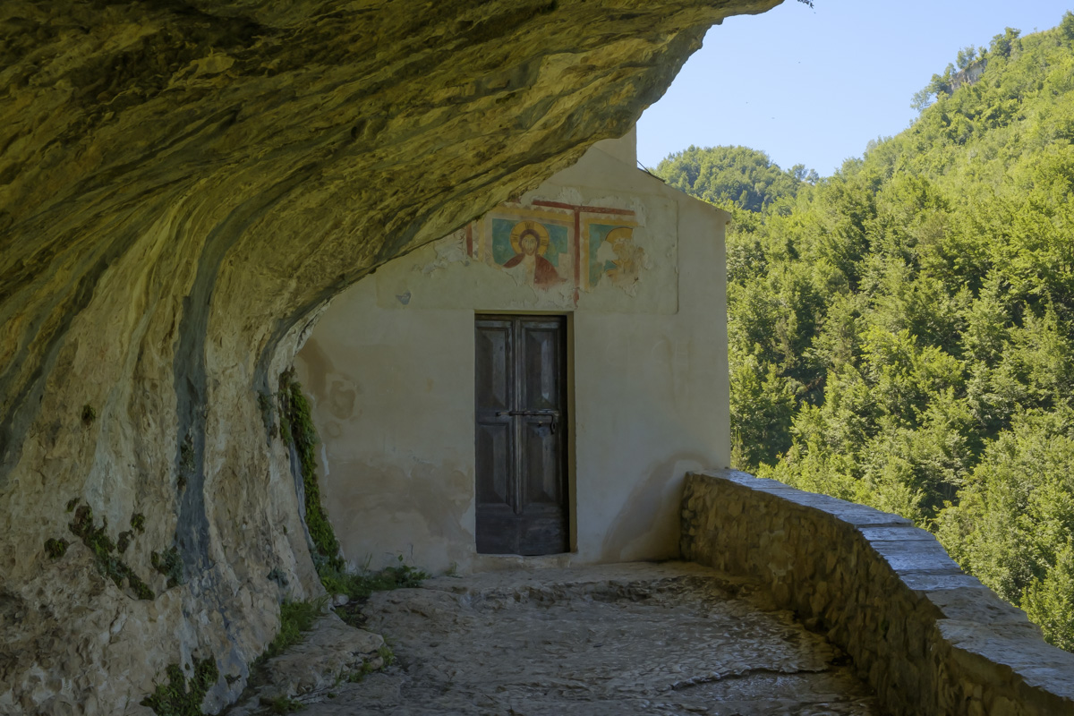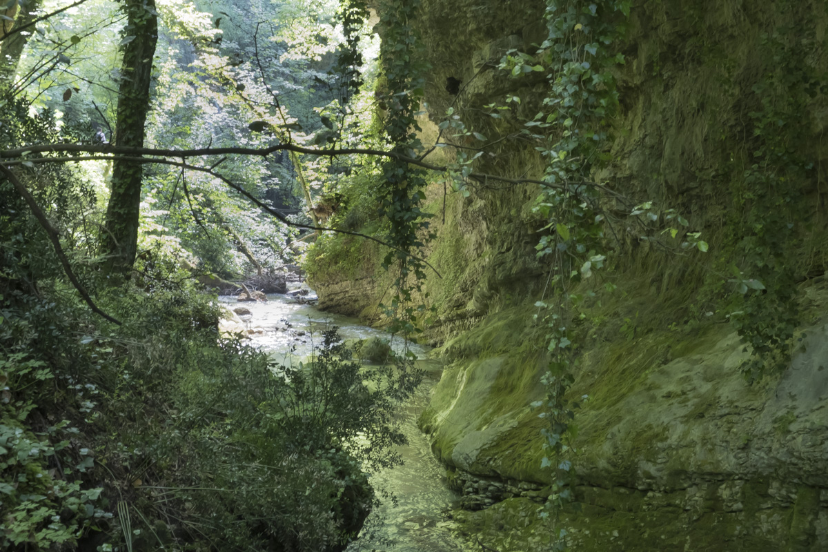 Wir gehen los vom Hotel zum Besucherzentrum des Majella-Nationalparks. G. erklärt hier so einiges. Dann wird’s ernst. Wir kommen allmählich hinunter zum Bach und dann bergauf zur verlassenen Eremo di Sant’Onofrio. Alles im Wald. Eine gefühlte Luftfeuchtigkeit von 200%. Die Einsiedelei bietet einen netten Blick auf Felsen-Berge mit Schnee. Wieder zurück. Auffallend sind die oft überhängenden Felsformationen. Erst gegen Ende des Weges, vor der hohen Straßenbrücke, wird es richtig schluchtig.