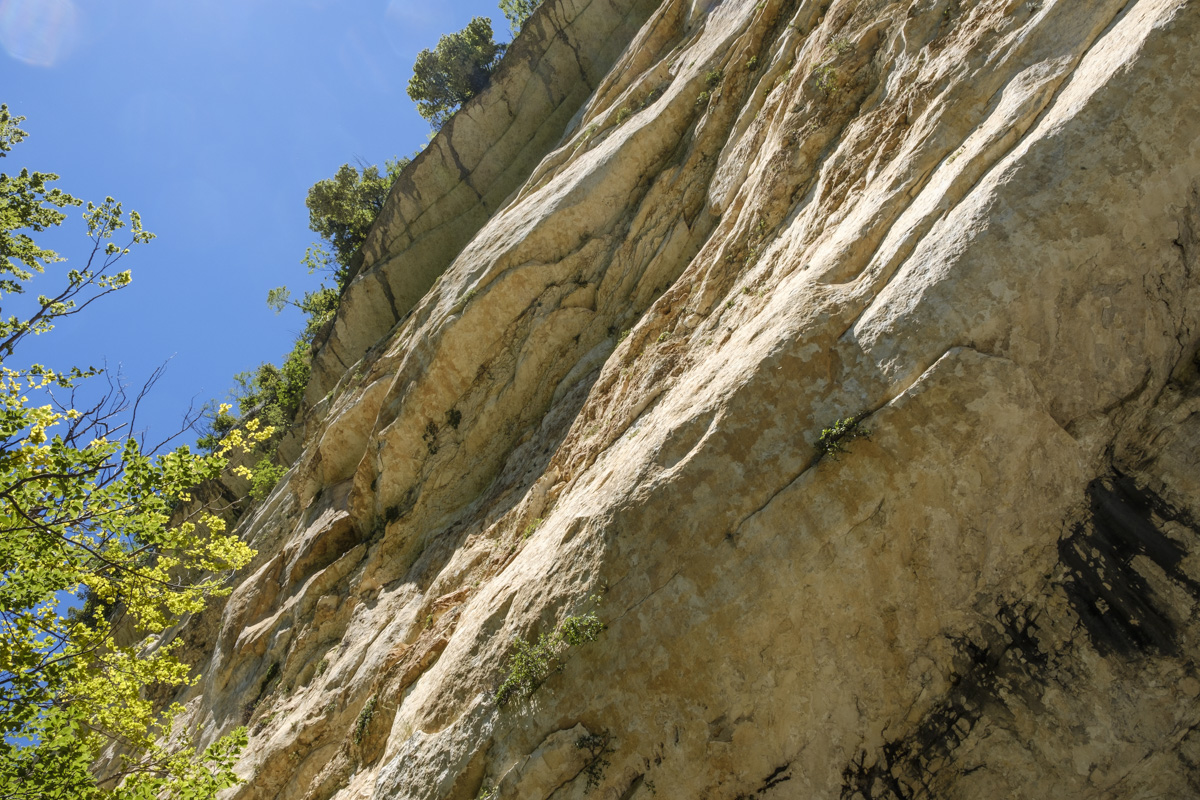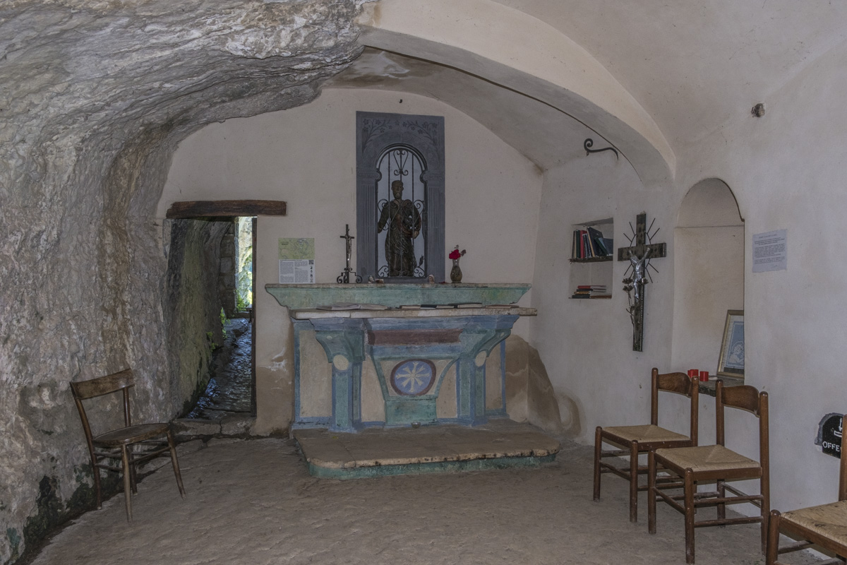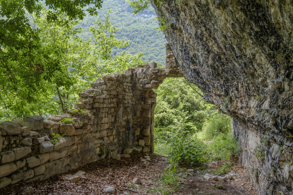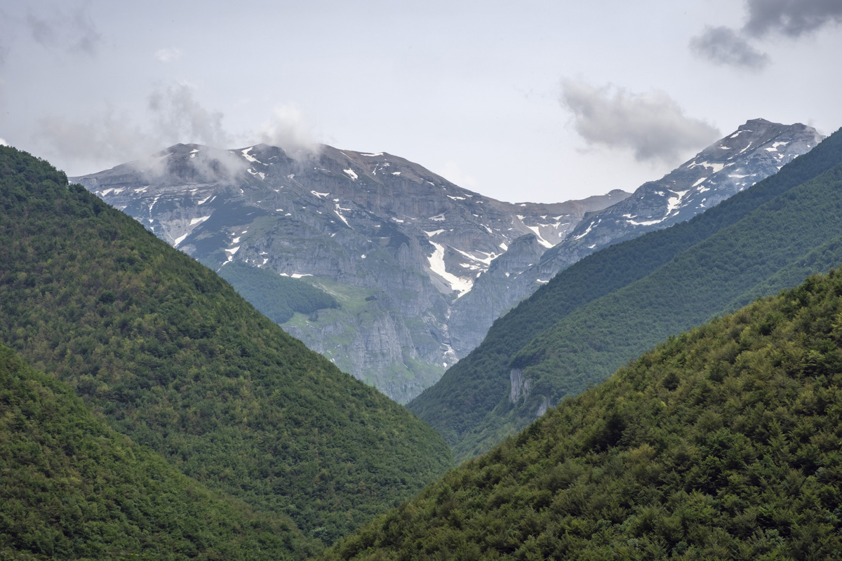 Wir gehen los vom Hotel zum Besucherzentrum des Majella-Nationalparks. G. erklärt hier so einiges. Dann wird’s ernst. Wir kommen allmählich hinunter zum Bach und dann bergauf zur verlassenen Eremo di Sant’Onofrio. Alles im Wald. Eine gefühlte Luftfeuchtigkeit von 200%. Die Einsiedelei bietet einen netten Blick auf Felsen-Berge mit Schnee. Wieder zurück. Auffallend sind die oft überhängenden Felsformationen. Erst gegen Ende des Weges, vor der hohen Straßenbrücke, wird es richtig schluchtig.