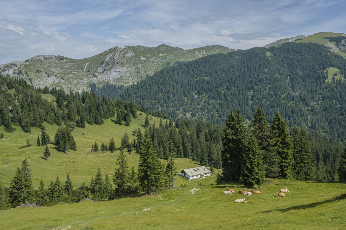 Beim schönen Hotel Ammerwald wird geparkt. Über den breiten Schützensteig geht es hinauf, wir achten dabei auf Gegenverkehr, MTBs, und im Sattel biegen wir auf einen Karrenweg nach links ab, müssen einige Weidezäune überwinden, Schilder „lebensgefährlich“, und treffen auf den Wanderweg. Vorbei an der idyllisch gelegenen Hirschwängalm bis zur offensichtlichen, aber schilderlosen Abzweigung zum Ochsenälpeleskopf. Über den Ostrücken steil bergauf, bei der Hitze ist das harte Arbeit.