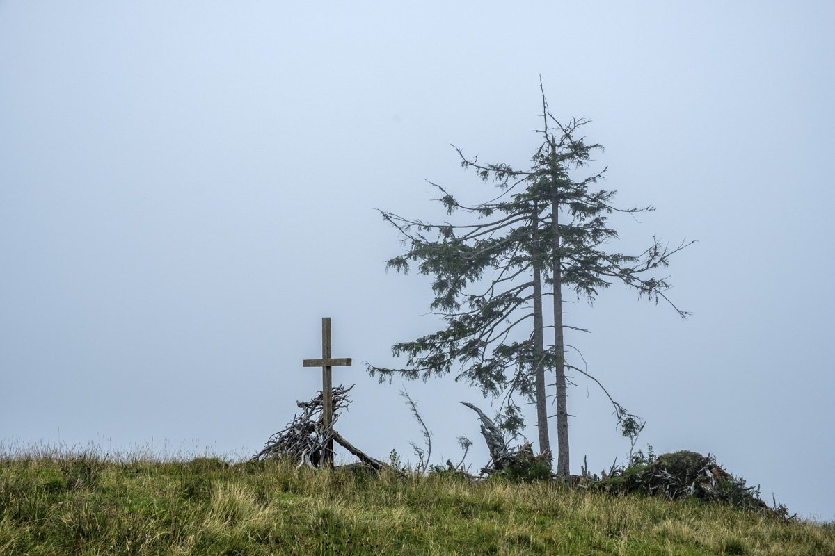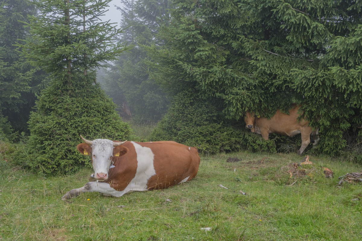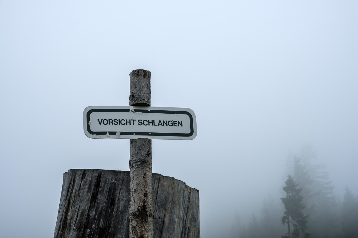 Die Schleifmühlenklamm in Unterammergau ist leider gesperrt, die alternative Forststraße ist kein Hit, der weitere Weg ist batzig, und der weglose Weg hinauf zum Gipfel des Rosengarten über die Wiesen ist von Kühen zertrampelt. Die nicht vorhandene Sicht – Nebel – erfreut auch nicht.
