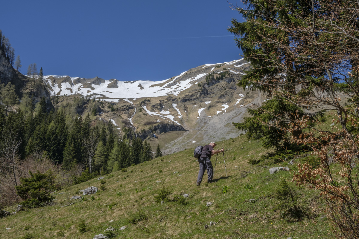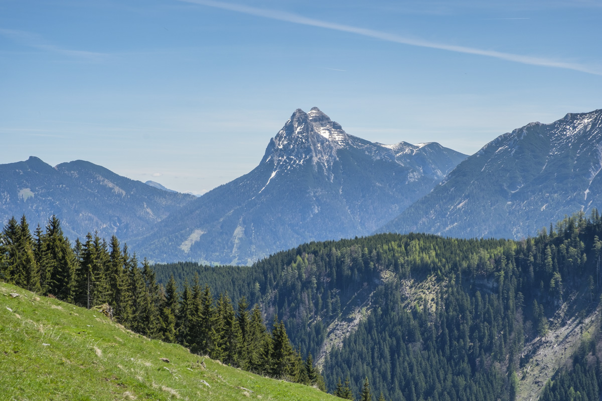 Gibt’s so was – eine Symbiose aus Straße und Weglosigkeit? Letztlich nicht, ist aber zumindest am Anfang interessant. Das Gasthaus Marie in Achenwald ist der Ausgangspunkt. Über Forststraßen und weglose Abschnitte geht es hinauf an den Schulterberg-Almen vorbei zur breiten Gipfelkuppe. Die vorgeschobene Lage des Schulterbergs ermöglicht einen ungewohnte Perspektive auf die bayerischen Berge. Auch beim Abstieg gibt es wieder eine wilde weglose Passage. Insgesamt aber deutlich zu viel der Straße… Mit Peter.