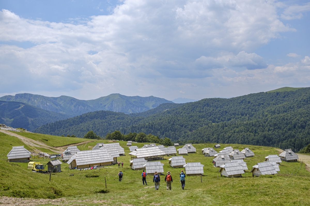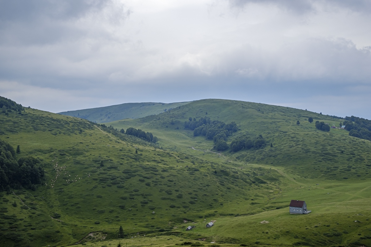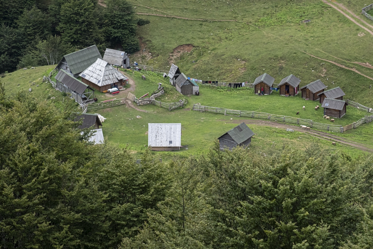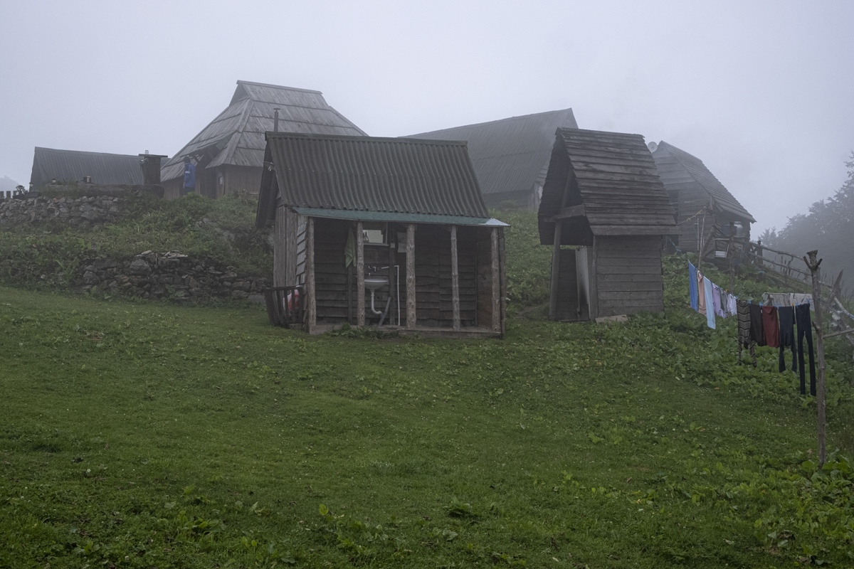 Höhenwanderung auf der Bjelasica. Wegen der Wolken nur geringe Fernsicht. Unspektakulär. Die Berge werden teilweise den Skipisten geopfert. Übernachtung im Almdorf Katun Vranjak.