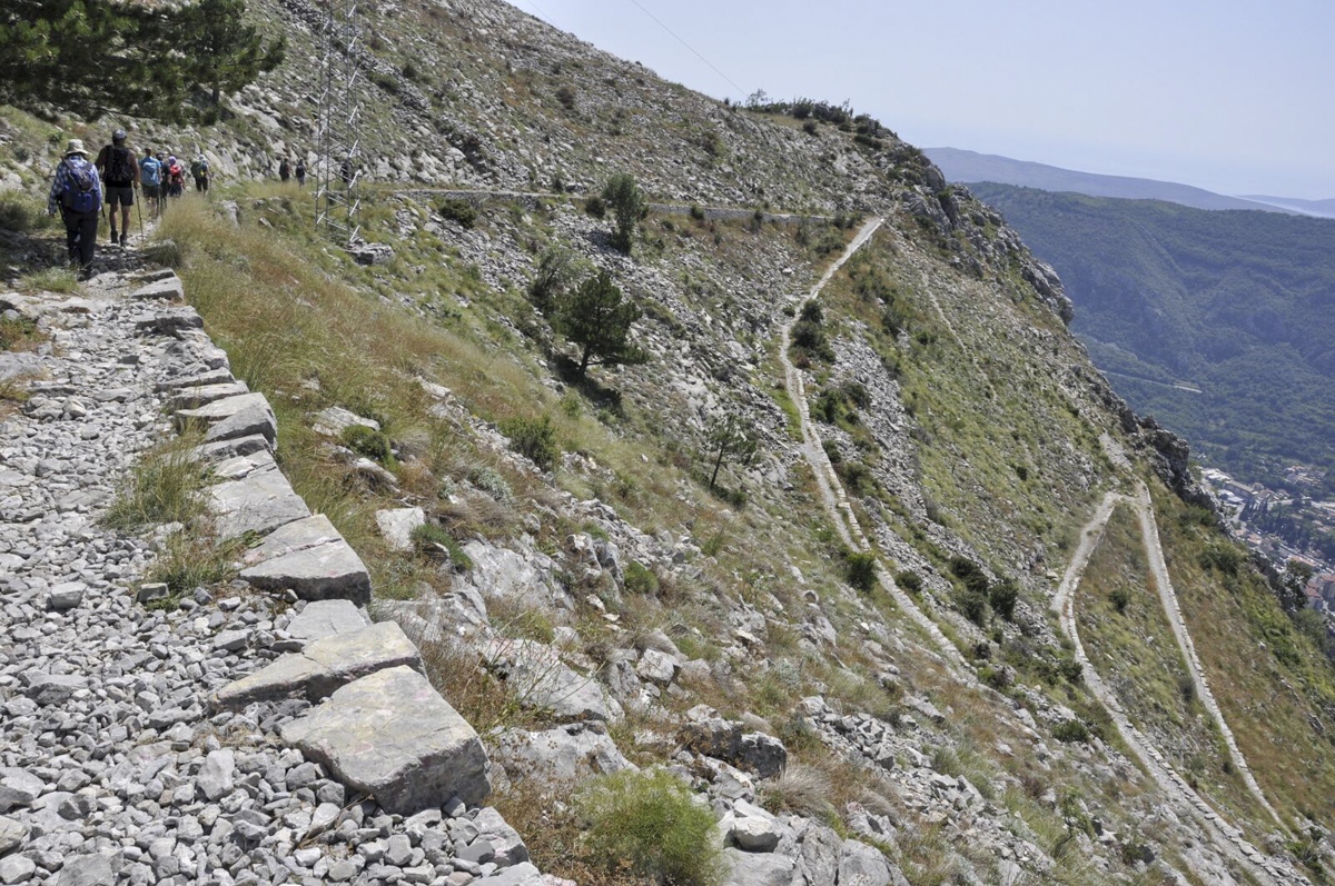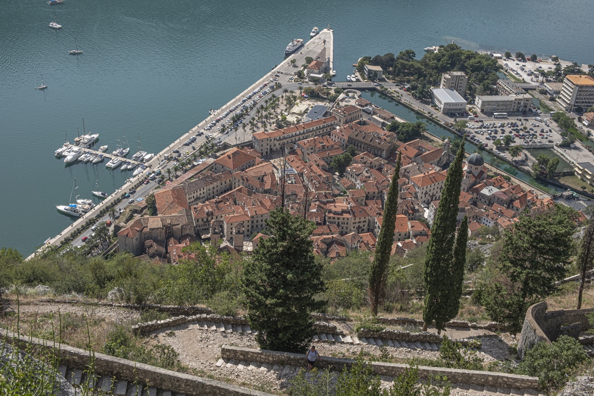 Mit dem Bus hinein ins Lovcen-Gebirge und hinauf zum Njegos-Mausoleum auf dem Jezerski Vrh. Hier ruht der Dichterfürst Petar II. Wegen Dunst kaum Sicht. Langer Abstieg nach Kotor, gelegentlich ätzende Straße. Bad im Mittelmeer. Viel Betrieb in Kotor. Übernachtung. Rückfahrt entlang der Küste, wo sich Geld und Schickeria zeigen, nach Podgoriza.