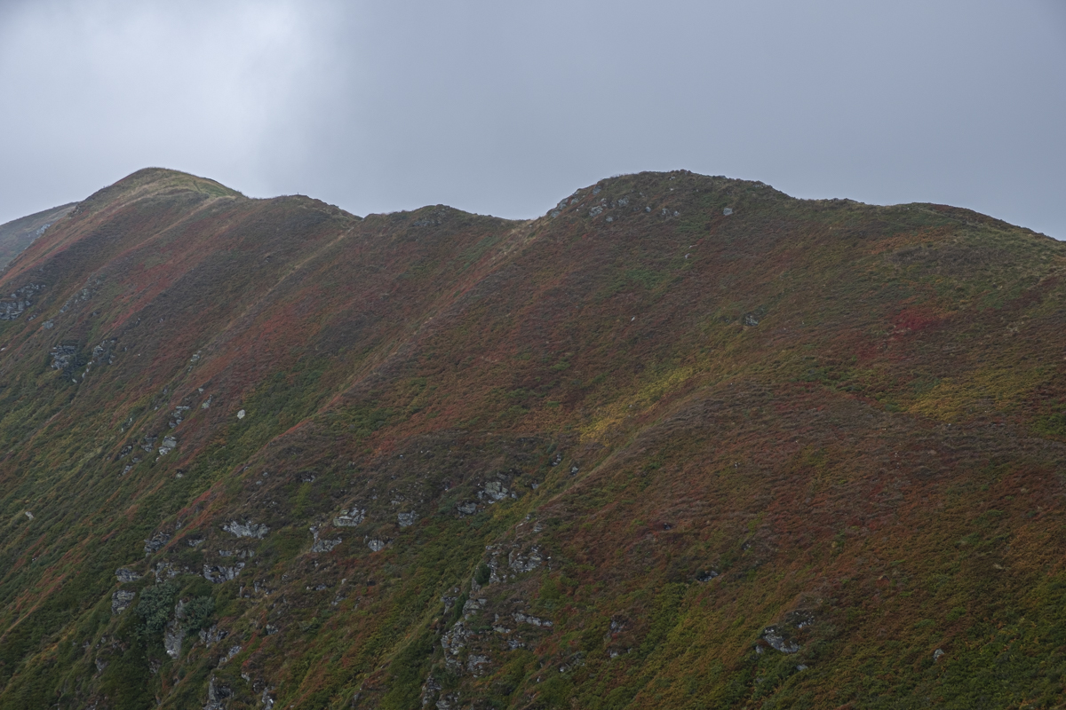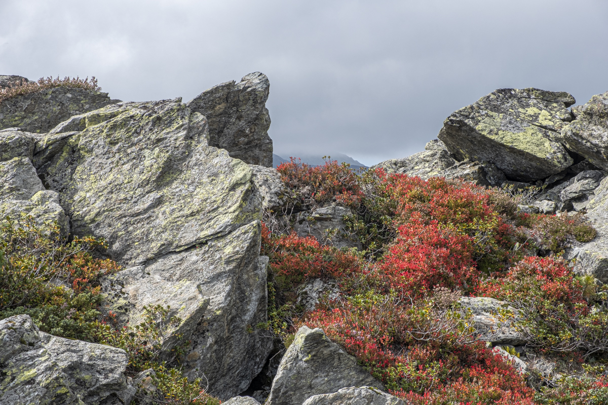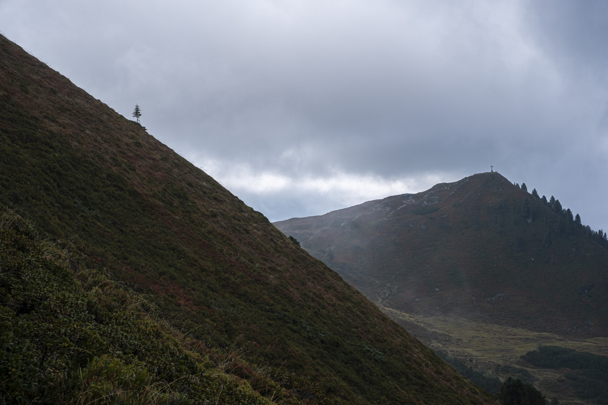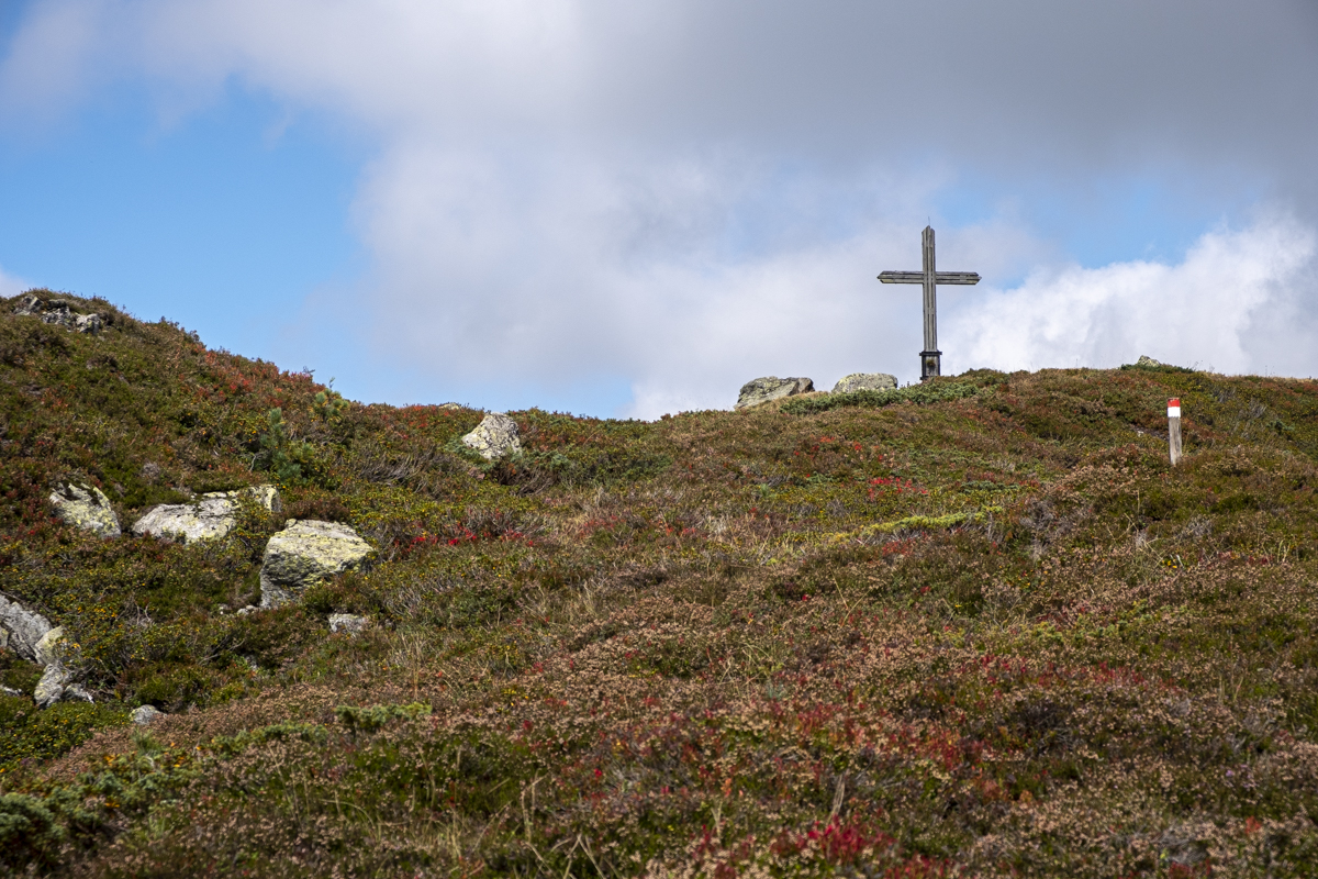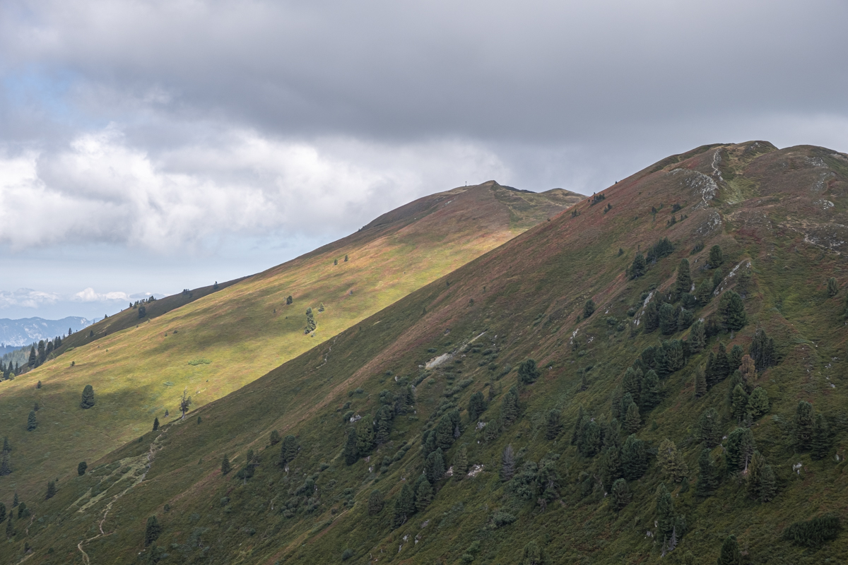 Ich gehe auf dem Kamm nach Süden, die Wolken beginnen aufzureißen, über die Breiteggspitze, die Hänge leuchten auf im Rot der Heidelbeersträucher, bis zum Siedeljoch. Nicht als Joch zu erkennen. Über den Kastensteig hinunter zu einer Straße, die in die „Hauptstraße“ mündet, und zur Schönangeralm.