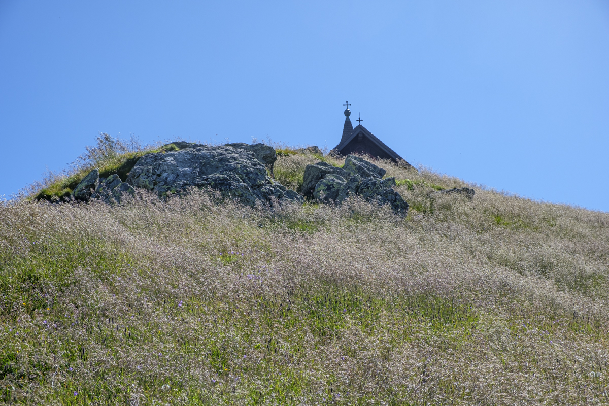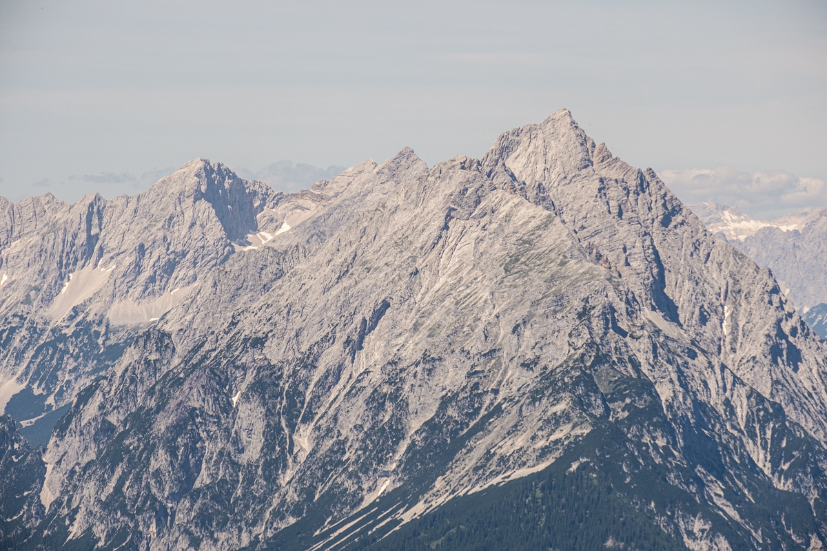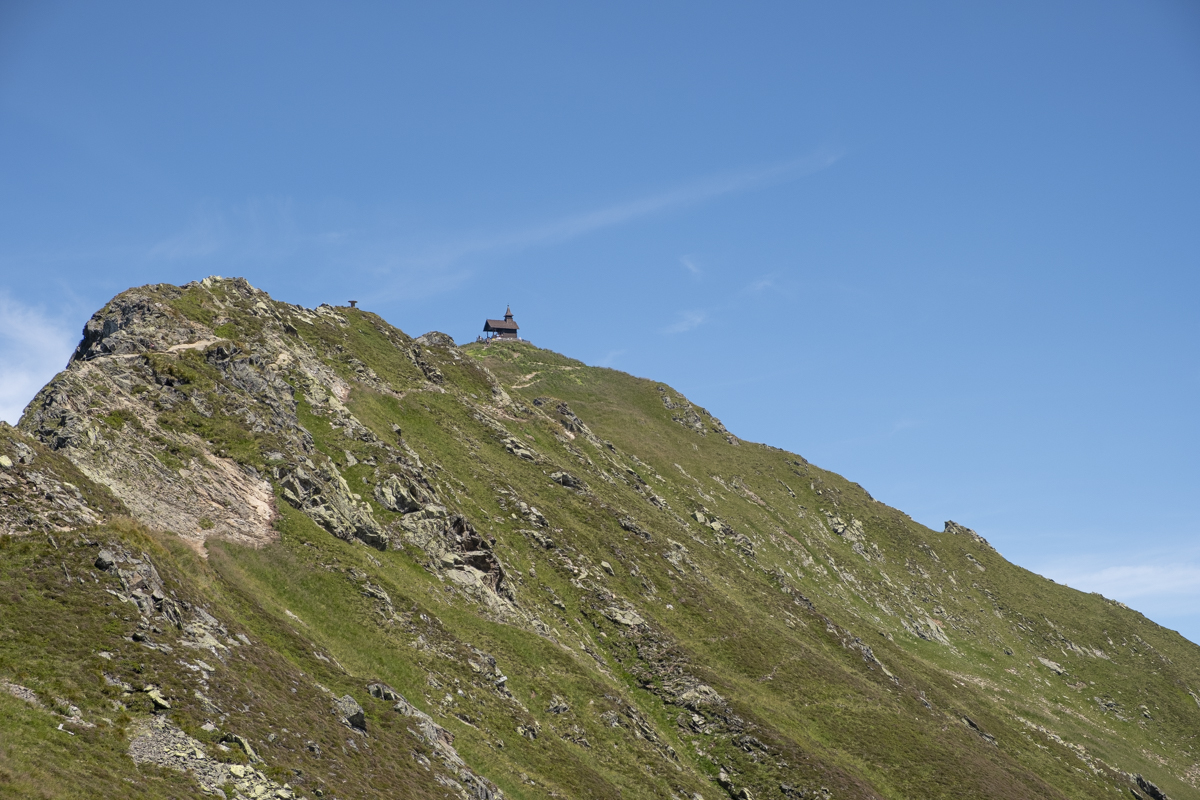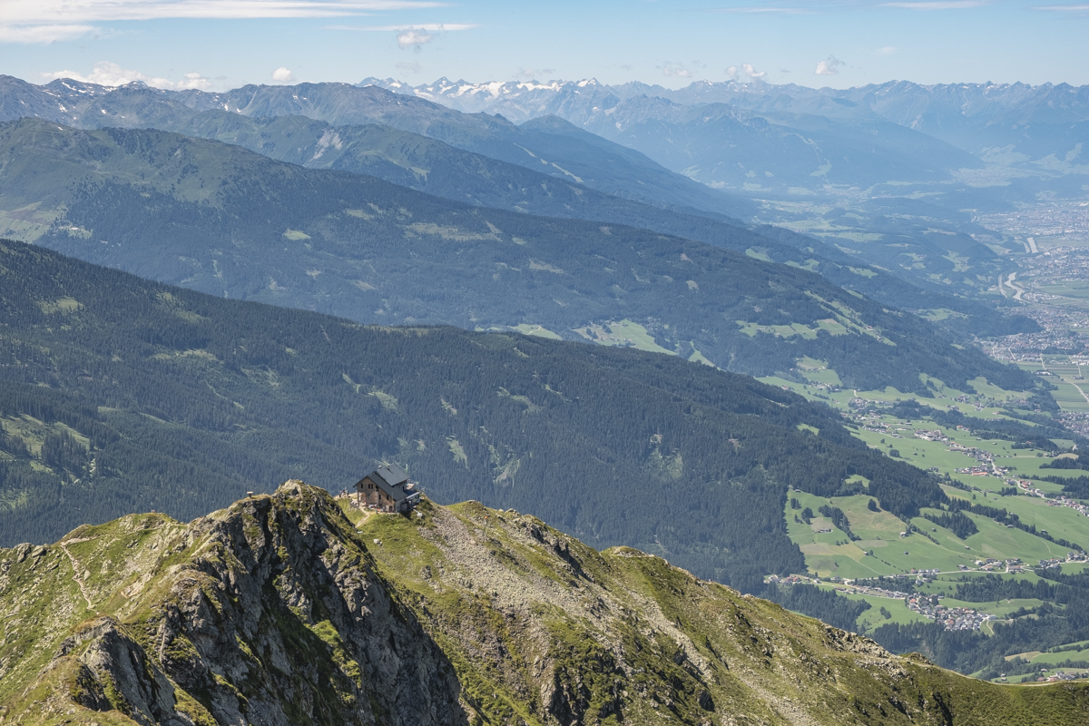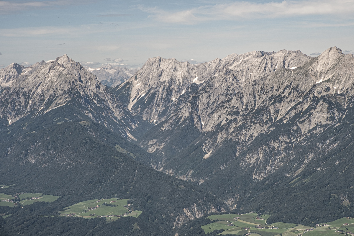 Die ersten 1200Hm erledigt die Spieljochbahn, die restlichen 500Hm machen die Beine. Zuerst steige ich die Straße unter dem Mösllift hinauf. Ich folge den Schildern Alpinsteig. Eine Querung, ein Wechsel in einen anderen Talschluss, Aufstieg und der Wechsel in die dunkle steile Nordseite des Kellerjochs. Die Landschaft ist ja schon weit, die Wechsel verstärken den Eindruck noch. Über den Nordwestgrat zur Gipfelkapelle. Die Aussicht ist berühmt, der Tiefblick ins Inntal, auf Innsbruck, gegenüber ist das Karwendel, im Süden die Zillertaler Alpen.