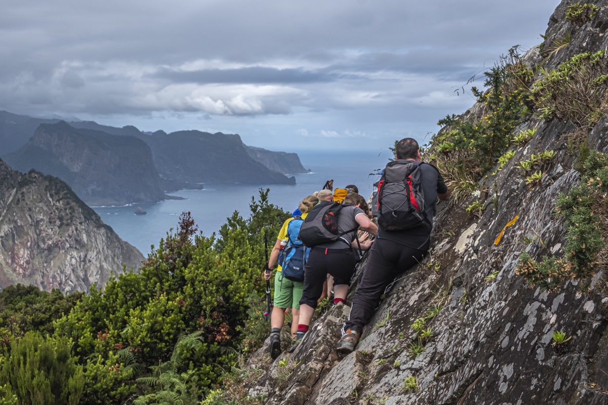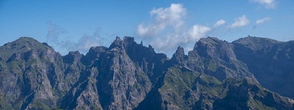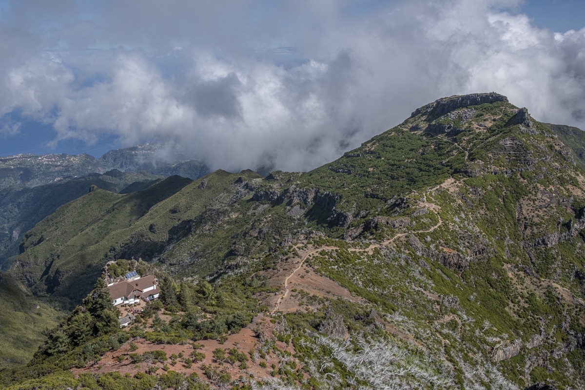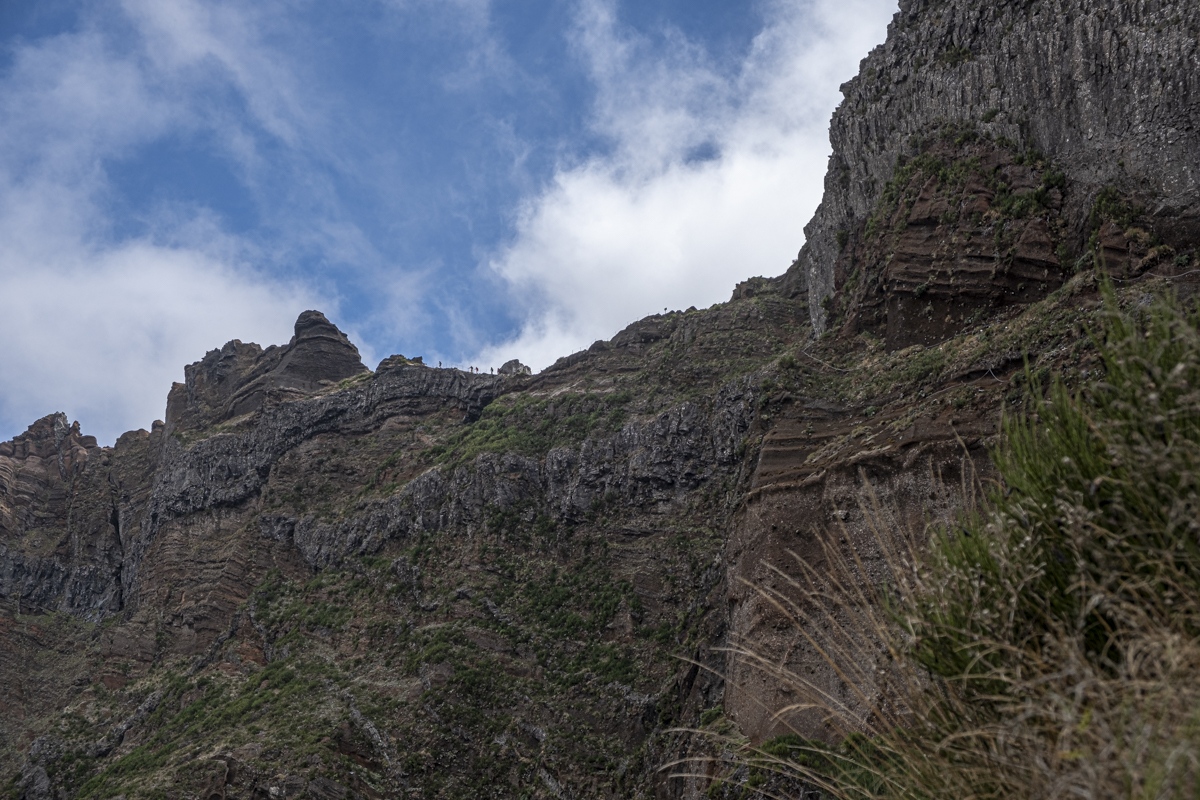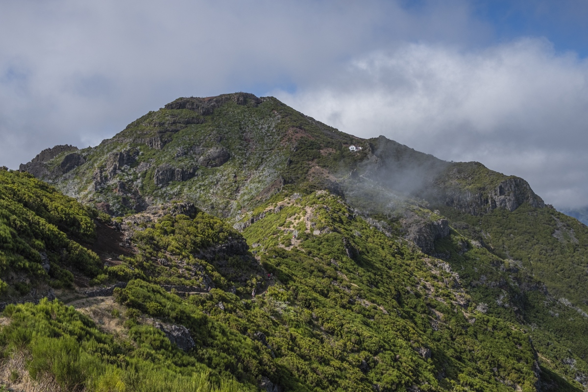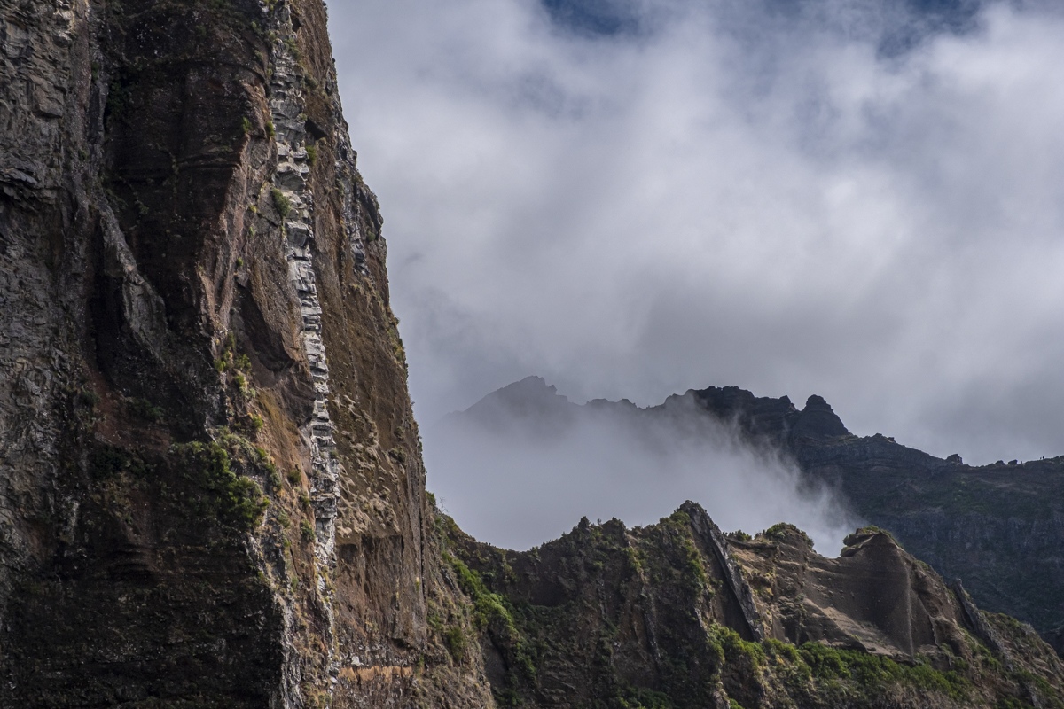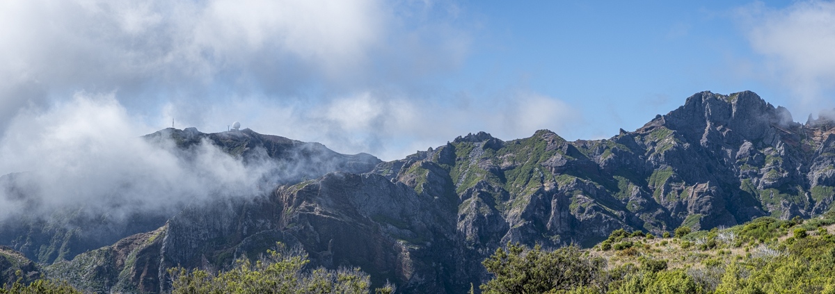 Mit dem Bus hoch nach Queimadas. Zwei Stunden steigen wir auf durch eine Art Regenwald, es ist feucht, der Steig ist glatt, Schmierseife scheint aufgetragen. Wir erreichen den Parkplatz, den Endpunkt der Fahrstraße. Noch eine Stunde auf breitem Weg zum Gipfel des Pico Ruivo 1862m, dem höchsten Berg der Insel. Unterhalb steht eine Hütte, ich ergänze meinen Wasservorrat. Wir sind nicht allein. Nun folgt der Übergang zum Pico Arieiro 1818m, ein landschaftliches Highlight, das seinesgleichen sucht. Der unschwierige Weg (abgesehen von den Stufen, die manchmal so hoch oder tief sind, dass spontan Unwillen ausgedrückt wird) führt durch eine zerklüftete Landschaft, durch kurze Tunnels, an steilsten Flanken entlang, einmal für 100m auf einer 2m breiten Felsrippe – links und rechts geht’s hier senkrecht runter. Als ich auf dem Pico mit der Abhörstation stehe, sind leider Wolken aufgezogen. Der Bus wartet schon und fährt zurück ins Hotel.