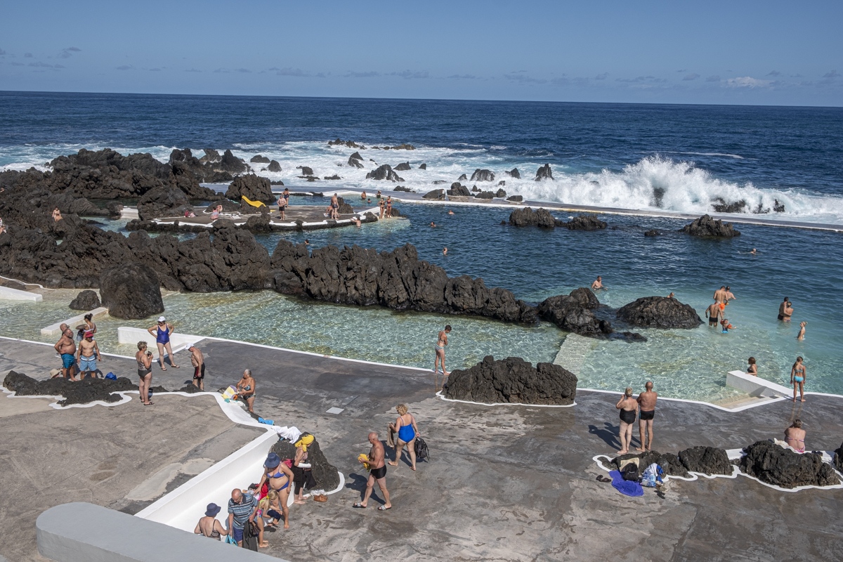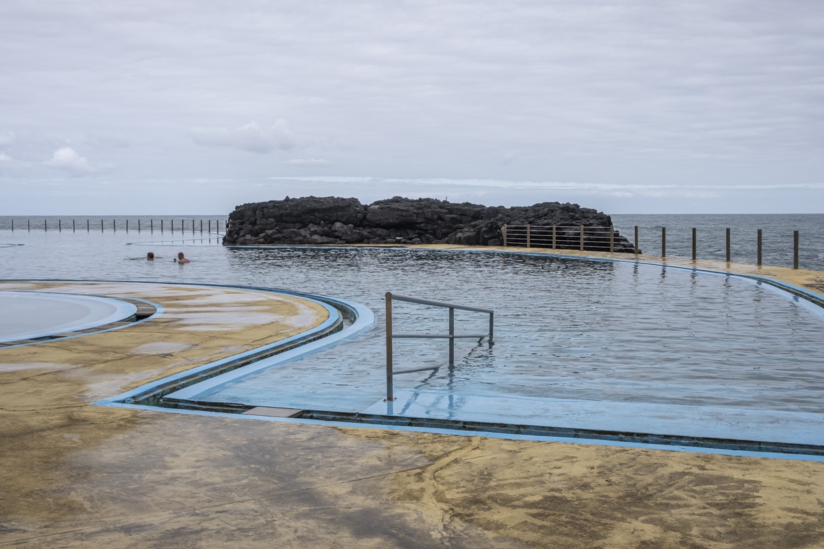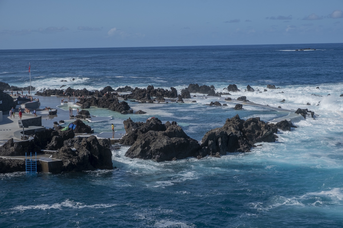 Wir fahren nach Caniçal, vamos. Immer an der Kante entlang, tief unten, weit unten schäumt das Meer. Später queren wir in der Bergflanke und steigen hinunter nach Porto da Cruz. Wir trinken Poncha, essen Lupinenkerne. Die Badehose habe ich im Rucksack, also hinein ins Meeresschwimmbecken.