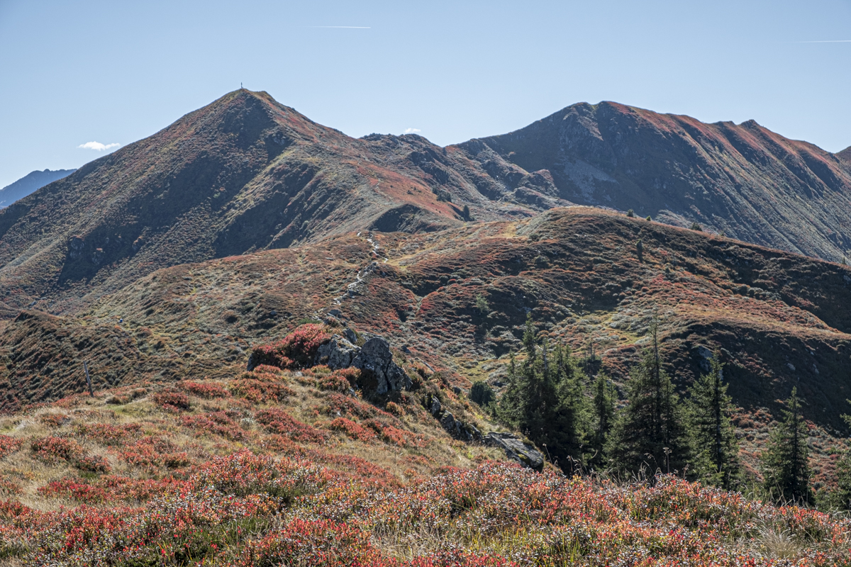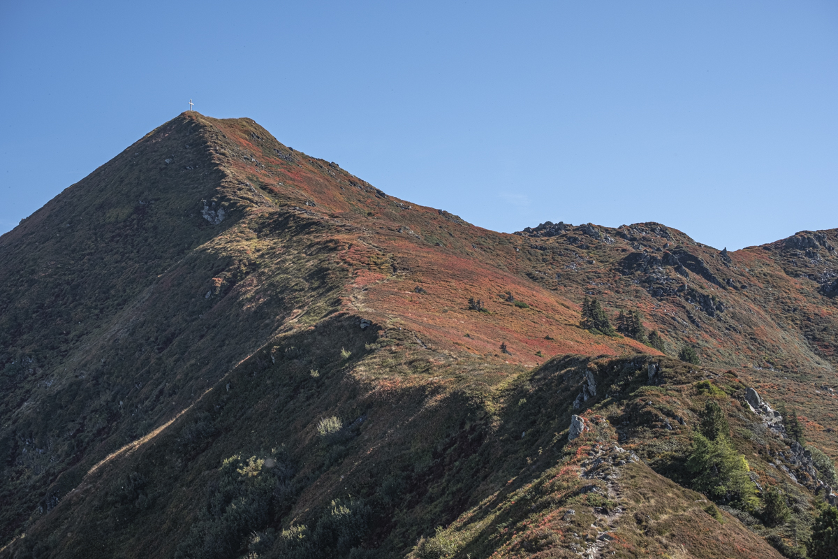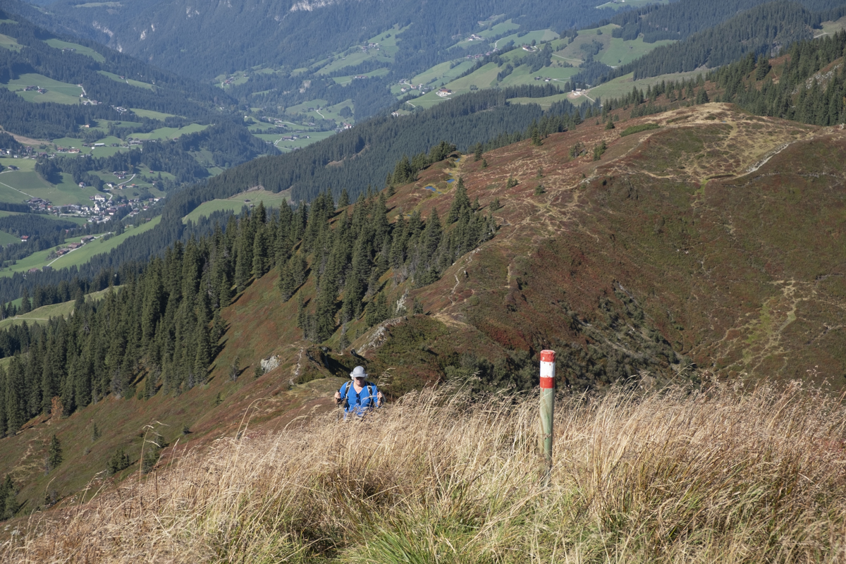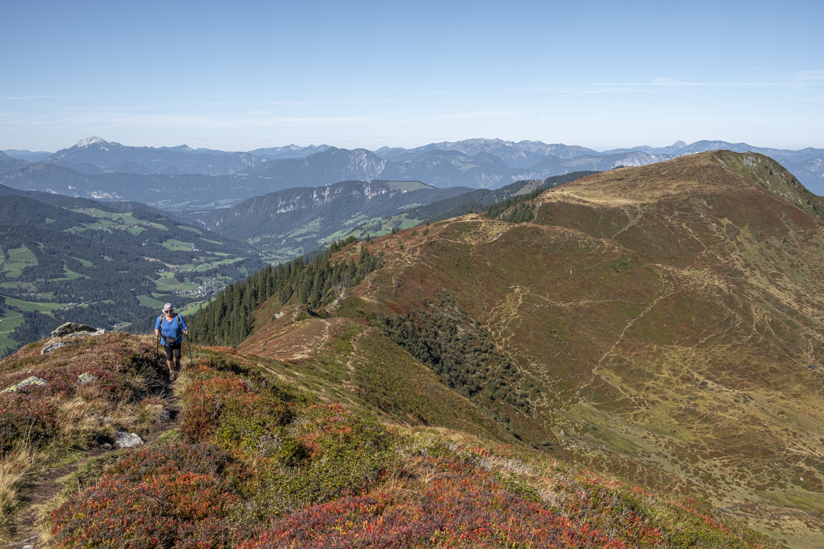 Die Horler Stiege ist von Oberau in der wilden schönen Au (= Wildschönau) aus zu erreichen – auf schmaler langer Straße. Auf dem Kamm gehen wir einige Zeit nach Süden und erreichen schließlich die Wiesen und Weiden unterhalb des Feldalphorns. Hinauf auf dieses und weiter auf dem Kamm und Grat hinüber zum Schweigberghorn. Eine weite Sicht, und die Hänge sind rot.