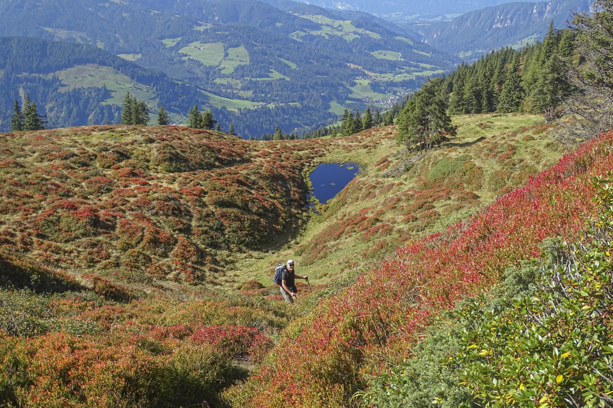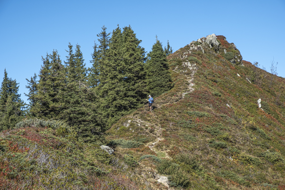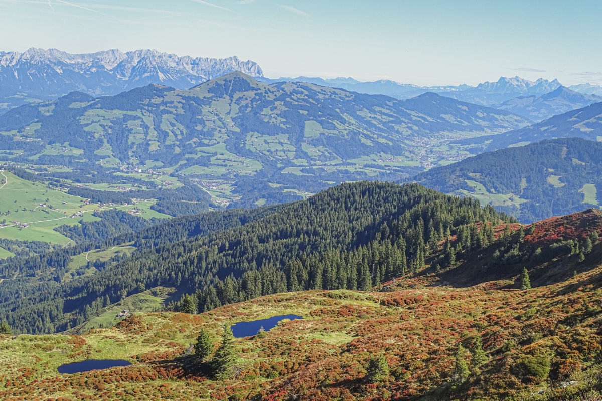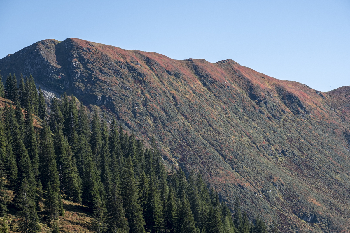 Die Horler Stiege ist von Oberau in der wilden schönen Au (= Wildschönau) aus zu erreichen – auf schmaler langer Straße. Auf dem Kamm gehen wir einige Zeit nach Süden und erreichen schließlich die Wiesen und Weiden unterhalb des Feldalphorns. Hinauf auf dieses und weiter auf dem Kamm und Grat hinüber zum Schweigberghorn. Eine weite Sicht, und die Hänge sind rot.