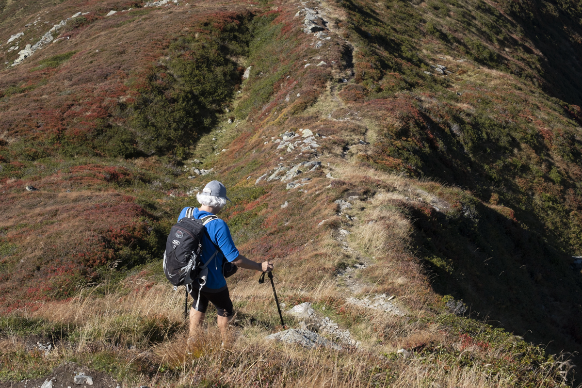 Wieder zurück, bis unterhalb des Feldalphorns ein fast wegloser markierter Steig zur Feldalm abzweigt. Oberhalb der Alm queren wir nach rechts zu dem Wanderweg, der uns zur Vorderen Feldalm führt. Bewirtschaftet. Die Sonne scheint warm. Bleiben wäre schön, die Vernunft siegt und also weiter bis zum Anstiegsweg und auf dem Kamm wieder längere Zeit zurück. Mit Gudrun.