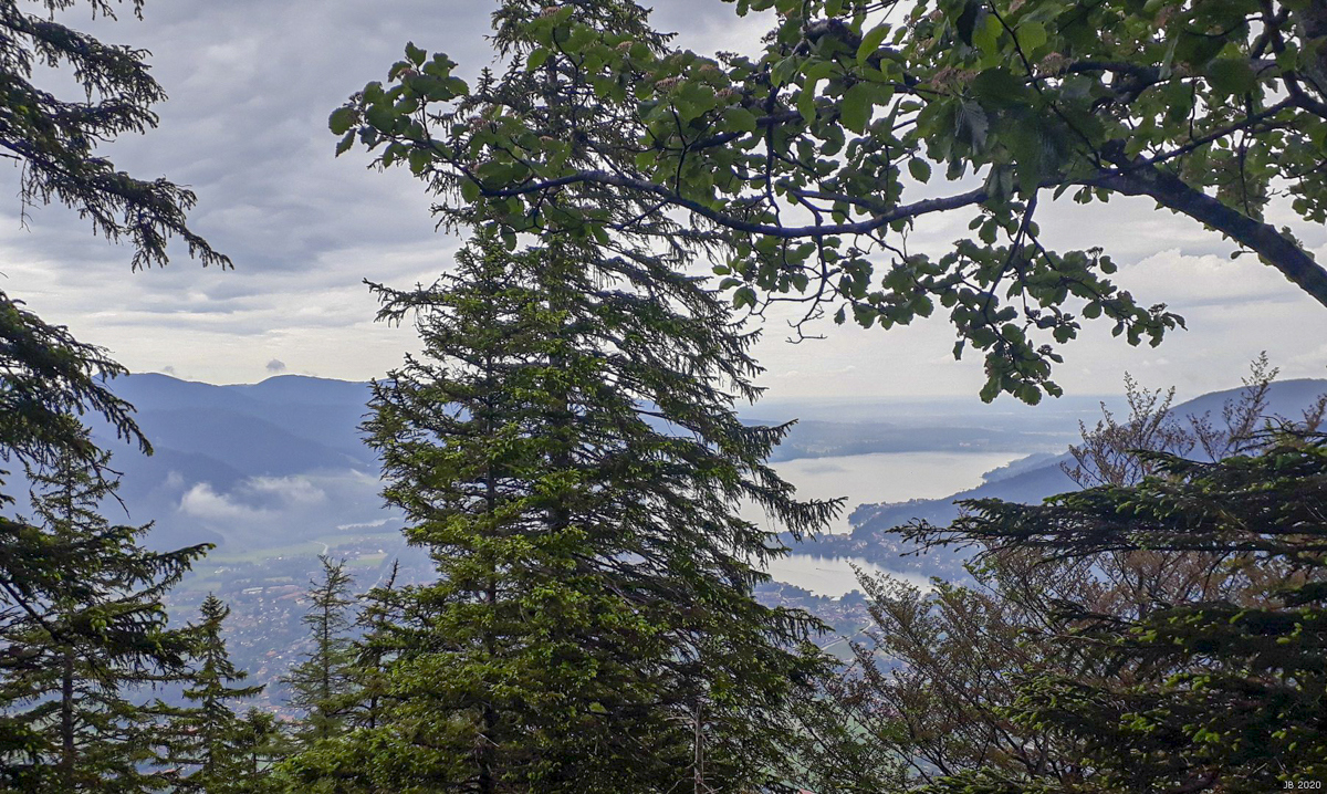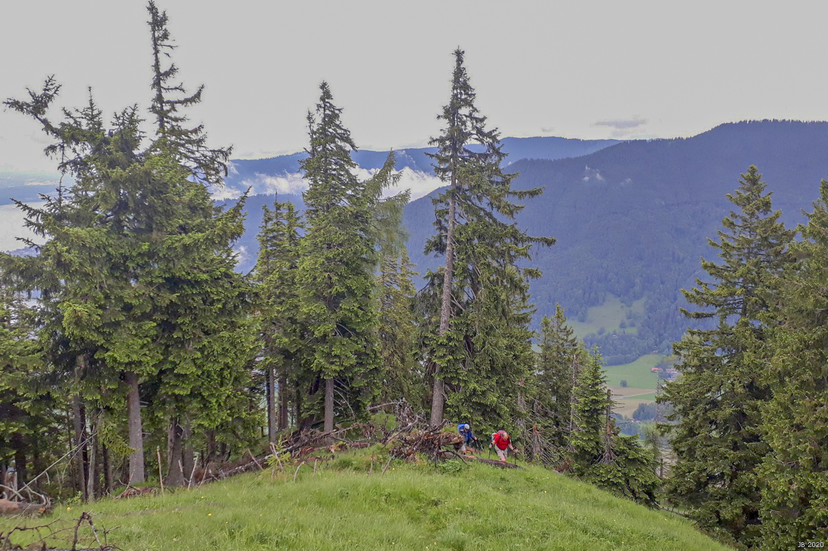 Der Herrscher über den Tegernsee ist das Ziel, zu bezwingen auf einem in keiner Karte verzeichneten Steig. Von der Talstation der Seilbahn queren wir nach Osten auf breitem Weg Richtung Enterrottach. Plötzlich sagt Irene, hier geht’s hoch. Meiner Meinung nach passt die Stelle nicht zur Beschreibung, aber Irene wird recht behalten. Auf (für mich sehr) steilem Steig in der Nordseite des Wallbergs hinauf. Rechts ist die Bärenwand. Und es fängt an zu regnen. Zwei Drittel des Anstiegs verlaufen im Wald mit entsprechender Aussicht, das letze Drittel bietet nette Blicke nach Osten. Und jetzt auch keine Bewässerung mehr von oben.