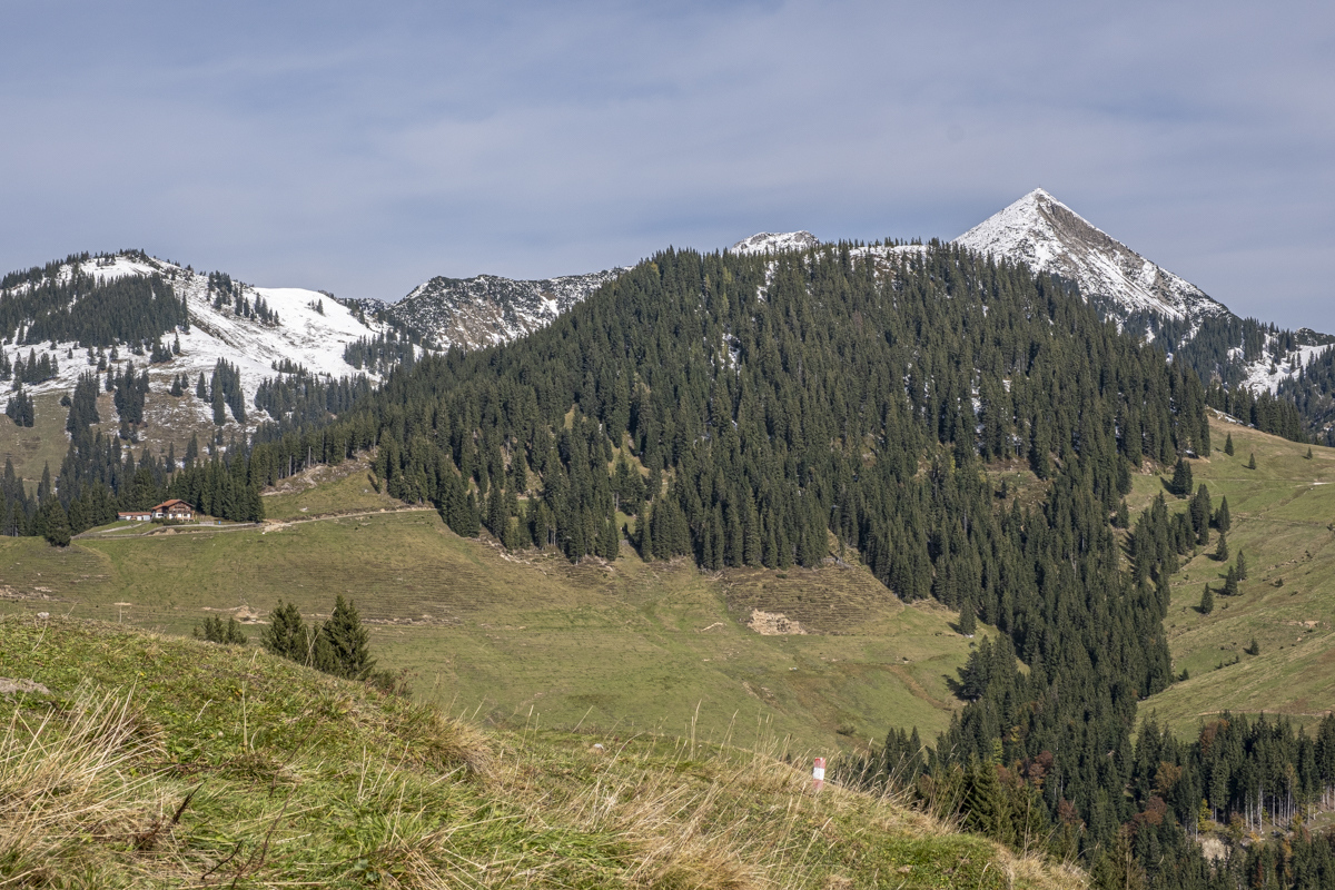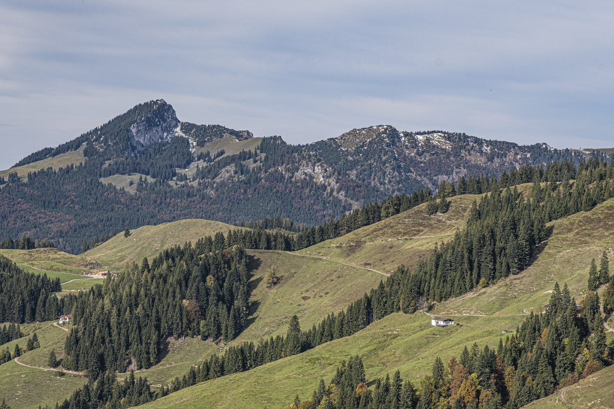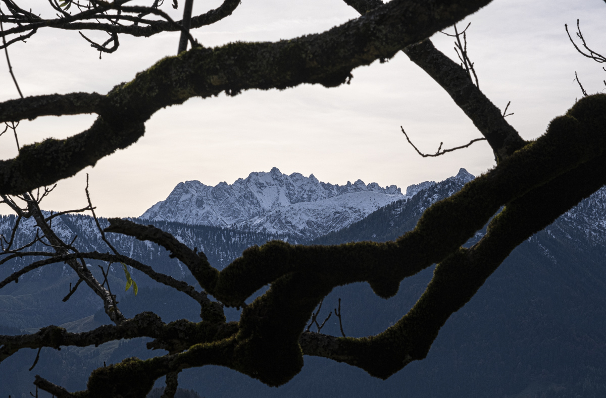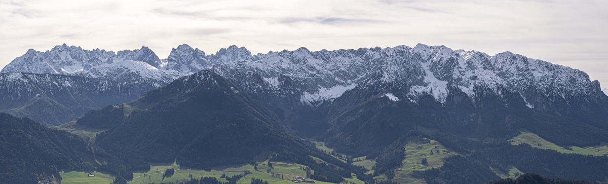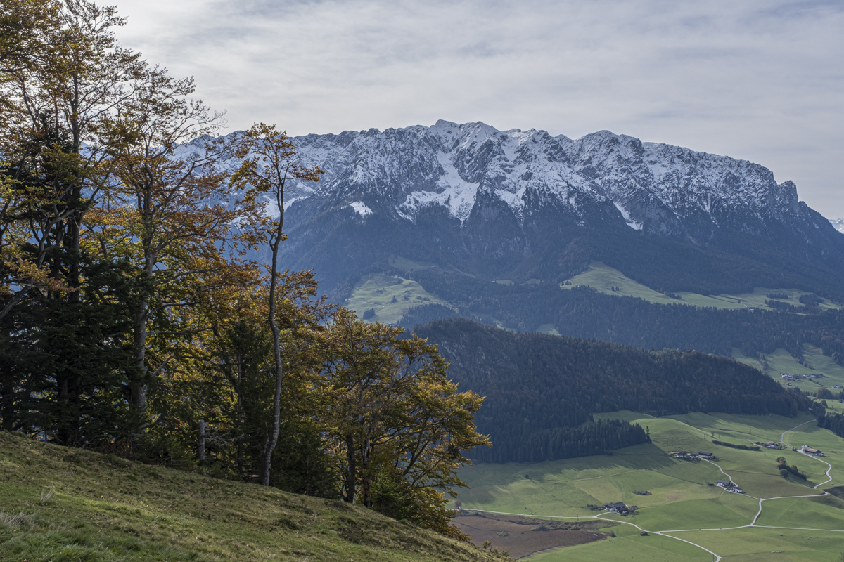 Von Walchsee zum Parkplatz am Moorturm. Der Waldgürtel muss zuerst durchstiegen werden, er endet unterhalb der Hitscheralm, bevor der lange, breite, weite, freie Rücken beginnt, der sich bis zum Brennkopf hochzieht. Beim Aufstieg stehe ich unter ständiger Beobachtung durch Zahmen und Wilden Kaiser.