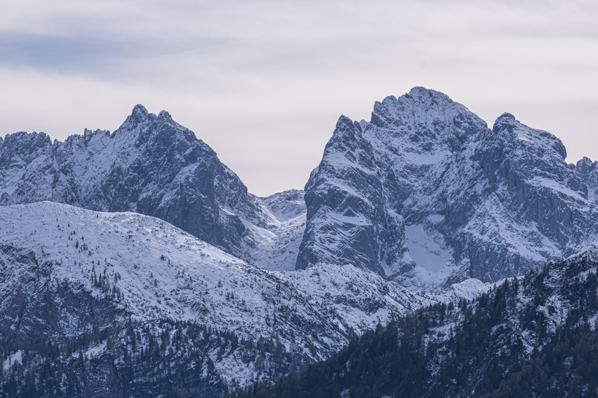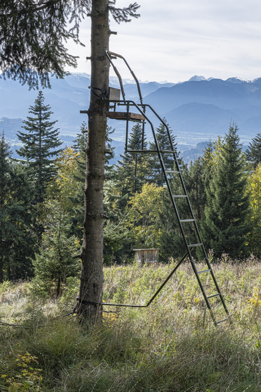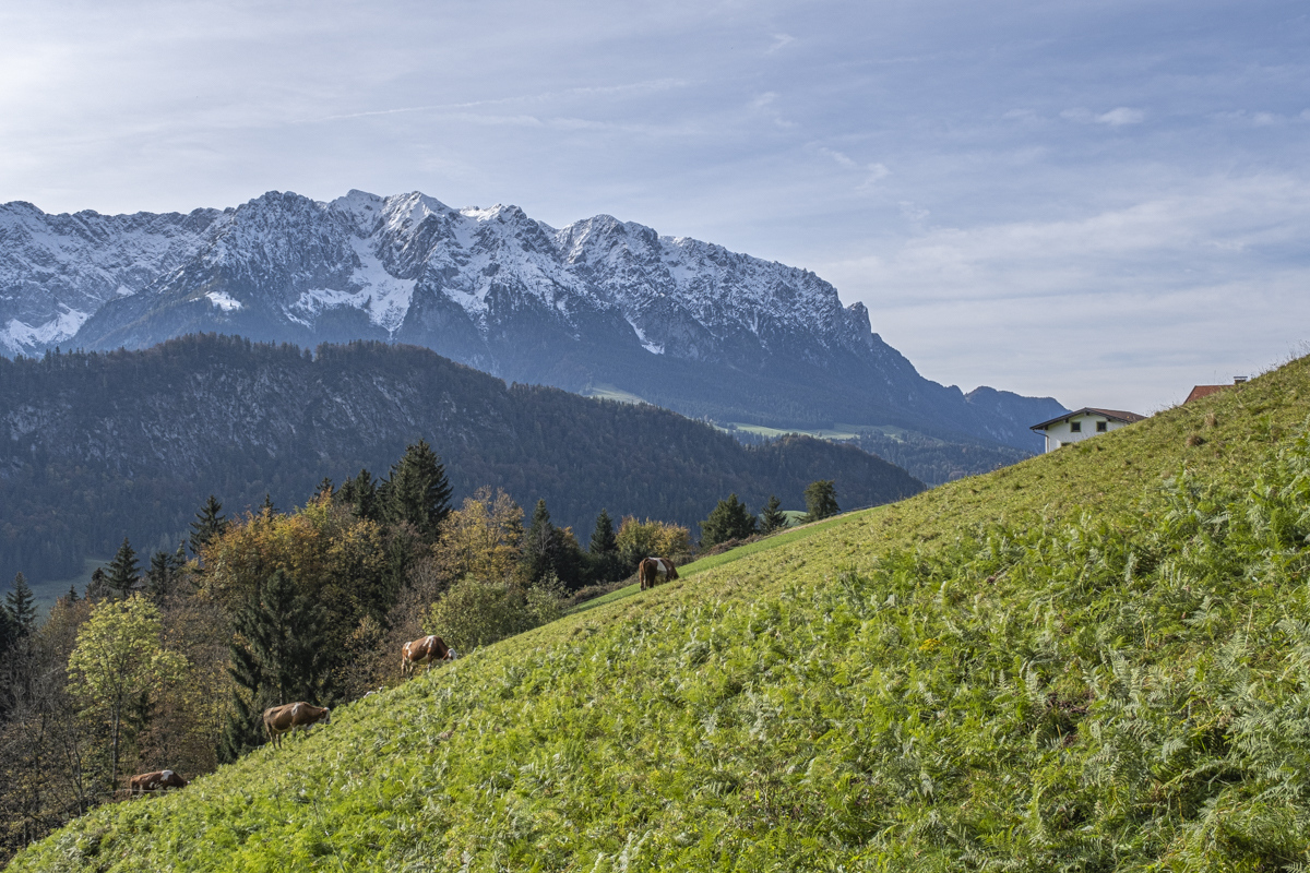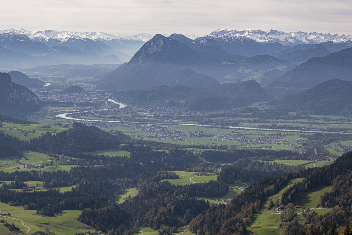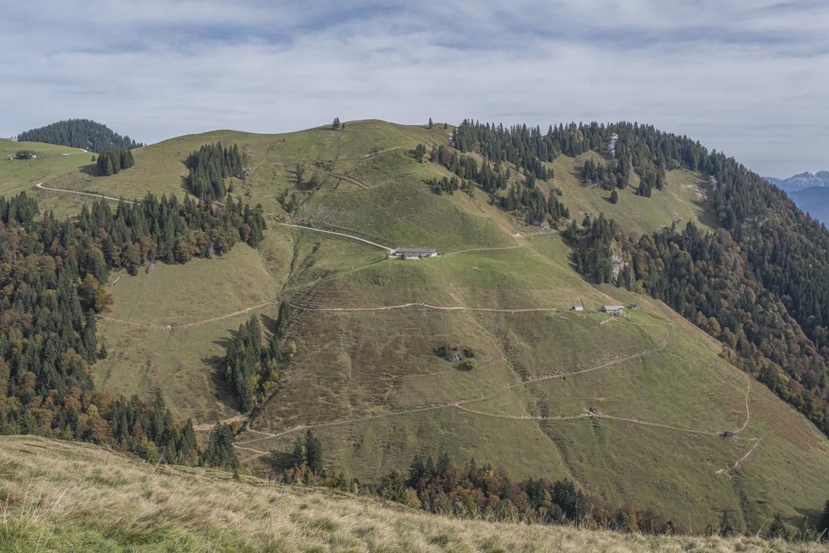 Von Walchsee zum Parkplatz am Moorturm. Der Waldgürtel muss zuerst durchstiegen werden, er endet unterhalb der Hitscheralm, bevor der lange, breite, weite, freie Rücken beginnt, der sich bis zum Brennkopf hochzieht. Beim Aufstieg stehe ich unter ständiger Beobachtung durch Zahmen und Wilden Kaiser.