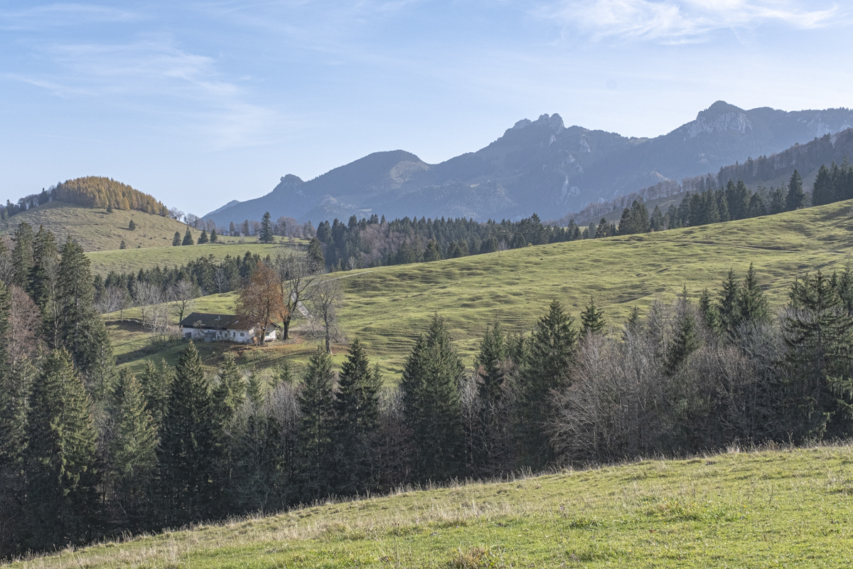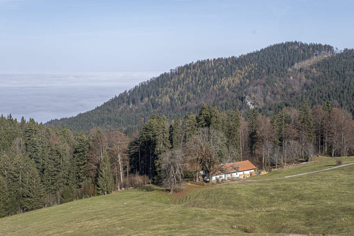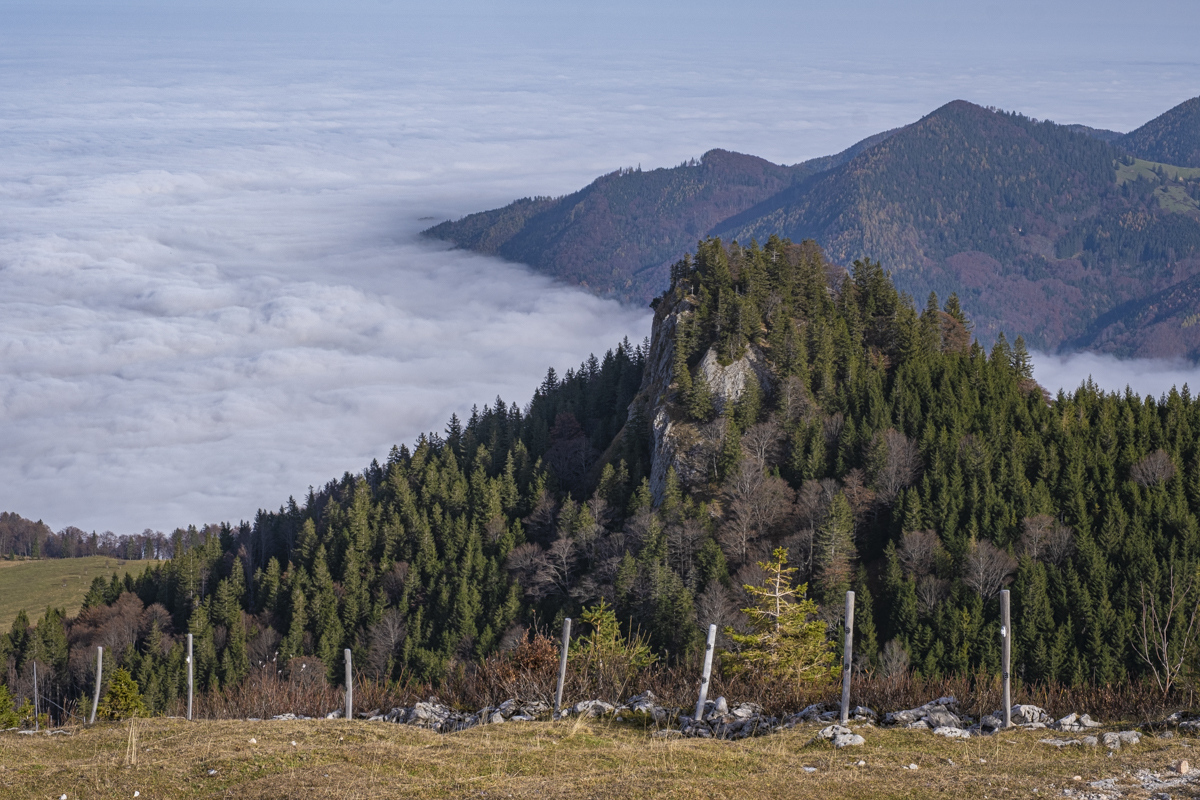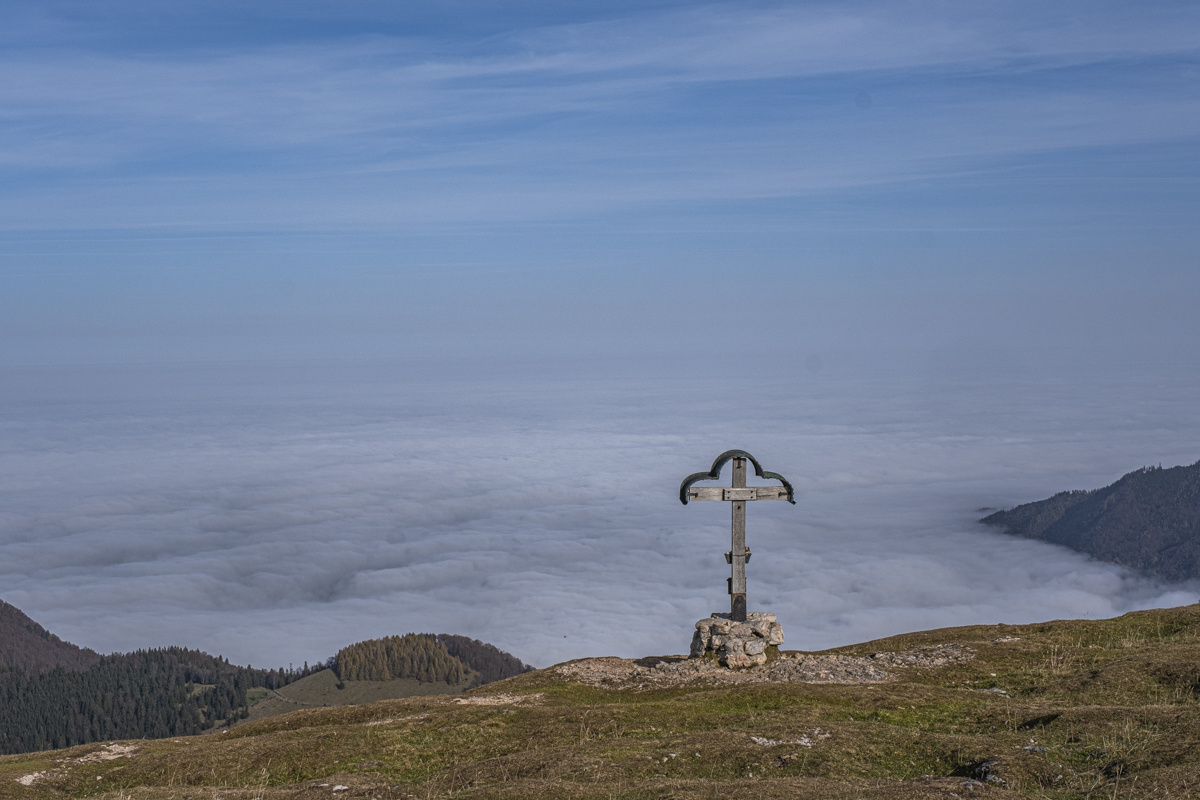 Start ist am Wanderparkplatz Soilach südlich von Frasdorf. Auf der Forststraße geht es zum im Winter geschlossenen Bauernhof Winterstube und weiter auf einem Steig, gelegentlich unterbrochen von einer Straße, zu den Laubensteinalmen und zum buckeligen Laubenstein-Gipfel. Leider ist der Chiemsee unter einer Wolkendecke begraben. Wegloser Abstieg nach Süden zu einem nicht markierten Steig, der unter dem Hammerstein talauswärts führt. Eine kurze Passage auf einer Straße, und der Steig setzt sich fort. Von plötzlich nach links unten führenden Spuren lasse ich mich irritieren und folge ihnen. Ein Blick auf den GPS Track hätte mich eines Besseren belehrt. Ein batziges Steilstück im Wald fördert nun Trittsicherheit und Konzentration. Ich erreiche eine Forststraße, gehe nach rechts und später an der natürlich geschlossenen Frasdorfer Hütte vorbei und weiter zur Winterstube und weiter …