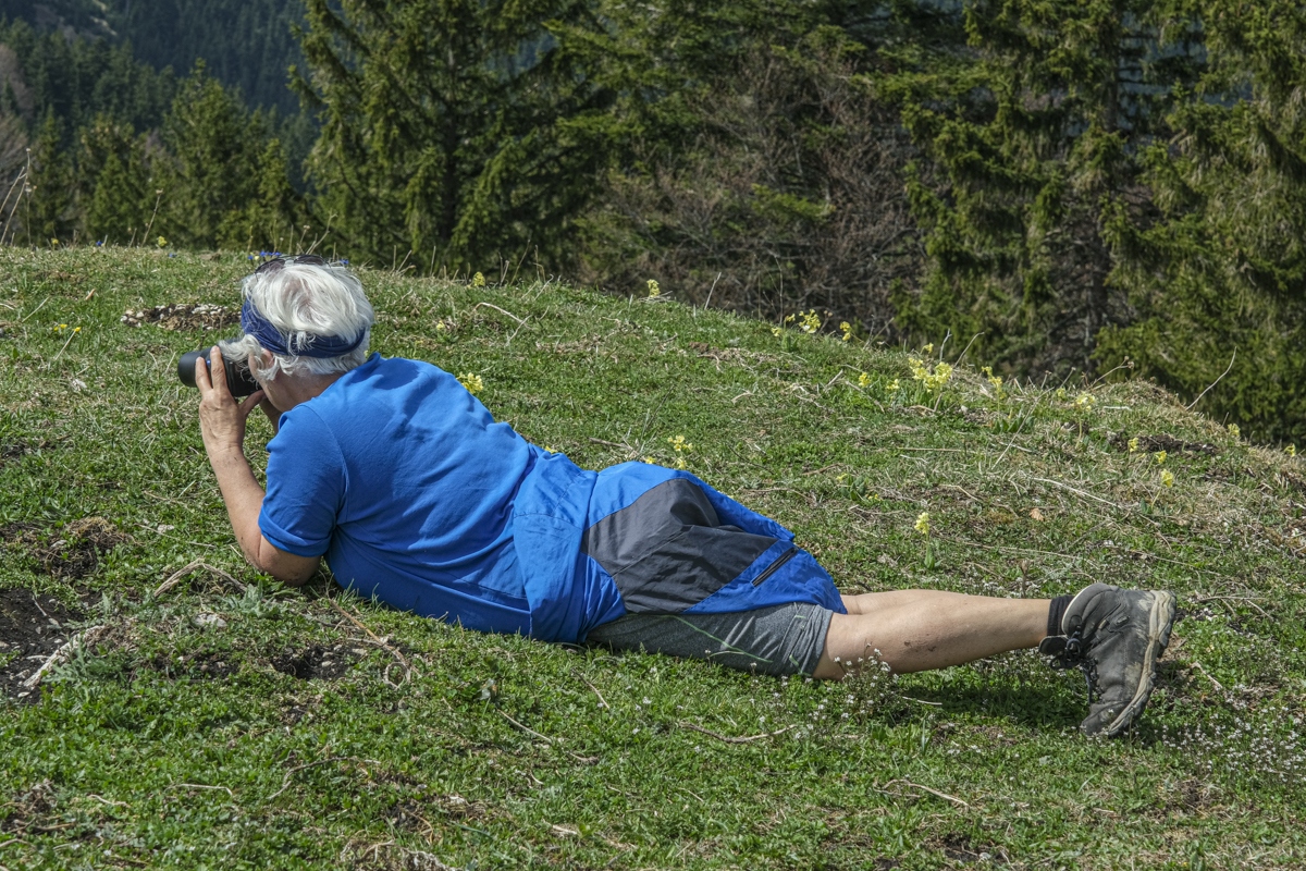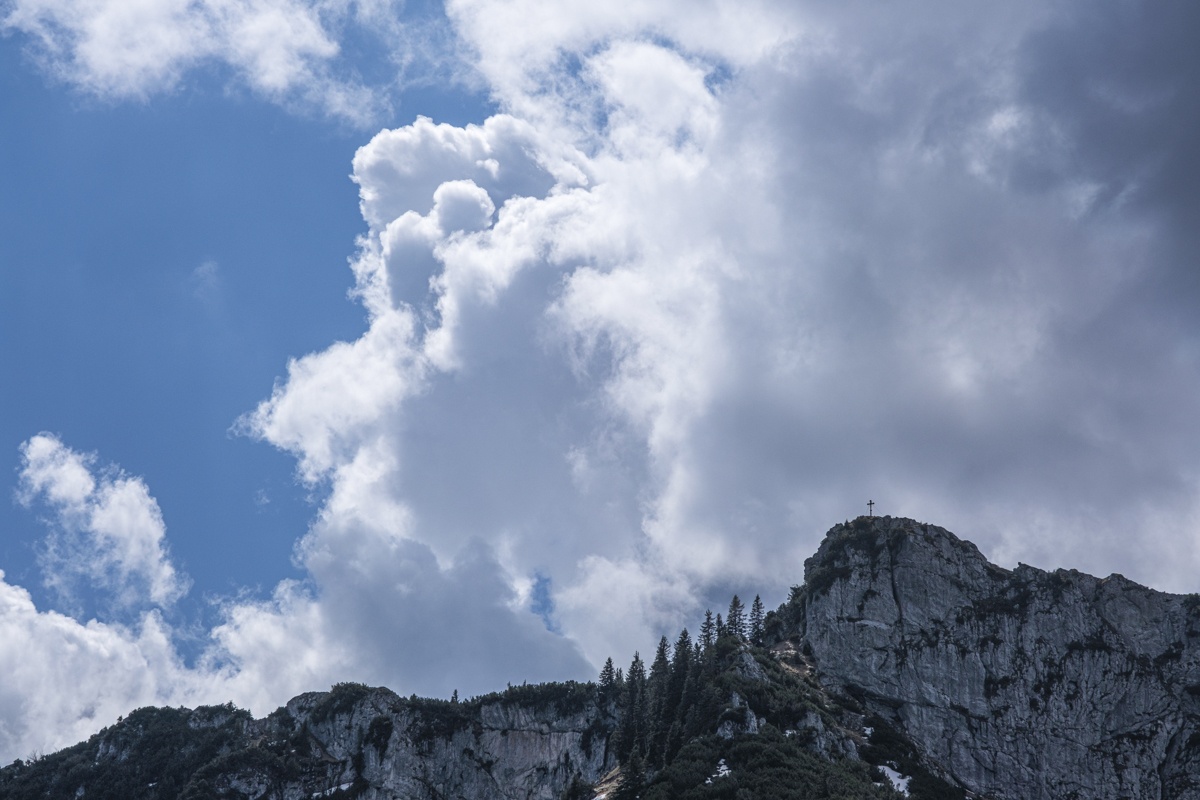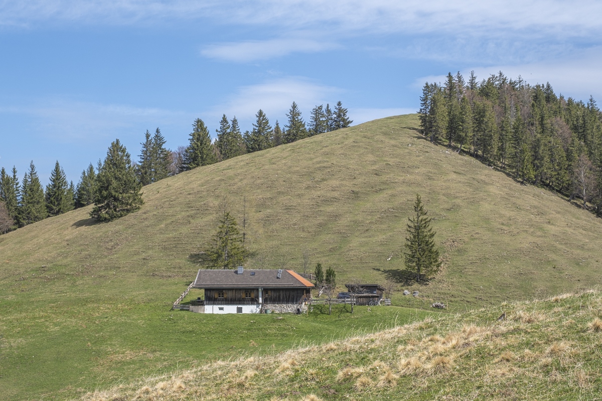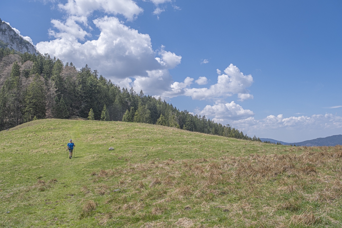 Das Winklstüberl ist verwaist. Über die Weiden – viele Blümchen – und durch Wald geht es hinauf. Unterhalb der Bucheralm weiter nach Osten, durch den Felssturz hindurch zur Steingrabenalm und auf den Grasbuckel des Eibelkopfs.
