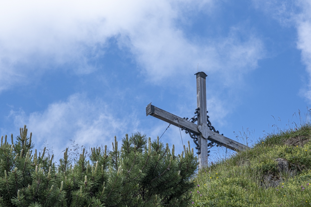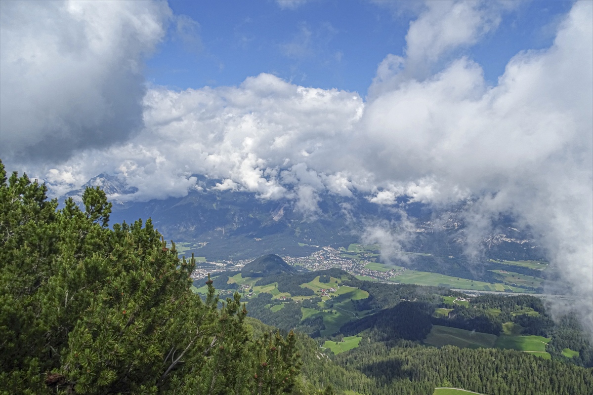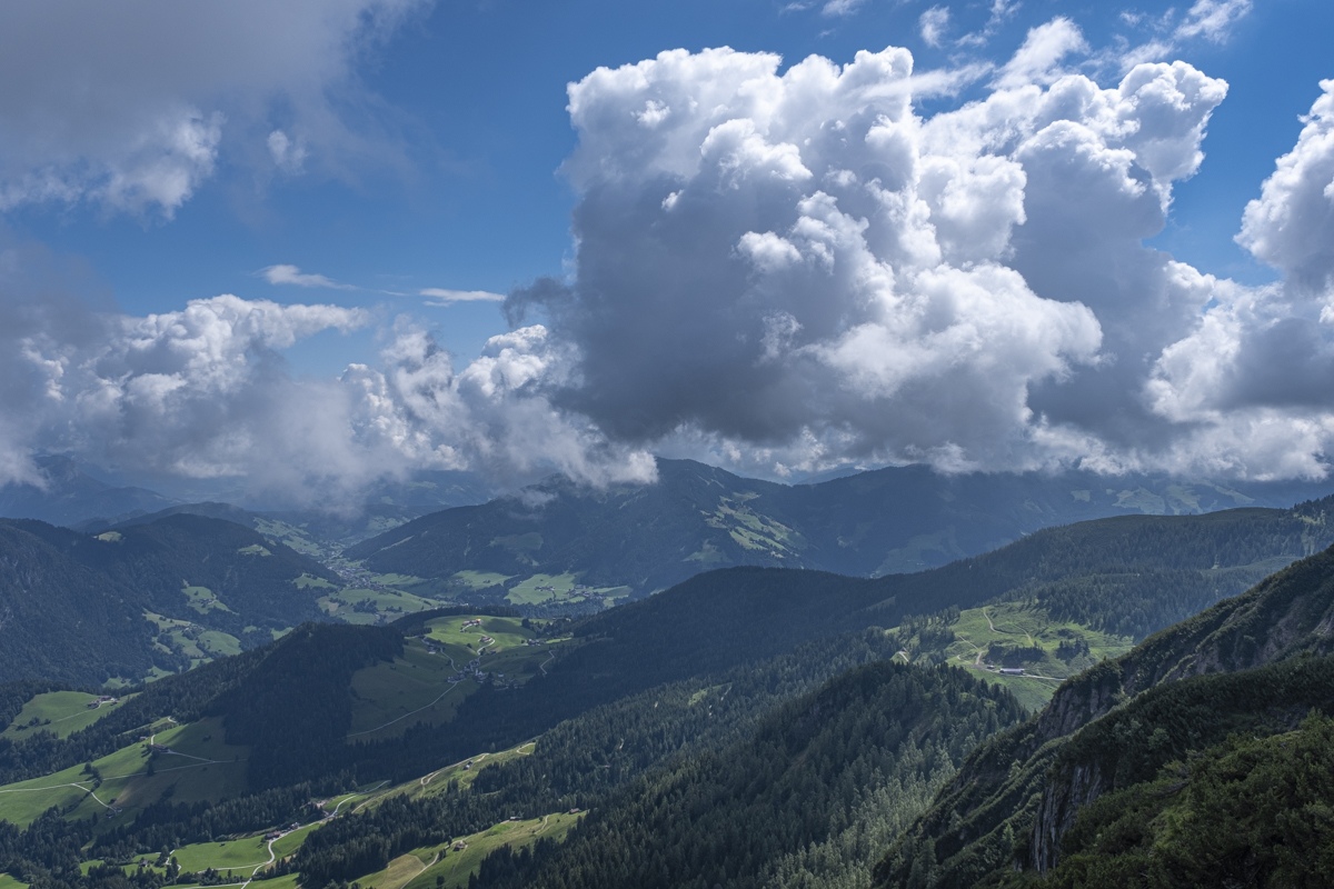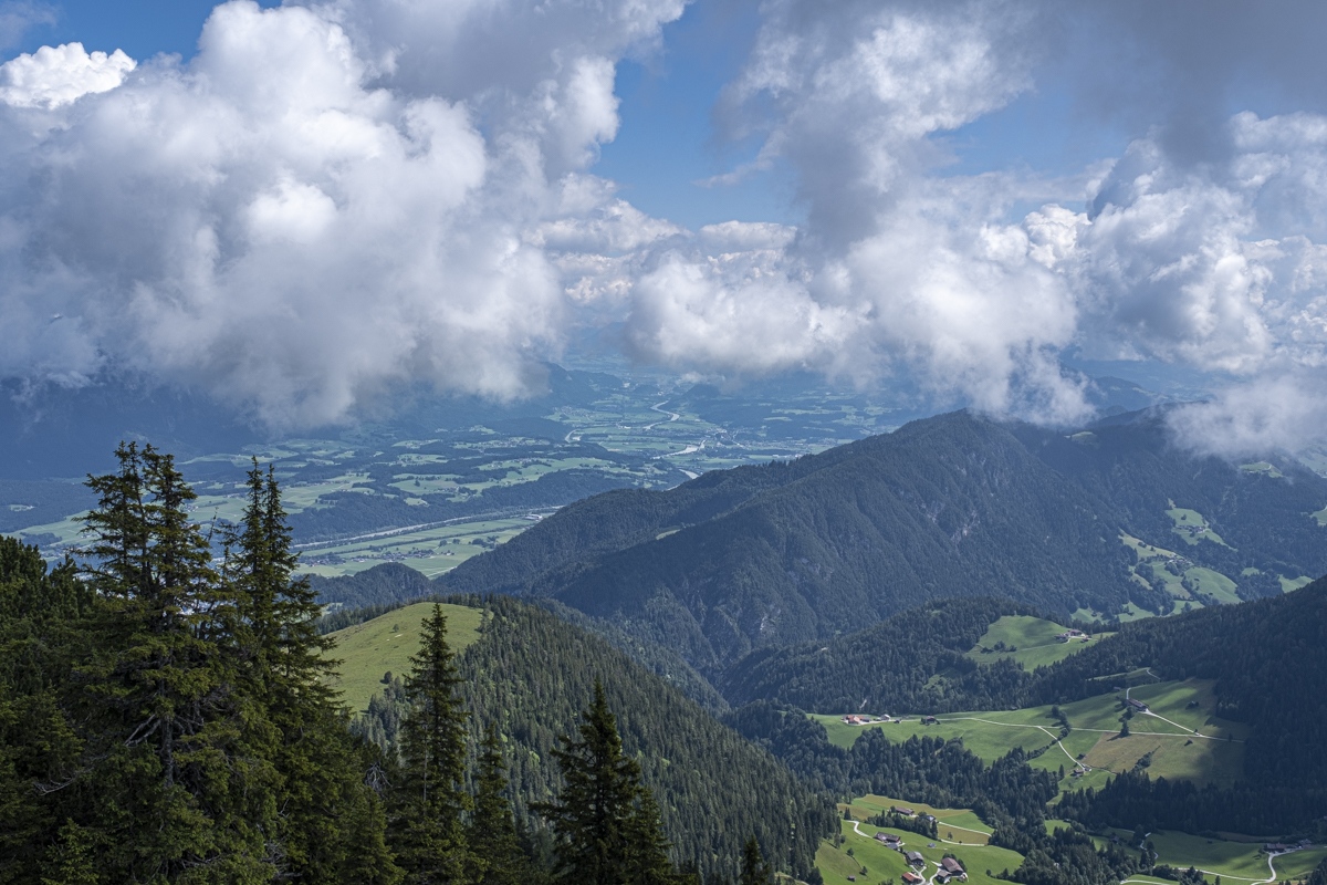 Von Brixlegg nach Zimmermoos und auf schmaler Piste zum Parkplatz unterhalb der abgelegenen Holzalm. Wir nehmen (selbstverständlich) den direkten Weg zum Gipfel. Wolken und ein wenig blauer Himmel, und es ist kalt. Die wabernden Wolken scheinen die Weite der Aussicht noch zu verstärken.