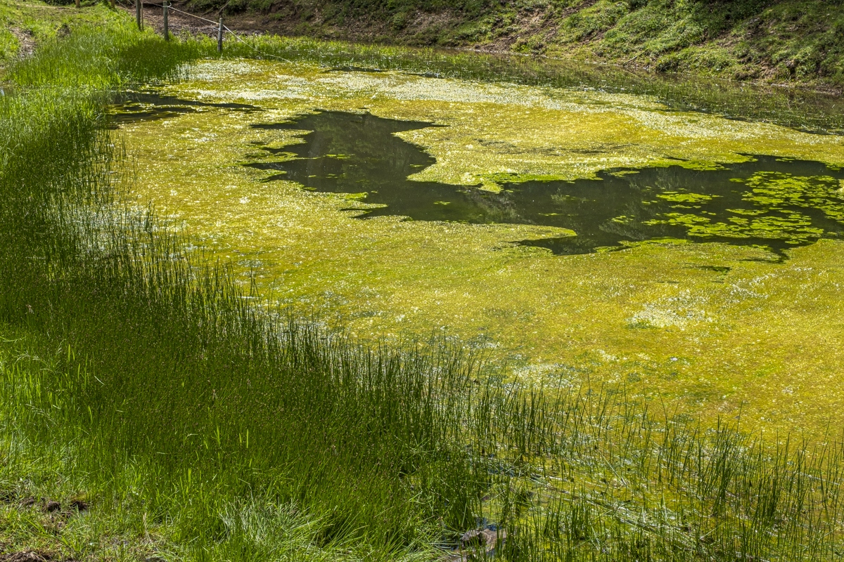 Beim Abstieg geht’s erst noch zweimal rauf, bevor wir das Hösljoch mit Tümpel erreichen. Der Tümpel liegt tiefer als unser Ausgangspunkt, also Gegenanstieg, der an dem ehemaligen Kupfer-Abbau vorbeiführt. Grünspan-Steine.