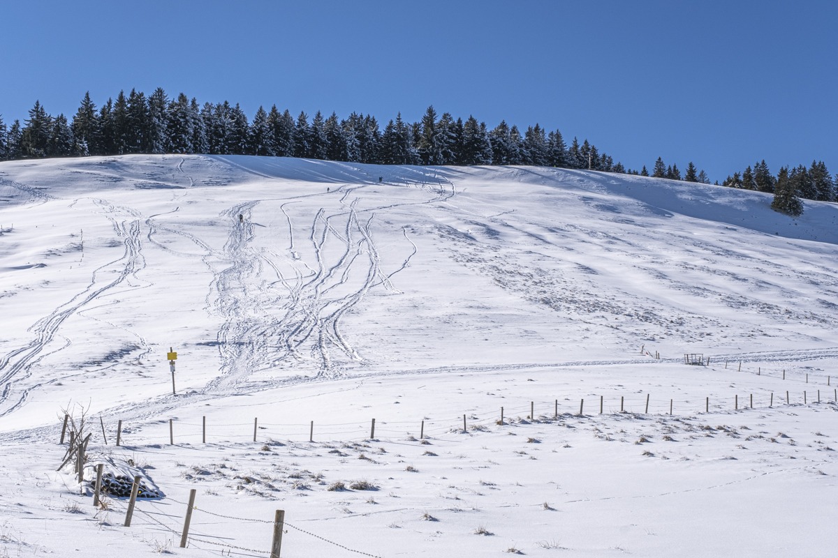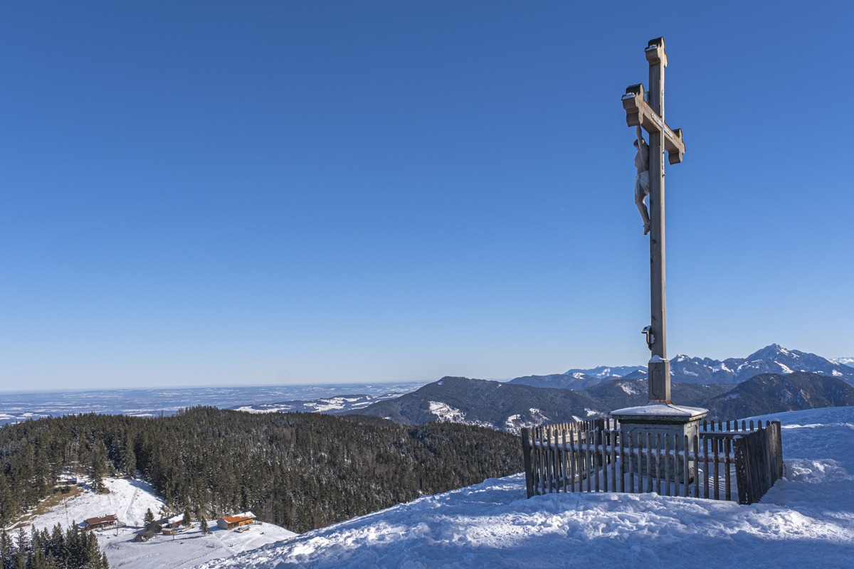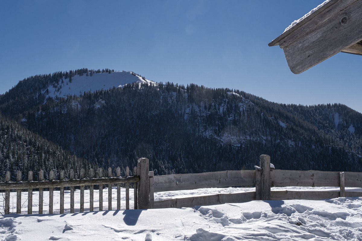 Wir fahren in die Hennerer Au am Nordende des Schliersees. Auf der Almstraße zur Gindelalm und weiter direkt hinauf zum Gipfelkreuz der Gindelalmschneid. Eine richtige Winterlandschaft, vor zwei Jahren hatte ich zum letzten Mal einen umfassenden Kontakt mit dem weißen Element. Und zapfig kalt ist es jetzt auch – perfekt (na ja fast, hoffentlich klappt’s noch mit Skifahren in diesem Winter). Die Aussicht ist hinlänglich bekannt, nach Norden alles, nach Süden Bäume. Hinunter und hinüber zur 300 Jahre alten Kreuzbergalm. Sonnen-Pause. Auf dem Prinzenweg gehen wir zum Bach hinunter und an ihm entlang talauswärts zum Hennerer. Mit Gudrun.