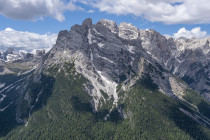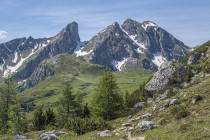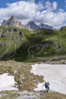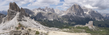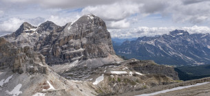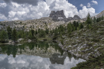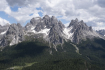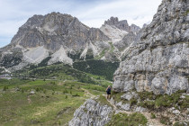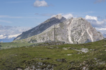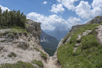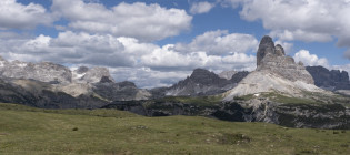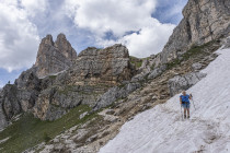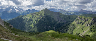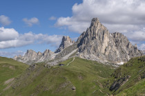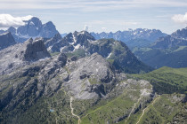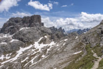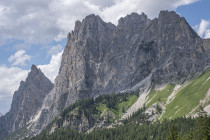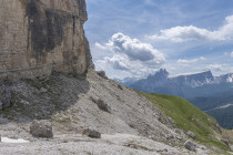 Für die Croda Negra 2518m starten wir vom Passo Falzarego. Ein Felsrücken mit steil und senkrecht abfallenden Flanken. Ein schmaler Felsspalt vermittelt den Durchstieg auf den Rücken. Heute lässt sich auch die umgebende Landschaft genießen, hohe Berge, grüne Wiesen mit vielen Blumen und Cumulus-Wolken, die mit der Größe der Berge mithalten wollen. Am Lago Limores wird noch einmal gerastet.