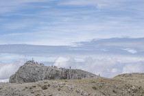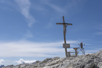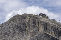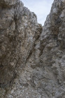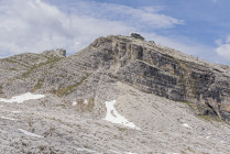 Die Zeit ist reif für den Klettersteig auf den Monte Nuvolau 2574m. Es gibt zwei Passagen, unterbrochen durch einen Gang über Karrenfelder, die erste ist eine kaminartige Rampe, und die zweite führt kurz und ausgesetzt über den Grat sozusagen direkt in die Gaststube des Rifugio Nuvolau. Hier gilt also die Gleichung Hütte = Gipfelkreuz. Abstieg über den Normalweg zum Rifugio Averau mit Liften und Pisten, und dann ein direkter heikler Abstieg zum Hauptweg hinüber zum Passo Giau.