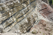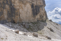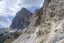 Der Astaldi-Klettersteig am Fuße der Tofana verläuft horizontal und ist bunt aufgrund verschiedener Gesteinsschichten. Es ist spannend, angeblich sind die Sicherungen unzuverlässig, was aber nicht stimmt, und es ist heiß. Wir schaffen es, na klar, und gehen zurück zum Rifugio Ivona Dibona.