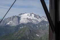 Oder auch nicht. Über Nacht wird mein rechtes Knie dick, eine Tour ist unmöglich, aber das Benutzen einer Seilbahn ist auf jeden Fall möglich. Die Funivia Lagazuoi trägt uns hoch, und ich humpele auf den Kleinen Lagazuoi 2778m. Hier bleiben wir sitzen, noch sind wenig Leute da, es ist still und die Luft klar vom nächtlichen Regen. Zuerst schauen wir auf die Marmolata und die Sellagruppe, dann auf den Großen L. und die Tofana, dann auf die Cinque Terre und Croda Negra. Nach mehreren Umdrehungen steigen wir ab und fahren hinunter.