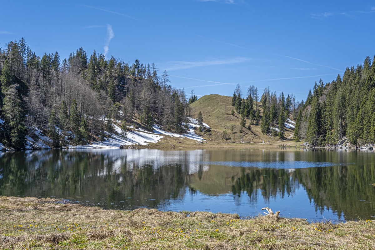 Der Gipfel ist heute ein See. Wir fahren nach Hinterwössen zum Wanderparkplatz. Auf steiler Straße neben dem Schlierbach hinauf und weiter, bis links der Luftbodensteig abzweigt. Vom Sattel noch kurz hinunter zum See, und hier geht’s rund. Die Kröten – so ist der optische und akustische Eindruck – sind definitiv nicht am Aussterben. Wir schauen zu, und machen noch den Abstecher zur Taubenseehütte mit ihrem Panoramablick. Die Hütte ist natürlich geschlossen. Über den Kroatensteig zur Chiemhauser Alm. Schöne Weidewiesen folgen, und dann auf ätzend langer Straße zum Parkplatz. Mit Gudrun.