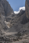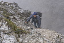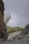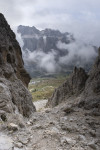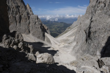 In Wolkenstein steigen wir ein in eine Dantercepies-Gondel. In einer steilen Rinne hinauf zu dem Drahtseil, dann wieder felsiges Gelände. Etwa 15min unterhalb der Großen Cirspitze 2592m kehren wir um, zum Glück, denn kurze Zeit später fängt es an zu hageln.