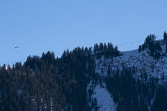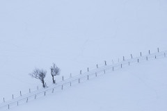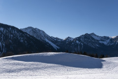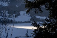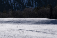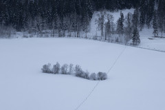 Eine Hochebene oberhalb von Bayrischzell ist das Ziel. Wir parken am Bahnhof, gehen die Kranzerstraße hoch und weiter zum Wasserfall mit den drei Gumpen. Über die Brücke, dann kurz die Bundesstraße tangierend und hinüber zur Peterbauernalm. Und schon empfangen uns die weiten weißen Wiesen von Hochkreuth. Die Infrastruktur ist allerdings geschlossen, macht nix. Die Sonne scheint warm, wir verweilen. Auf der Fahrstraße Richtung Seilbahn hinab, bis links an Abzweig in derselben Richtung weiterführt. Bei den Höfen mit den Highland Cattles eine Drehung um 180 Grad und über den Aussichtspunkt Nogg zurück zur Kranzerstraße. Eine nette Runde für die laublose Zeit. Mit Gudrun.