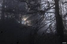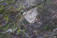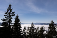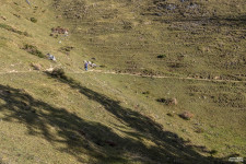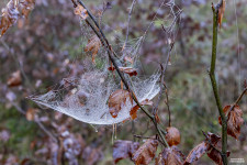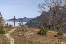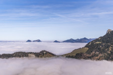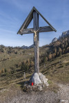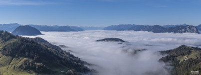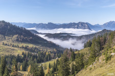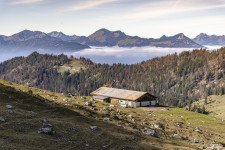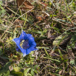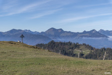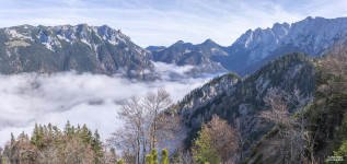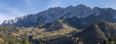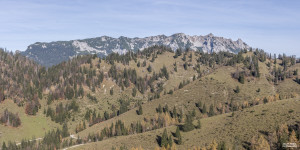 Der Gamskogel ist eine unscheinbare Erhebung am nördlichen Rand des weiten Rundes um die Kaindlhütte mit den grauen Wänden des Wilden Kaiser als Hintergrund. Bekannt ist er für die üppige Christrosenblüte im Frühjahr. Wir fahren unter Hochnebel nach Kufstein und nutzen den letzten Tag des Kaiserlifts. Der Gipfel des Gamskogels ist schnell erreicht, die Sonne hat inzwischen den Nebel vertrieben. Das schräge Sonnenlicht bringt die taunassen Spinnennetze zum Leuchten. Der eigentliche Höhepunkt der Tour ist das Auslaufen des weiten Talkessels. Noch vor der Kaindlhütte steigen wir weglos rechts hinab über Wiesen bis zu einer Straße, die in eine andere Straße mündet, die steil hinauf zur Bergstation führt. Mit Gudrun.