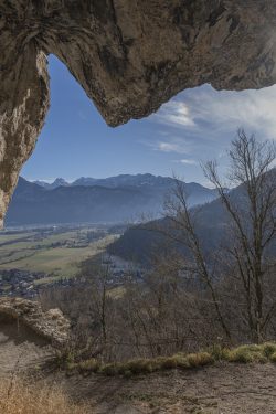 Das Grafenloch oberhalb des Luegsteinsees bei Oberaudorf ist jetzt mehr eine Öffnung in der Felswand als eine Höhle. Ein idyllisches Plätzchen mit Blick auf das Kaisergebirge. Wir sehen auch das eigenartige, an der Felswand klebende und nicht mehr in Betrieb befindliche Wirt(h)shaus Weber an der Wand. Mit Gudrun.
