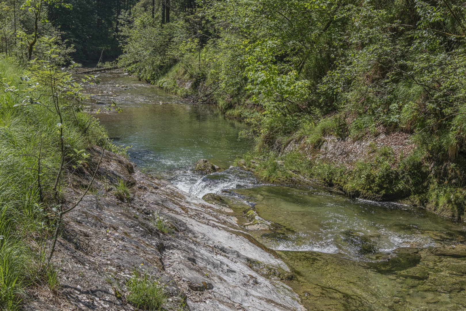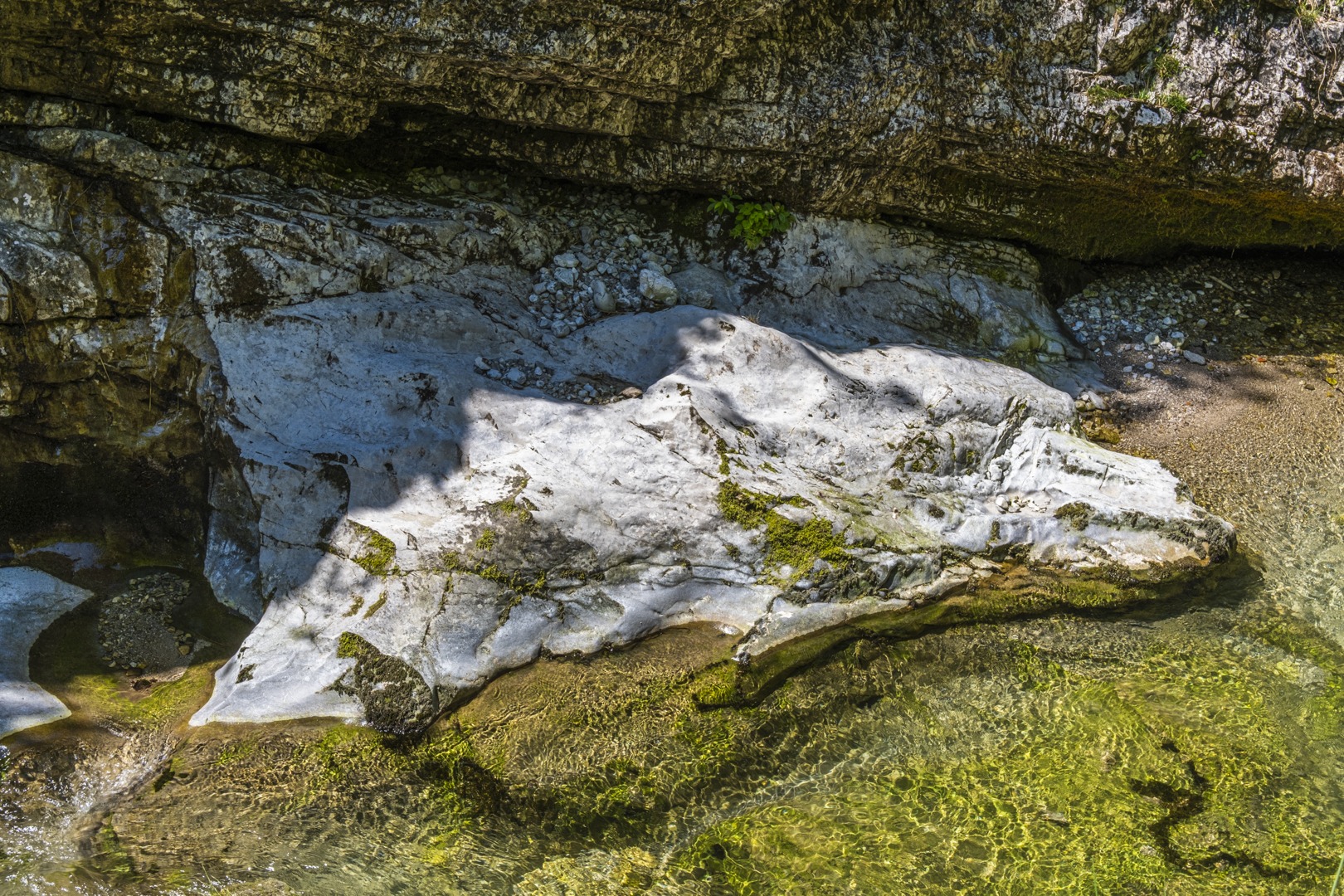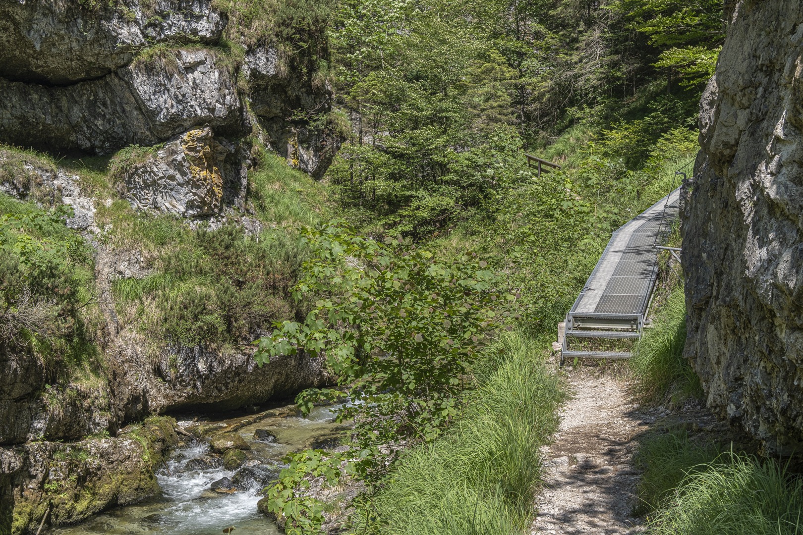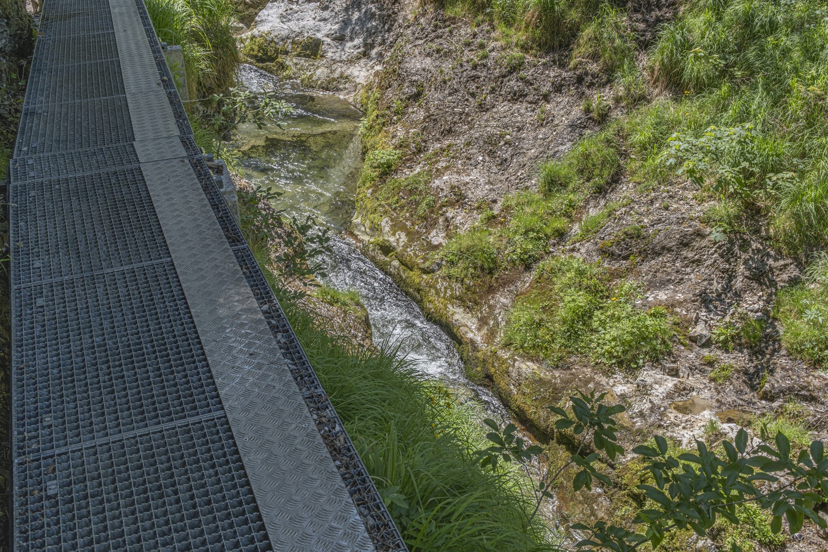 Wie bereits früher liegt bei großer Hitze der Gedanke nahe, nicht aus einen Berg zu steigen, sondern sich zwischen hohen, hoffentlich kühlenden Felswänden zu bewegen. Wir fahren nach Weißbach an der Alpenstraße und gehen einen Kilometer, und dann beginnt der Steig durch die Weißbachschlucht. Ein reizvoller alter Steig, der touristenmäßig aufgebessert wurde. Eine Schlucht ist breiter als eine Klamm – wäre zu bedenken gewesen -, und so kann die Sonne heute auch in der Schlucht ihr Bestes geben. Das Handling der Hitze wird nun wichtiger als das Betrachten der Umgebung. Am Ende des Steiges, noch vor Erreichen der Straße, kehren wir um und gehen zurück. Mit Gudrun.
