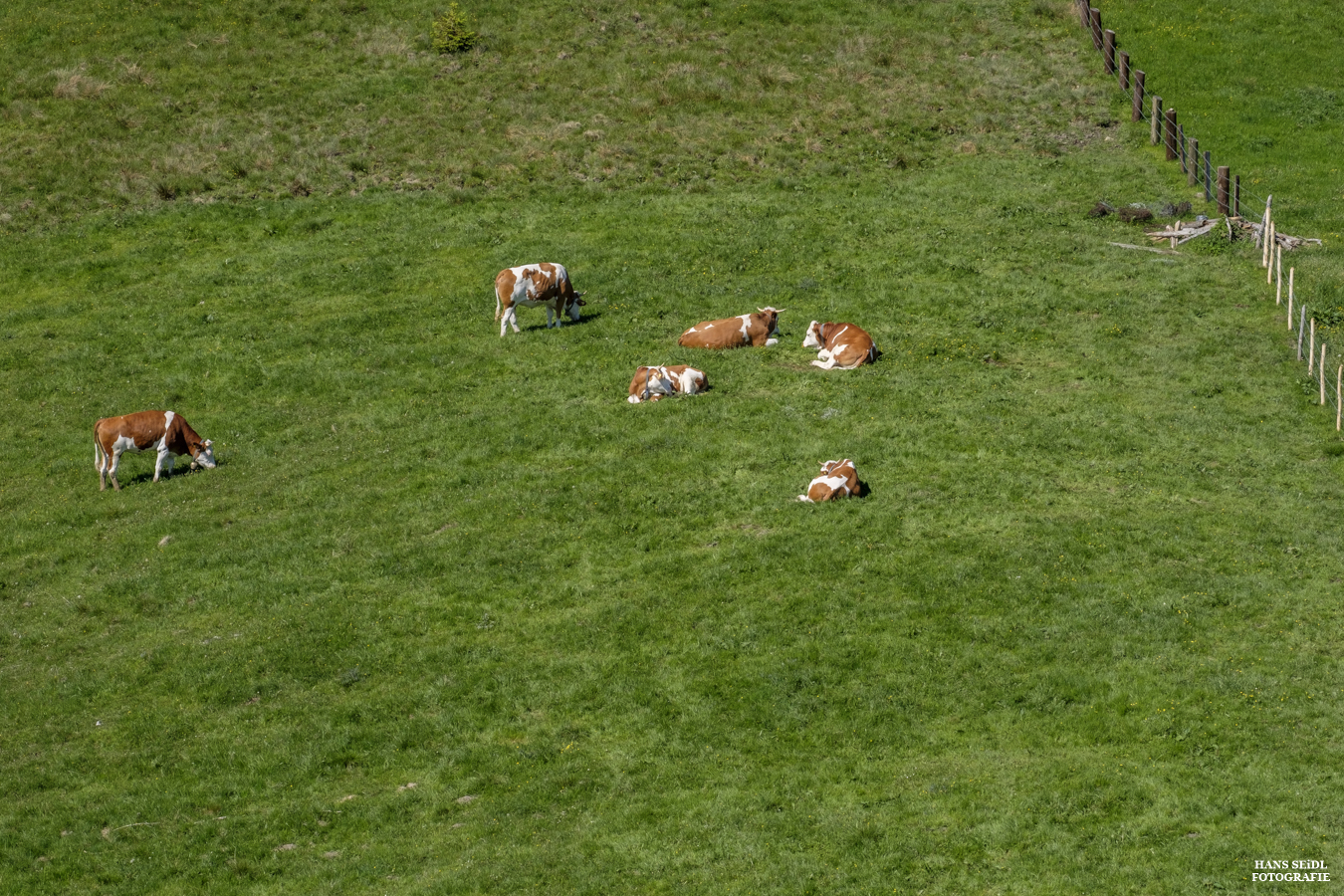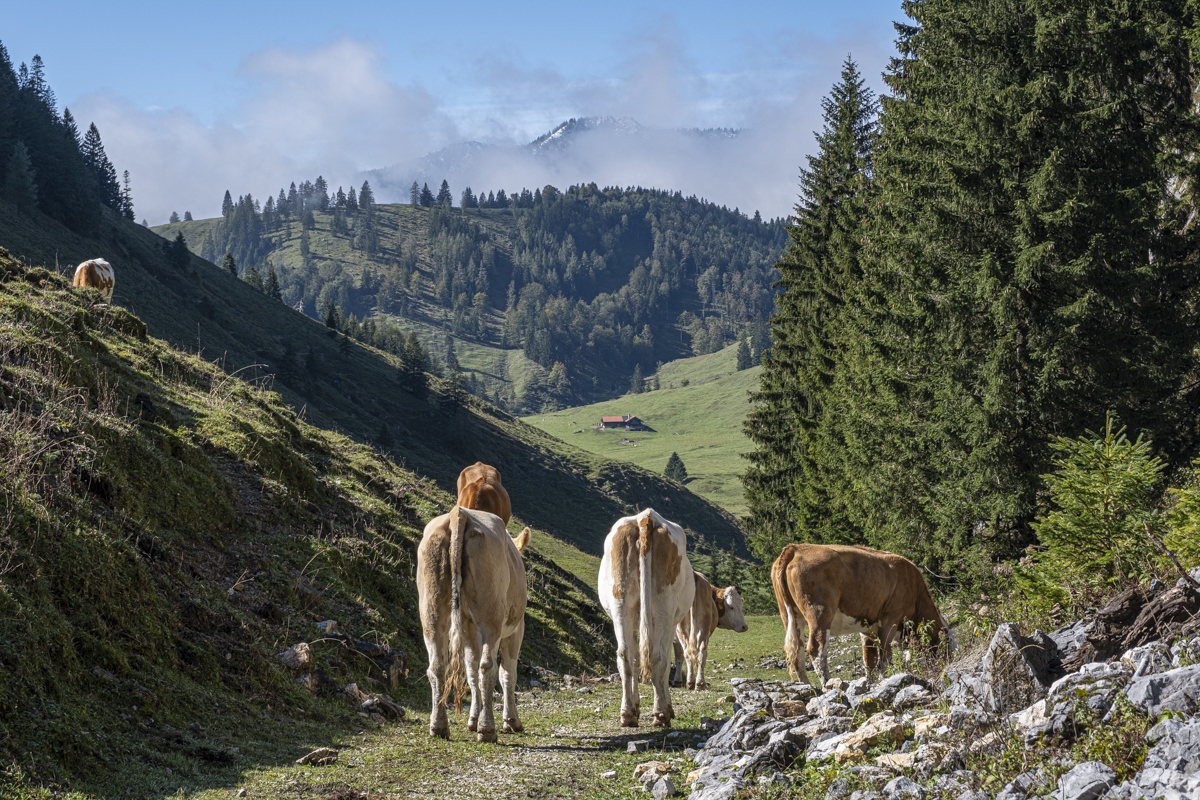 Wir starten am Nachmittag vom Parkplatz im hinteren Jenbachtal. Über den Nigglsteig hinauf, heute ignorieren wir den Mitterberg. Die beste Sicht gibt es von der Ostseite des breiten Gipfels, eine Rundumsicht. Blaue Fotos werden gemacht, und wir gehen hinüber zum Gipfelkreuz des Farrenpoint, die Gipfelbank ist frei, niemand ist mehr da, nur ein paar gefleckte Säugetiere stehen herum. An der Huberalm vorbei und auf den Straßen und Abkürzern hinunter zum Parkplatz. Mit Gudrun.