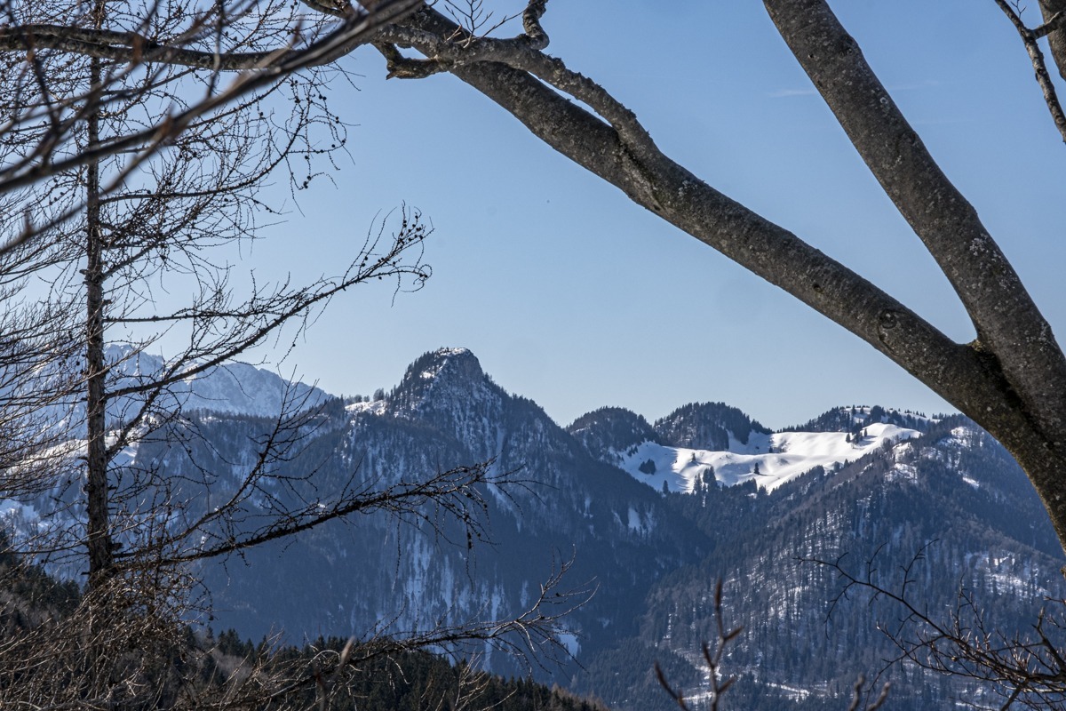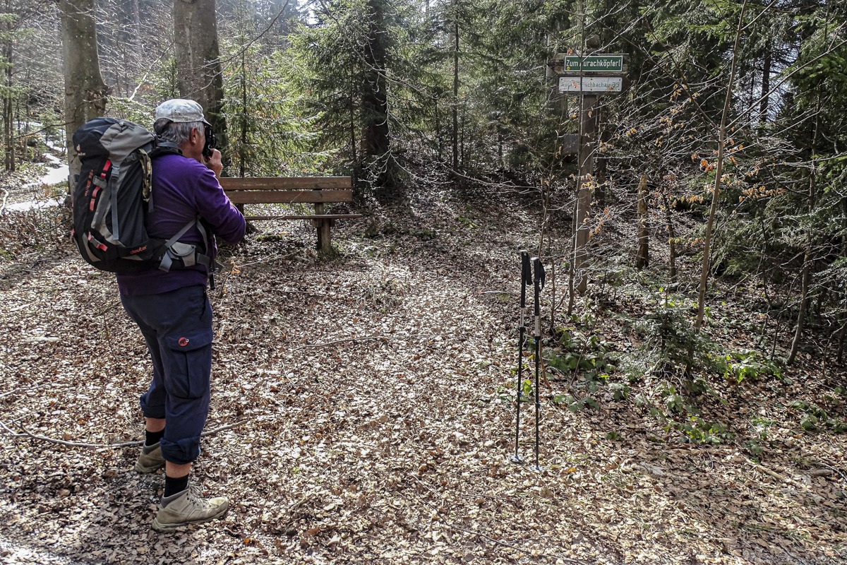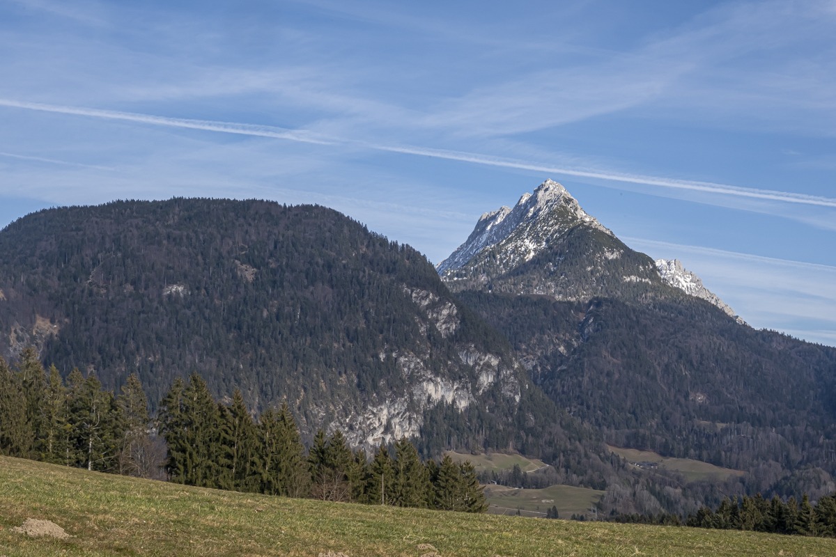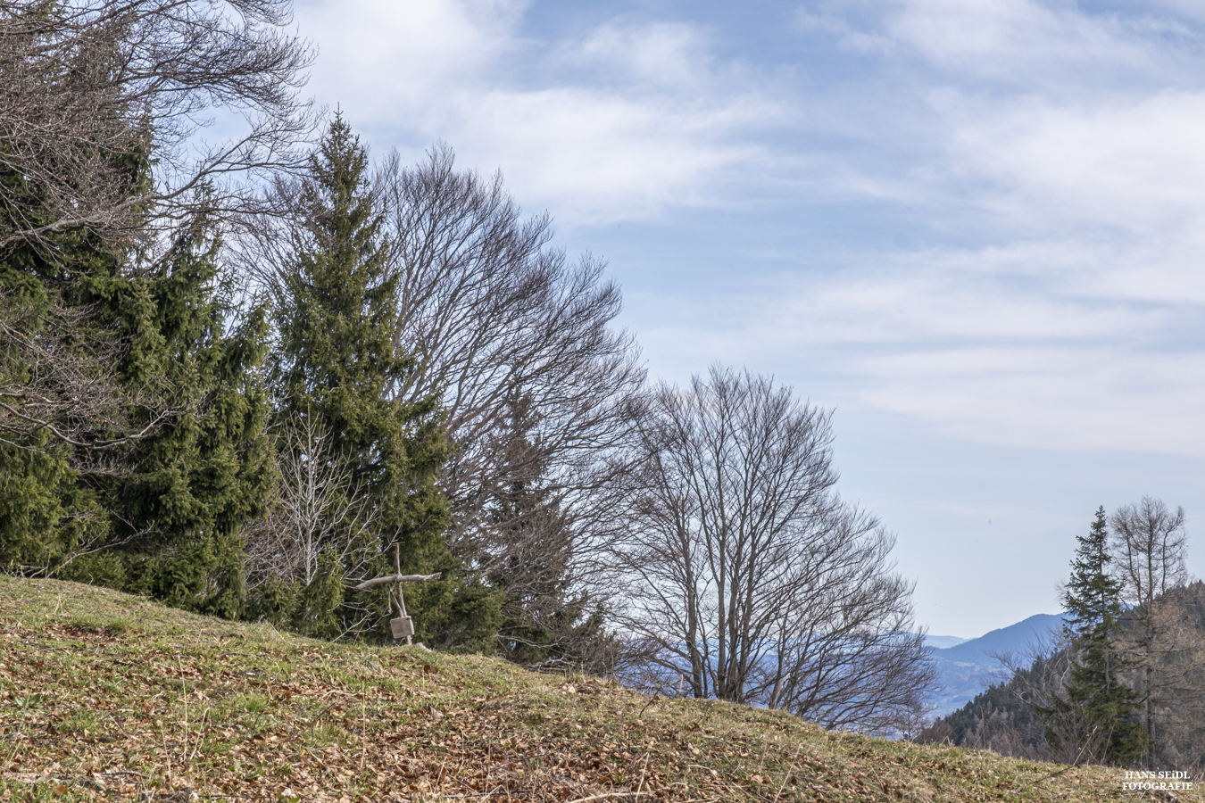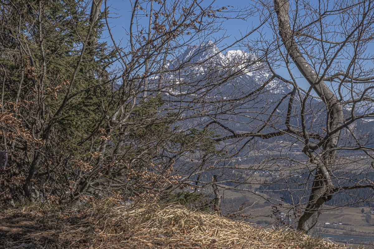 In Walchsee fahren wir zum Parkplatz am Sportplatz. Verlaufen wäre schwierig, und so gehen wir hoch und auf dem Kamm und Grat bis zum Gipfel, der sich mit einem Schild zu erkennen gibt. Trotz laubloser Buchen ist die Sicht eingeschränkt, in meiner Erinnerung an die früheren Begehungen hatte ich mehr gesehen, na ja. Wir überschreiten die Harauer Spitze und kurzzeitig gibt es Sicht und Berggefühl. Hinunter zur Ottenalm und auf der Straße zurück. Mit Jürgen.