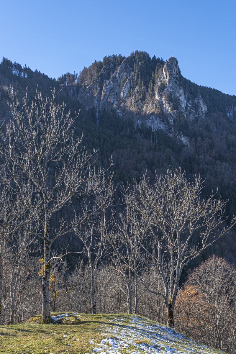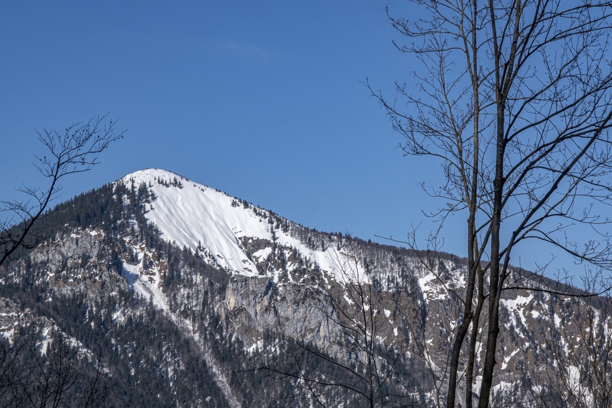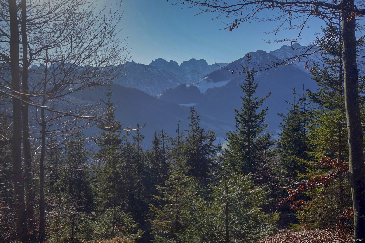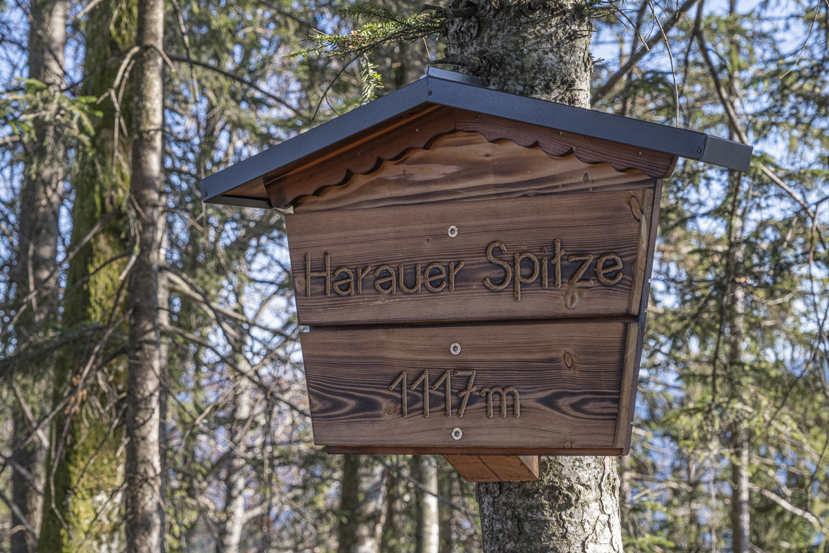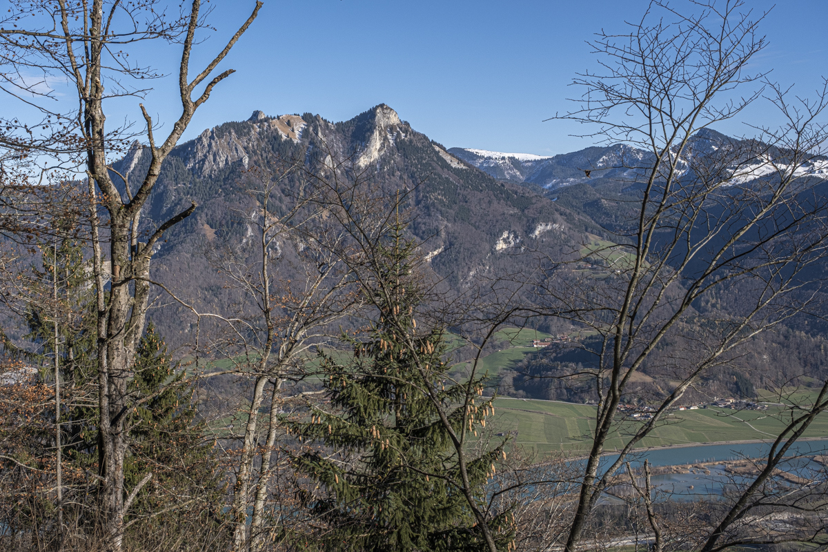 In Walchsee fahren wir zum Parkplatz am Sportplatz. Verlaufen wäre schwierig, und so gehen wir hoch und auf dem Kamm und Grat bis zum Gipfel, der sich mit einem Schild zu erkennen gibt. Trotz laubloser Buchen ist die Sicht eingeschränkt, in meiner Erinnerung an die früheren Begehungen hatte ich mehr gesehen, na ja. Wir überschreiten die Harauer Spitze und kurzzeitig gibt es Sicht und Berggefühl. Hinunter zur Ottenalm und auf der Straße zurück. Mit Jürgen.
