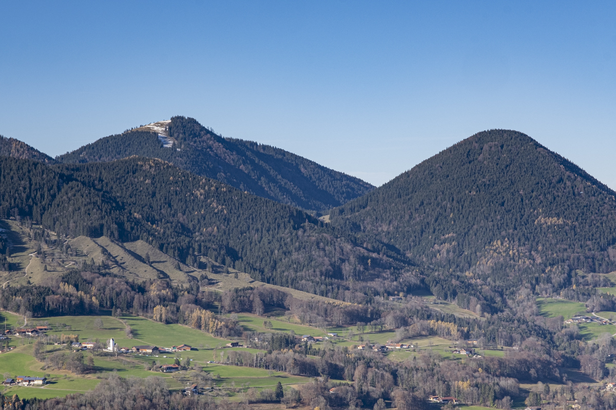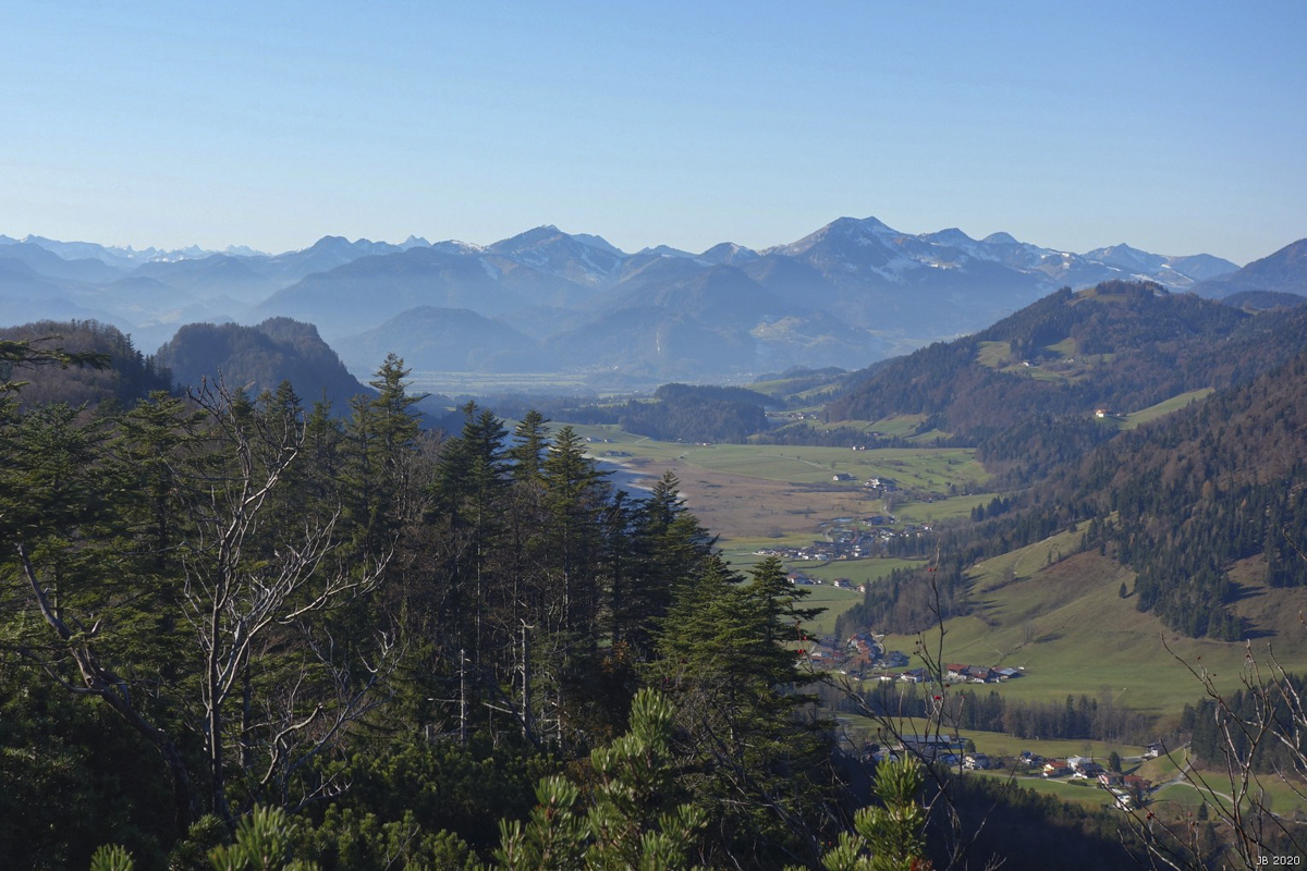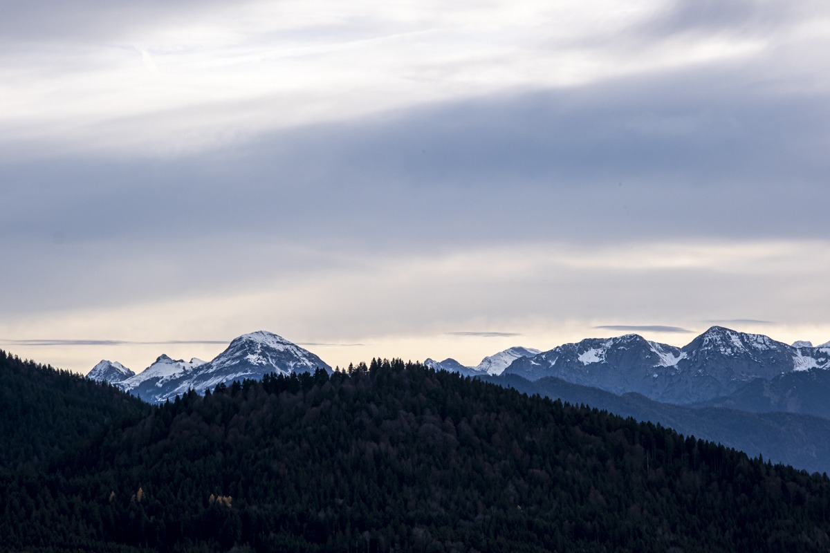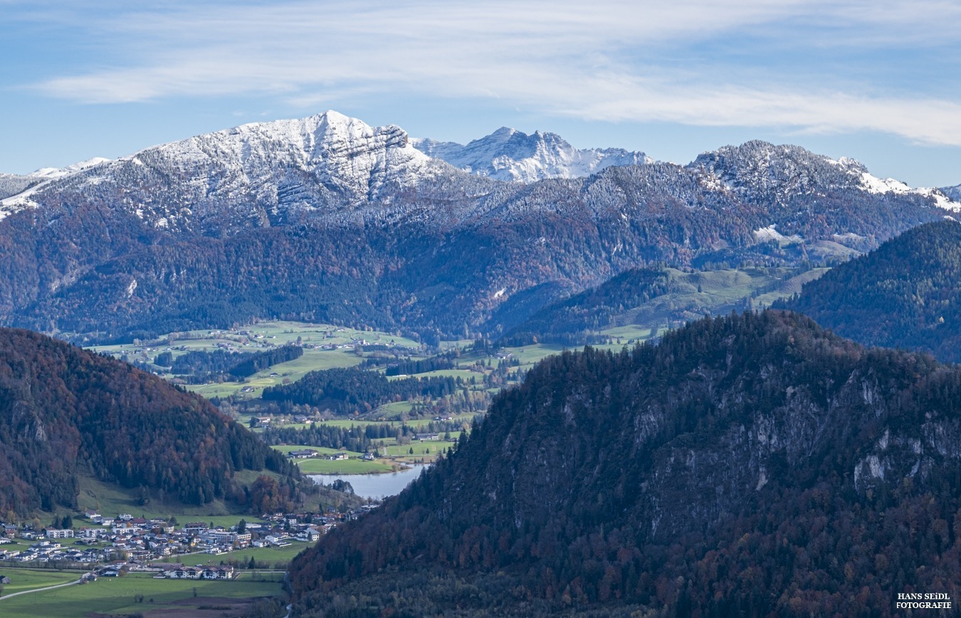 Der erste Schnee in den Bergen hat Auswirkungen auf die Wahl der Bergziele, favorisiert werden nun die geringeren Höhen. Auf der Karte finde ich den Chiemkogel, und in den unendlichen Weiten des Internet einen GPS Track. Wir parken bei der Volksschule unterhalb von Rettenschöss. Der Staudinger Bach gibt die Richtung vor, und ab der Staudinger Grotte geht es zügig bergauf. Der Gipfel ist eine unscheinbare Kuppe, direkt unterhalb eine Alm mit zugehöriger Teerstraße, was aber keine Auswirkungen auf die nette Aussicht hat – Kranzhorn, Spitzstein, Unterberghorn, Heuberg, Unterberghorn, Inntal, Pendling, Brünnstein, Wendelstein, … Wir machen eine Überschreitung, der Track hilft bei den schneebedeckten Wiesen hier oben, den Weg zu finden und auf ihm zu bleiben. Mit Gudrun.