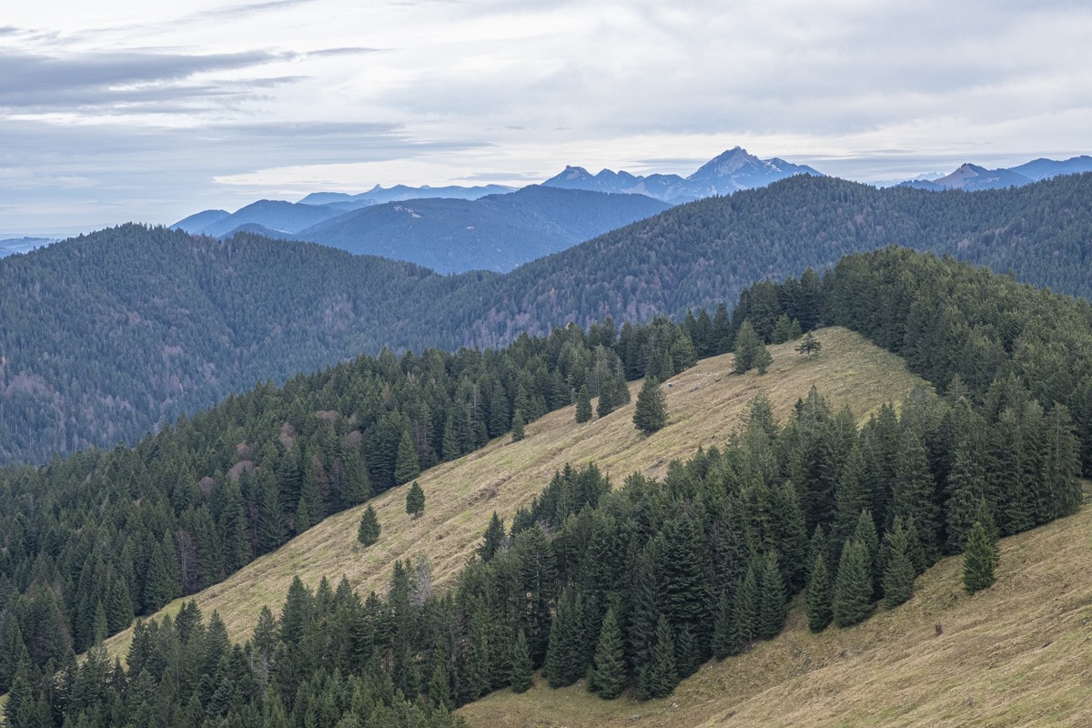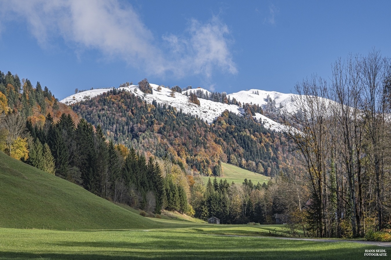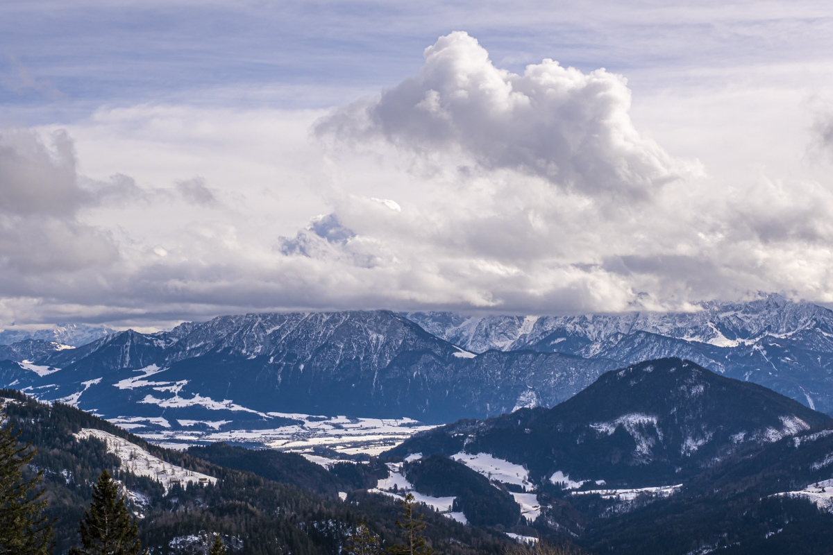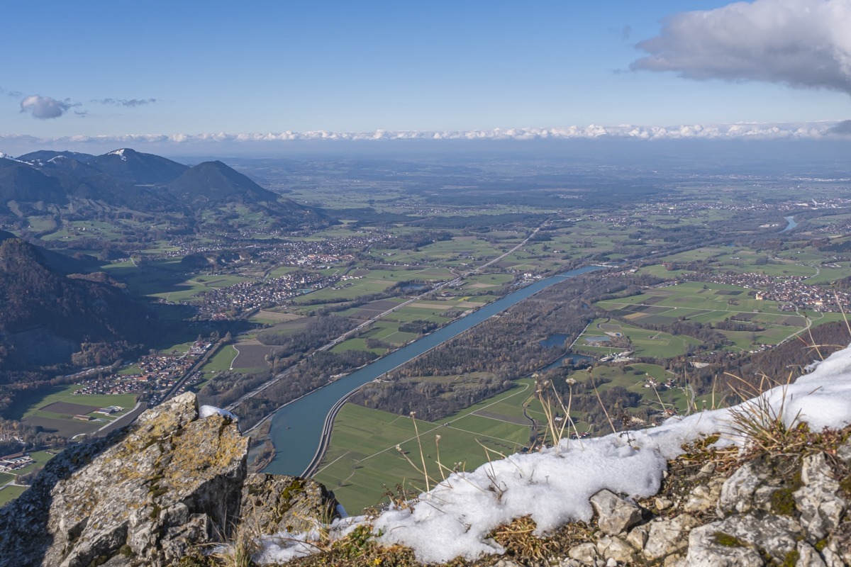Der erste Schnee in den Bergen hat Auswirkungen auf die Wahl der Bergziele, favorisiert werden nun die geringeren Höhen. Auf der Karte finde ich den Chiemkogel, und in den unendlichen Weiten des Internet einen GPS Track. Wir parken bei der Volksschule unterhalb von Rettenschöss. Der Staudinger Bach gibt die Richtung vor, und ab der Staudinger Grotte geht es zügig bergauf. Der Gipfel ist eine unscheinbare Kuppe, direkt unterhalb eine Alm mit zugehöriger Teerstraße, was aber keine Auswirkungen auf die nette Aussicht hat – Kranzhorn, Spitzstein, Unterberghorn, Heuberg, Unterberghorn, Inntal, Pendling, Brünnstein, Wendelstein, … Wir machen eine Überschreitung, der Track hilft bei den schneebedeckten Wiesen hier oben, den Weg zu finden und auf ihm zu bleiben. Mit Gudrun.