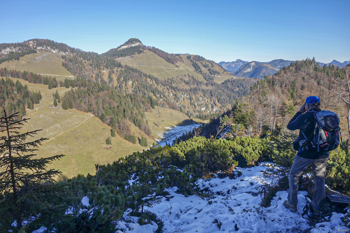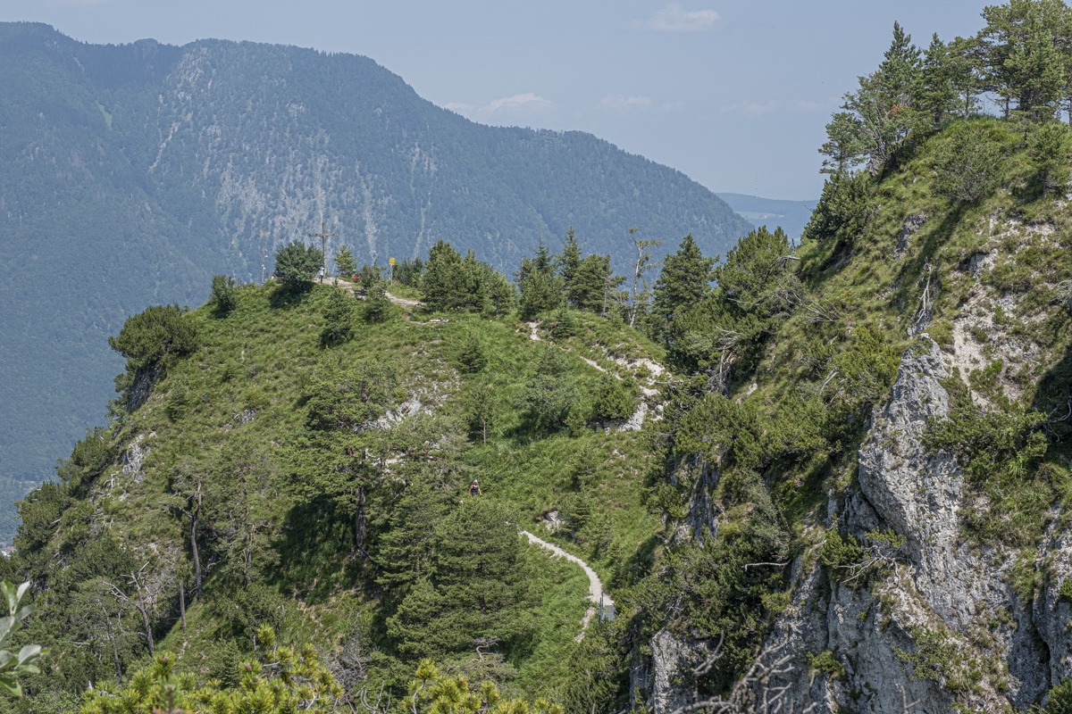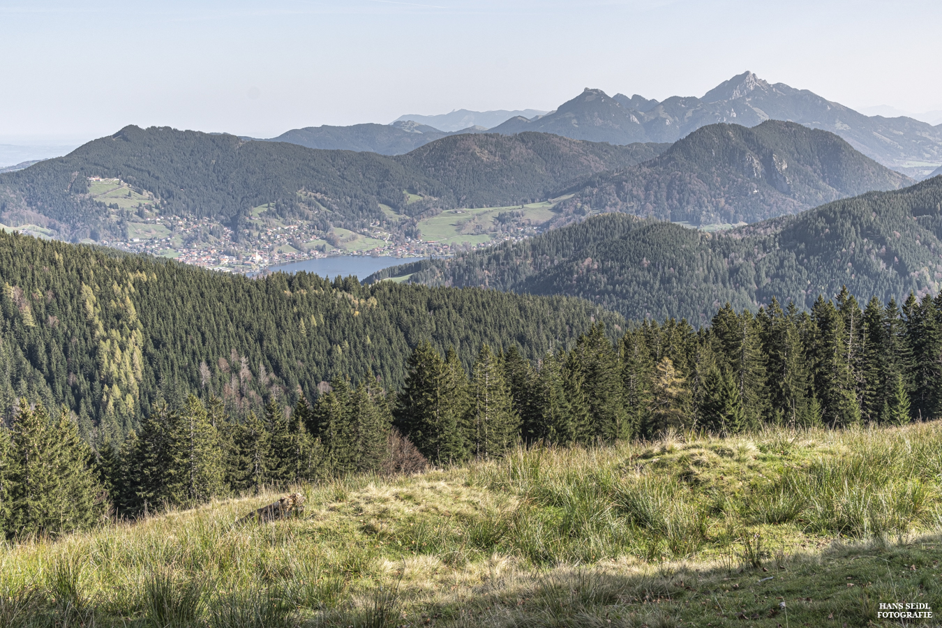 Heute mal andersrum. Nach der Auffahrt zu Wallbergmoos gehen wir auf der Forststraße (das Unangenehme zuerst), bis der Wegweiser nach links weist. An der Freisinger Hütte vorbei auf den Gipfel. Die bekannte imposante Rundschau ist leider durch den Dunst getrübt. Nach Süden steil und wurzelig hinunter, und dann queren wir hinüber zum geschlossenen Wallberghaus. Und der Rest ist klar. Abschluss der Tour auf der Point und im Tegernsee. Mit Gudrun.