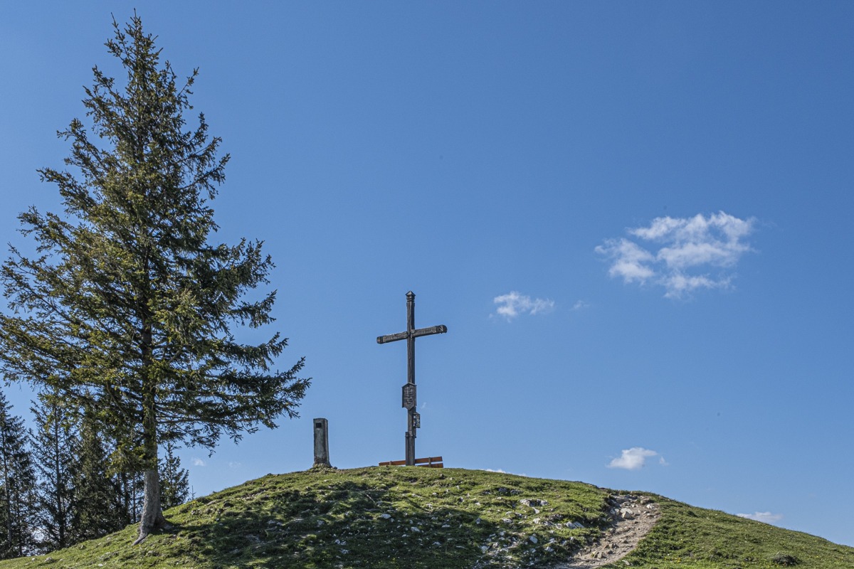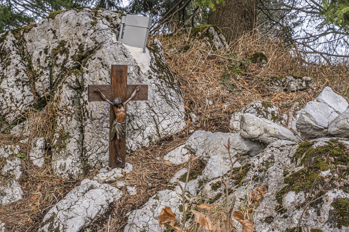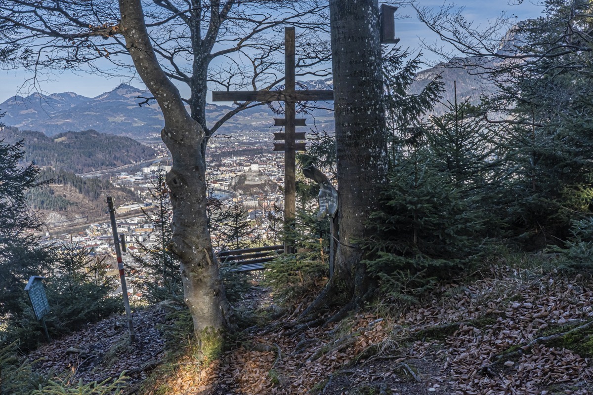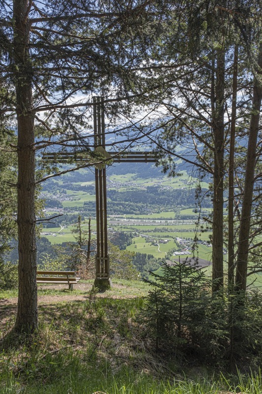 Der kleine Parkplatz ist vor der Schranke oberhalb von Grünsbach in der Nähe von Kramsach. Der GPS-Track hilft, bald die Fahrstraße nach rechts zu verlassen, der Habacher Bach wird überschritten, und dann geht’s direkt nach oben zum Herrgottstein, ein weit überhängender Felsblock, ein Wallfahrtsort. Weiter zur Postalm, idyllisch gelegen, und zur Kniepasskapelle, im Wald, verschlossen, und zum Kniepasskreuz, etwas überdimensioniert, aber der Aussicht übers Inntal durchaus angemessen. Leider kommt nun eine sehr lange Straße. Vielleicht wäre es geschickter gewesen, zur Postalm zurückzugehen und auf der anderen Seite des Habacher Bachs abzusteigen.