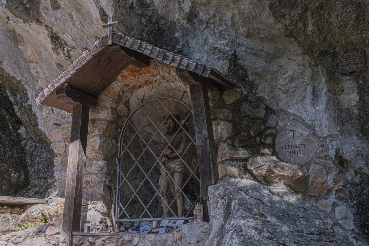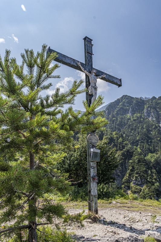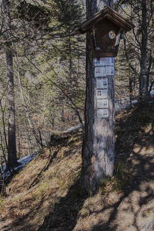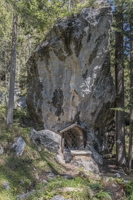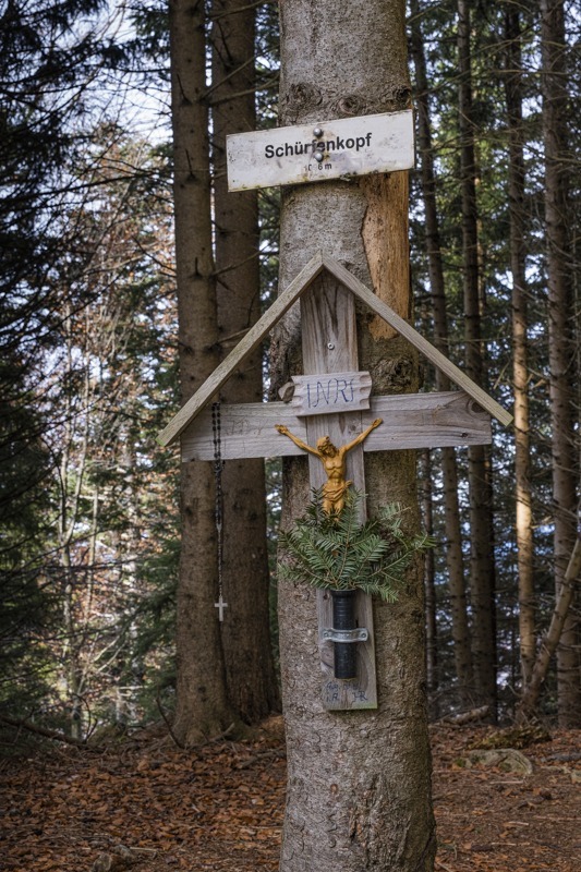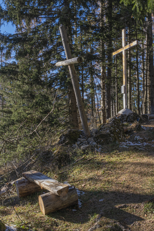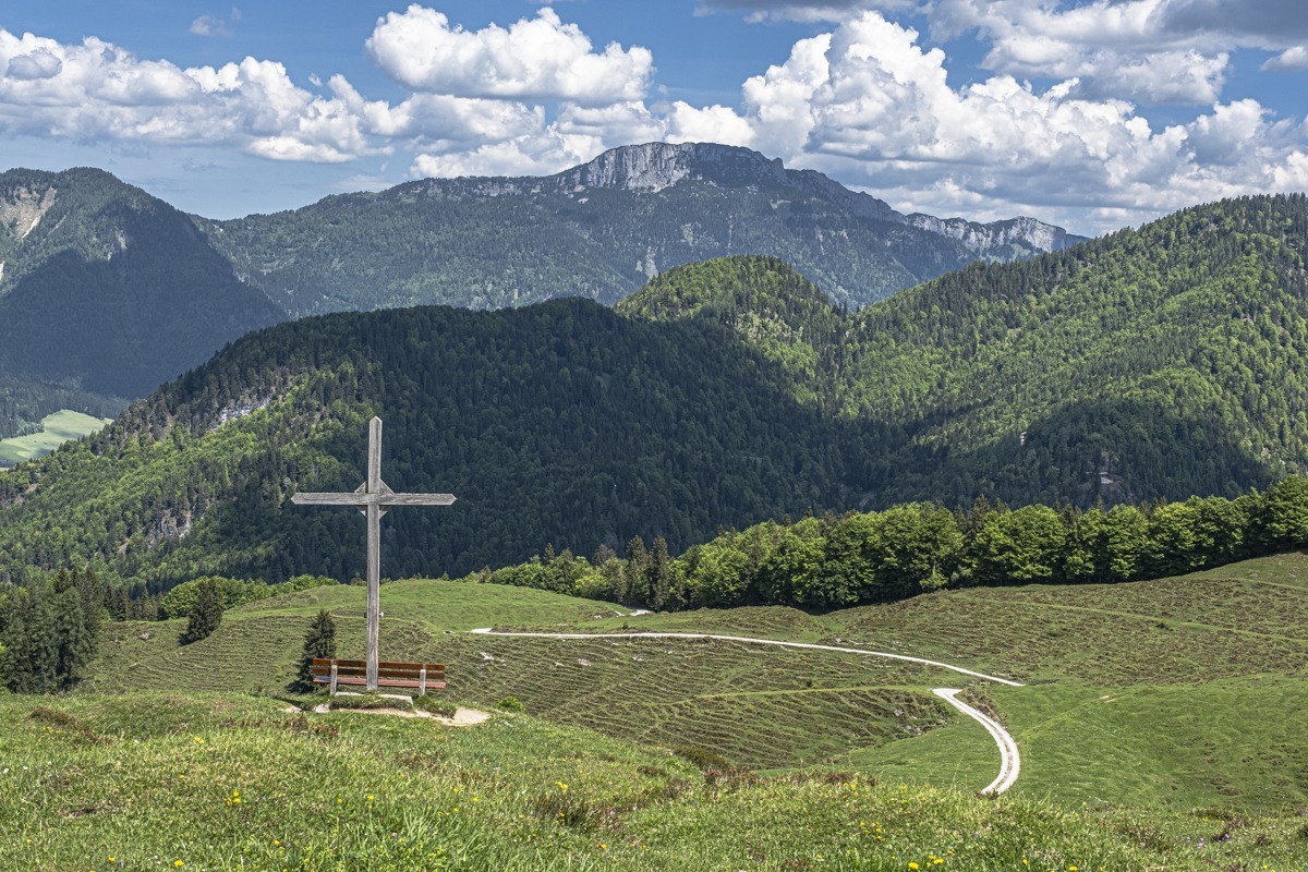 Der kleine Parkplatz ist vor der Schranke oberhalb von Grünsbach in der Nähe von Kramsach. Der GPS-Track hilft, bald die Fahrstraße nach rechts zu verlassen, der Habacher Bach wird überschritten, und dann geht’s direkt nach oben zum Herrgottstein, ein weit überhängender Felsblock, ein Wallfahrtsort. Weiter zur Postalm, idyllisch gelegen, und zur Kniepasskapelle, im Wald, verschlossen, und zum Kniepasskreuz, etwas überdimensioniert, aber der Aussicht übers Inntal durchaus angemessen. Leider kommt nun eine sehr lange Straße. Vielleicht wäre es geschickter gewesen, zur Postalm zurückzugehen und auf der anderen Seite des Habacher Bachs abzusteigen.