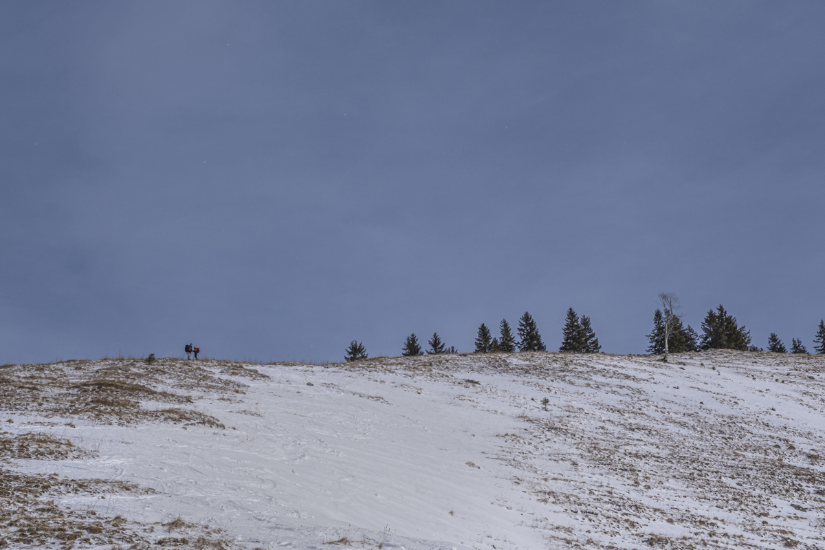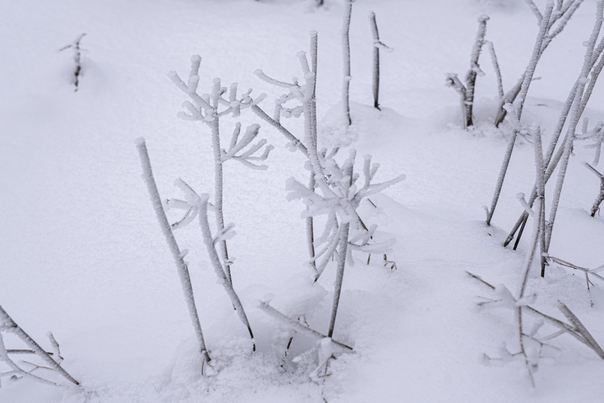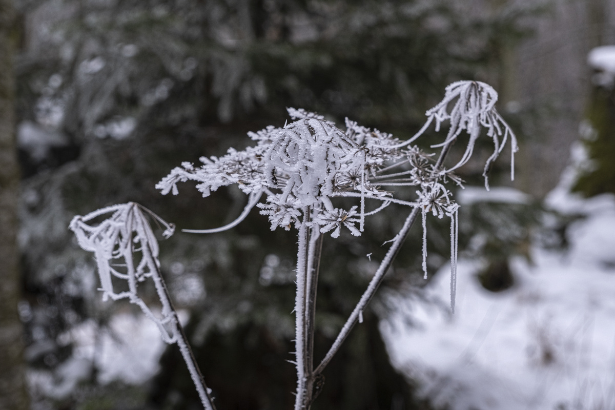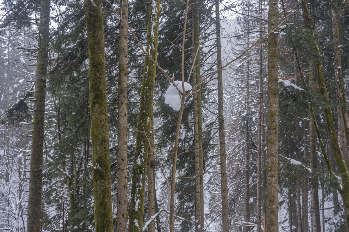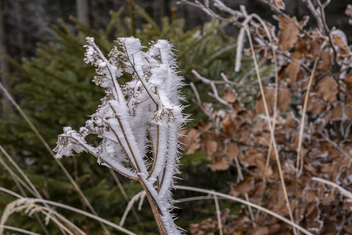Der Wanderparkplatz am Wolfsee südlich von Fischbachau. Auf einem Fahrweg, dann auf einem Bergweg mit gelben Punkten, dann wieder Fahrweg und Forststraße – so geht es nach Osten, und wir umrunden den Rehbichl, um von Süden weglos aufzusteigen. Durch Gestrüpp, über Baumstämme, manchmal finden wir schmale ausgeholzte Schneisen mit Grenzsteinen (Grenze zwischen wem/was?), manchmal orientieren wir uns an den Bambi-Spuren im Schnee. Der Gipfel ist als solcher nicht erkennbar, und wir gehen schnell weglos nach Westen hinunter, und nach einem weiteren Anstieg auf eine Kuppe treffen wir auf eine Fahrstraße. Ohne GPS-Track bis hierher eigentlich nicht zu schaffen. Über uns der graue Hochnebel, um uns herum wirklich sehenswerte Reifskulpturen. Wir bewegen uns auf Forstwegen erst nach Westen, dann nach Osten und wieder nach Westen, und später über die unscheinbare Karolinenhöhe und oberhalb des Steinbruchs vorbei hinunter zur Bundesstraße. Mit Gudrun.