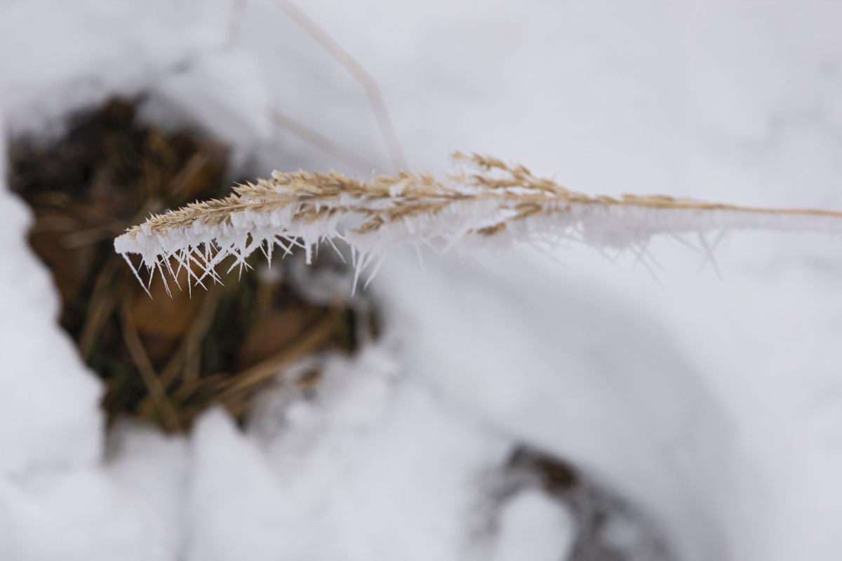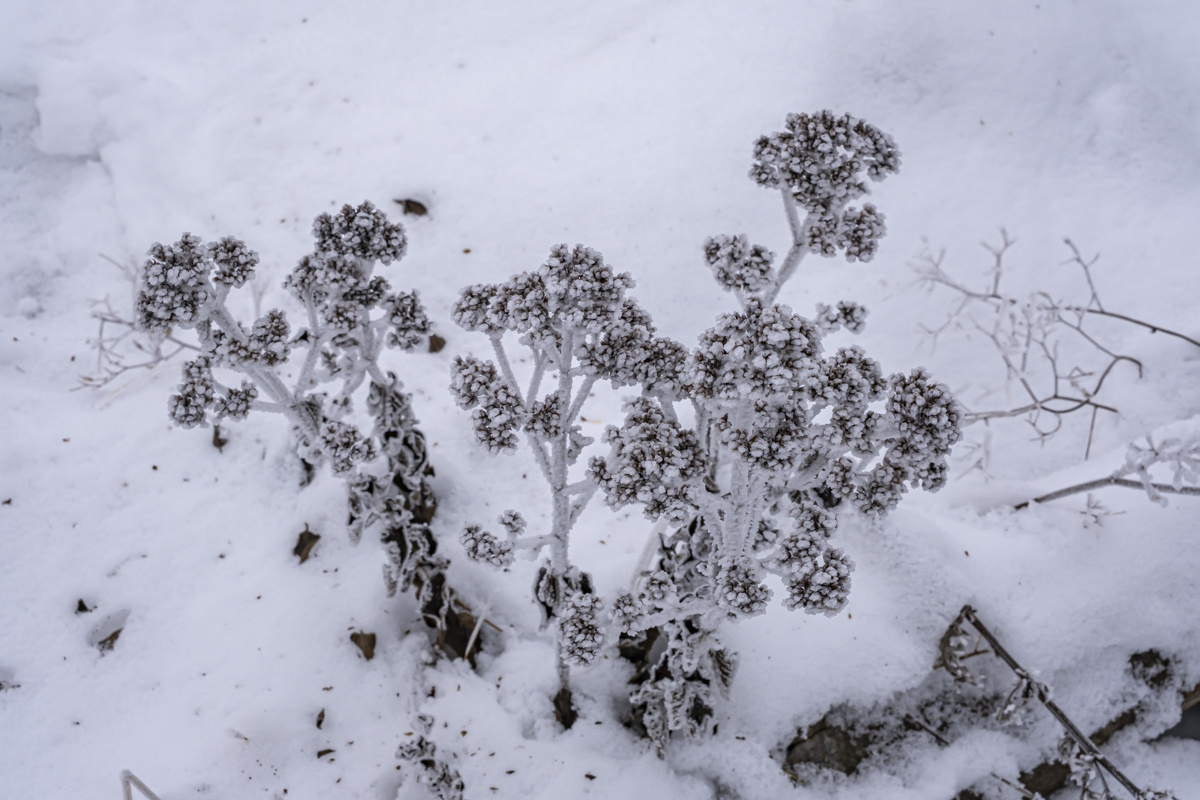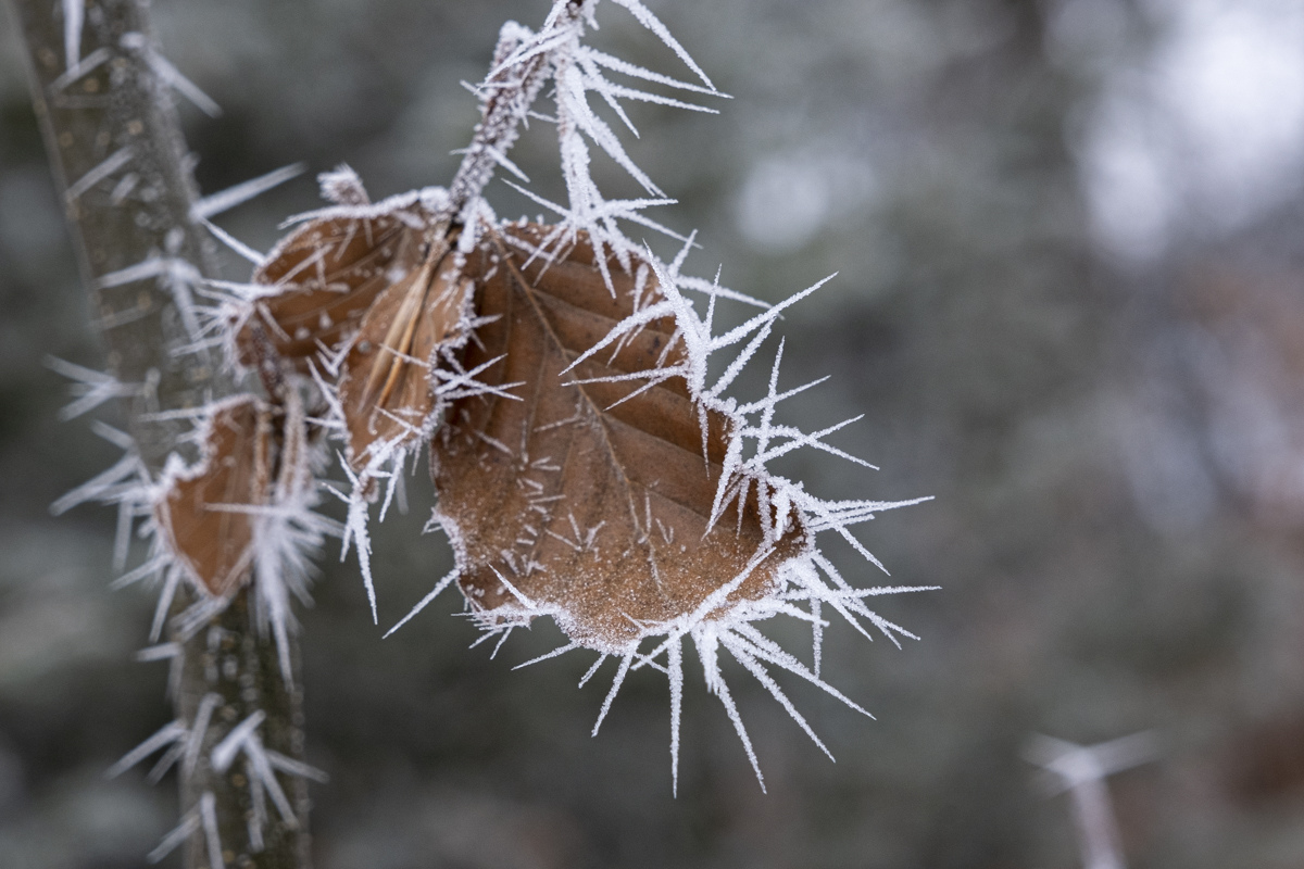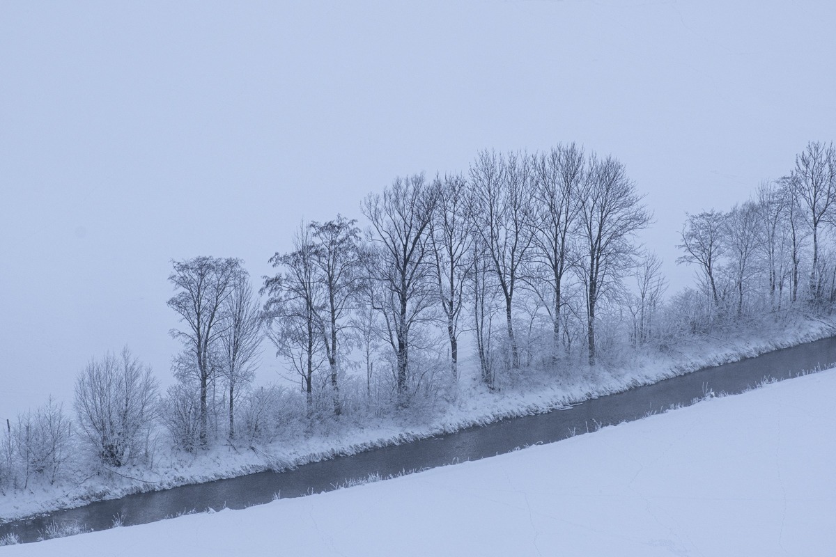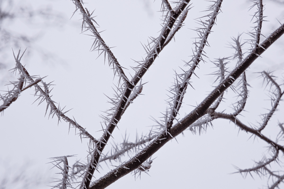 Der Wanderparkplatz am Wolfsee südlich von Fischbachau. Auf einem Fahrweg, dann auf einem Bergweg mit gelben Punkten, dann wieder Fahrweg und Forststraße – so geht es nach Osten, und wir umrunden den Rehbichl, um von Süden weglos aufzusteigen. Durch Gestrüpp, über Baumstämme, manchmal finden wir schmale ausgeholzte Schneisen mit Grenzsteinen (Grenze zwischen wem/was?), manchmal orientieren wir uns an den Bambi-Spuren im Schnee. Der Gipfel ist als solcher nicht erkennbar, und wir gehen schnell weglos nach Westen hinunter, und nach einem weiteren Anstieg auf eine Kuppe treffen wir auf eine Fahrstraße. Ohne GPS-Track bis hierher eigentlich nicht zu schaffen. Über uns der graue Hochnebel, um uns herum wirklich sehenswerte Reifskulpturen. Wir bewegen uns auf Forstwegen erst nach Westen, dann nach Osten und wieder nach Westen, und später über die unscheinbare Karolinenhöhe und oberhalb des Steinbruchs vorbei hinunter zur Bundesstraße. Mit Gudrun.