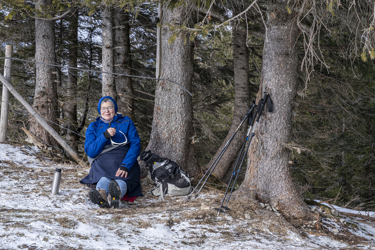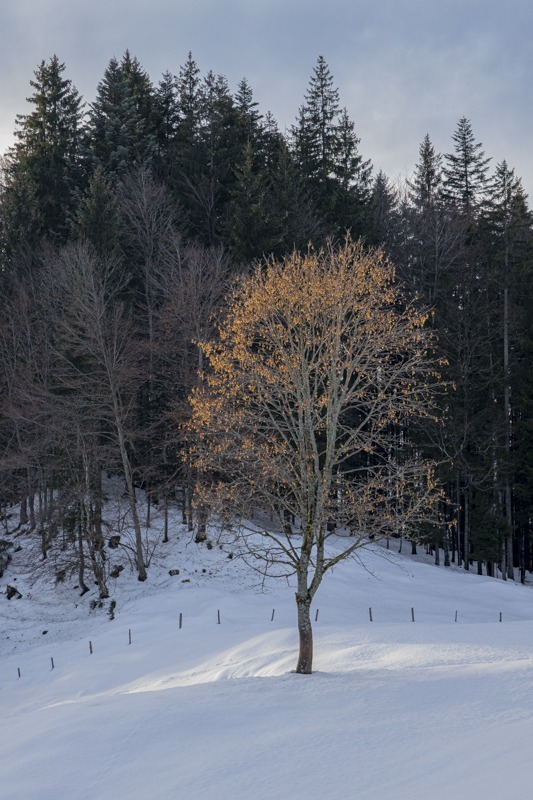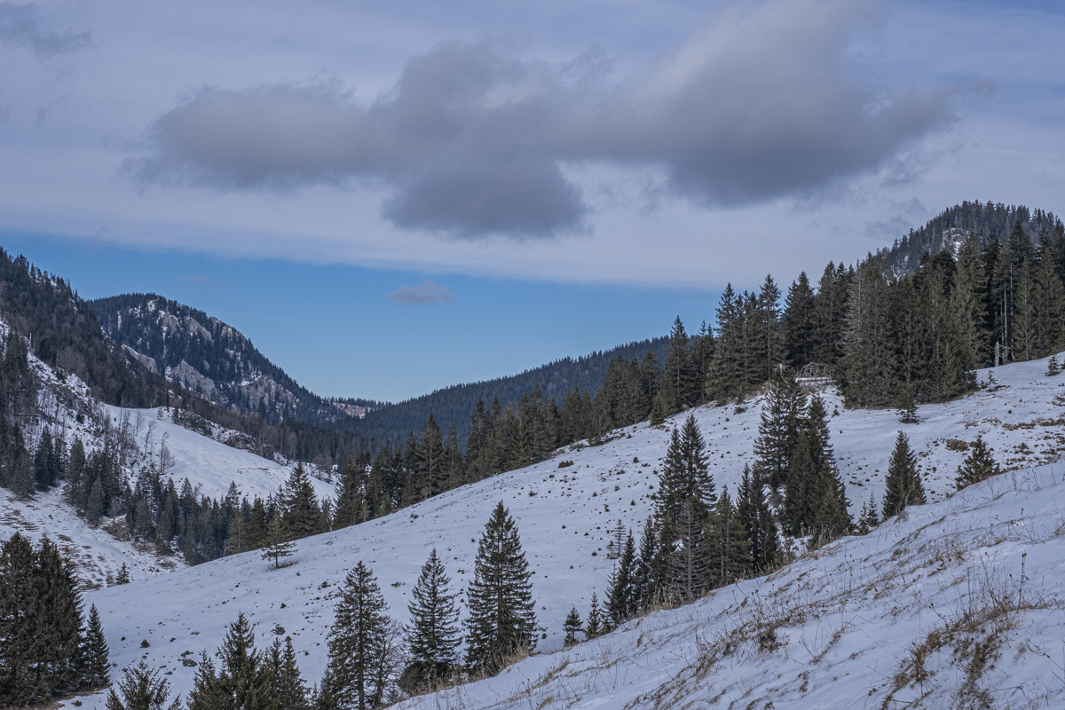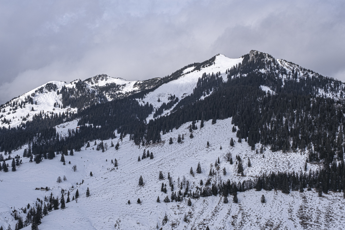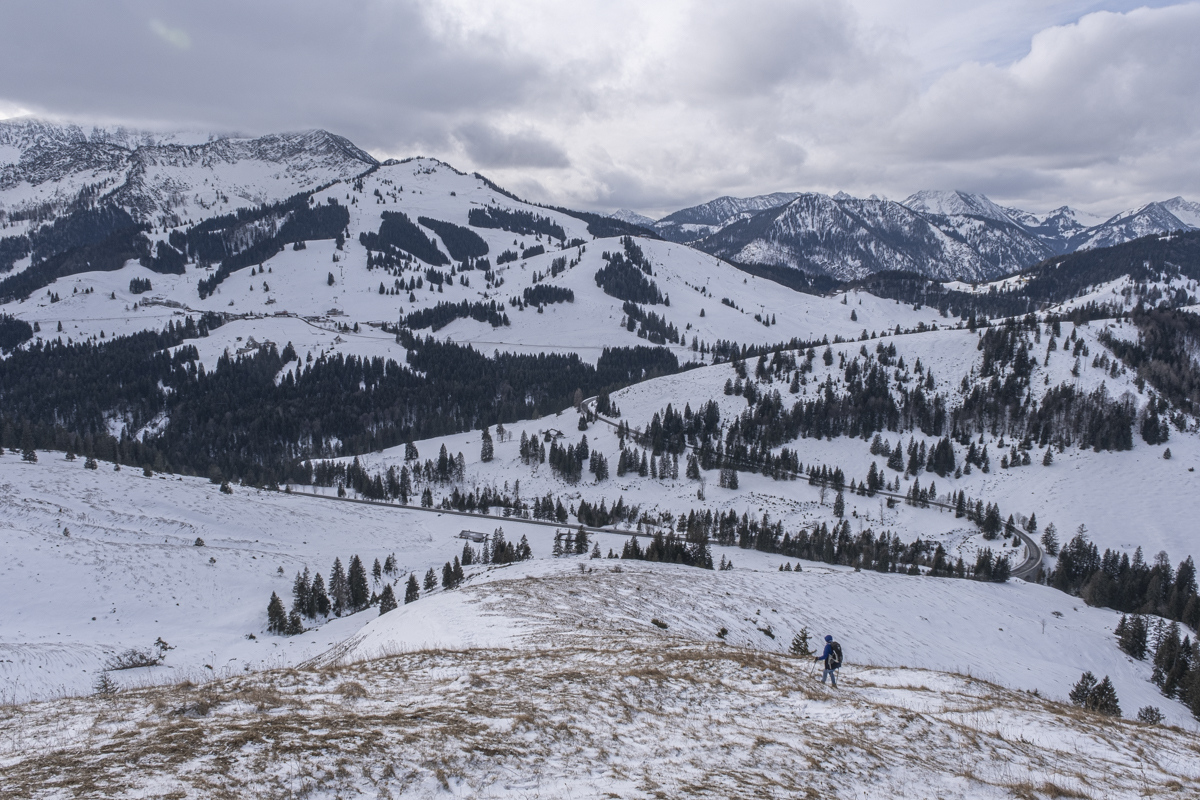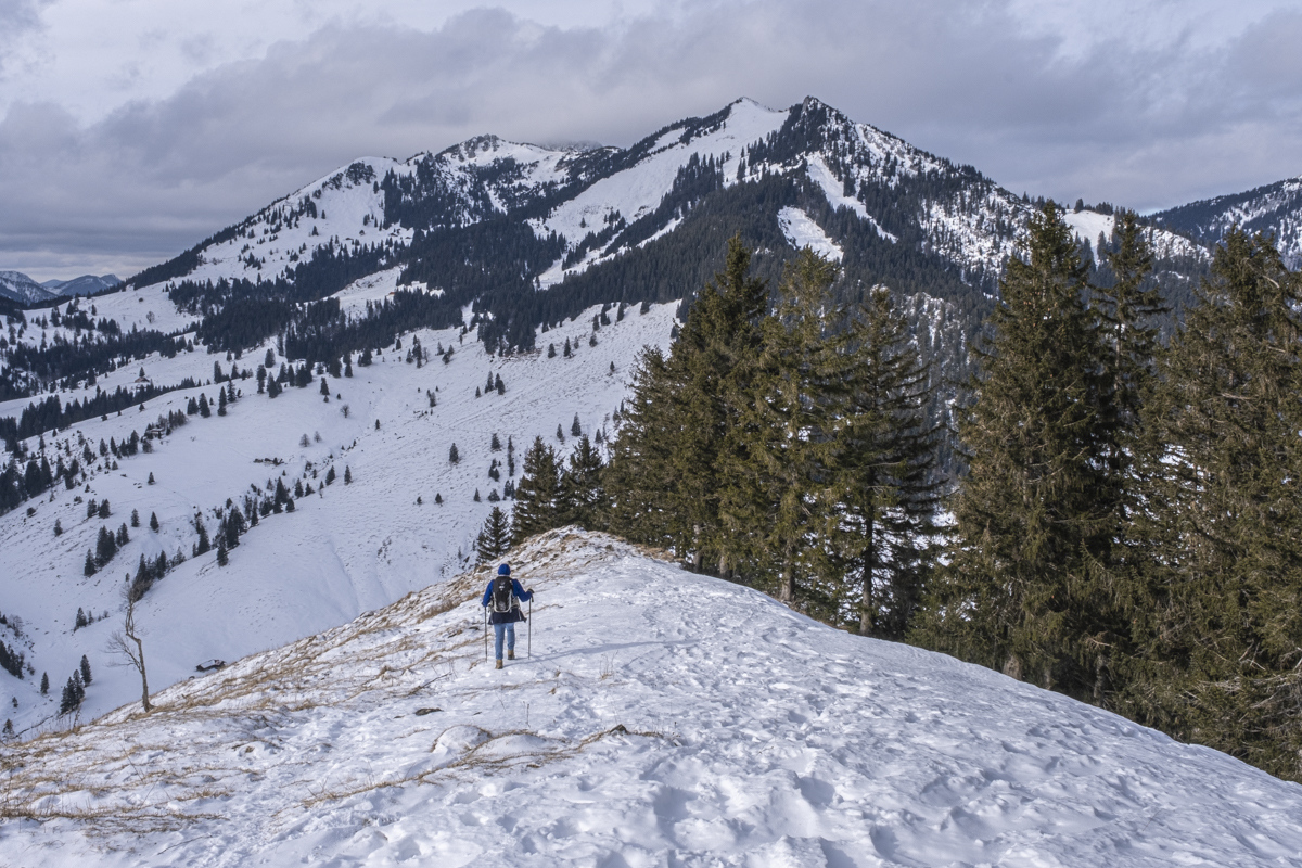 Geplant ist eine Schneeschuh-Eingeh-Tour. Die Sudelfeld-Webcam zeigt einen Schneestreifen von der Arzmoos-Brücke hinauf bis zum Gipfel des Schreckenkopf. Beim Ortstermin entpuppt sich der Streifen allerdings als eine Art optischer Täuschung meinerseits. Die Schneeschuhe wandern also (mit meiner Hilfe) wieder zurück in den Kofferraum, und wir gehen einfach so los. Eine bekanntermaßen kurze Tour, aber mit immer wieder netter Aussicht. Und mit Gudrun.