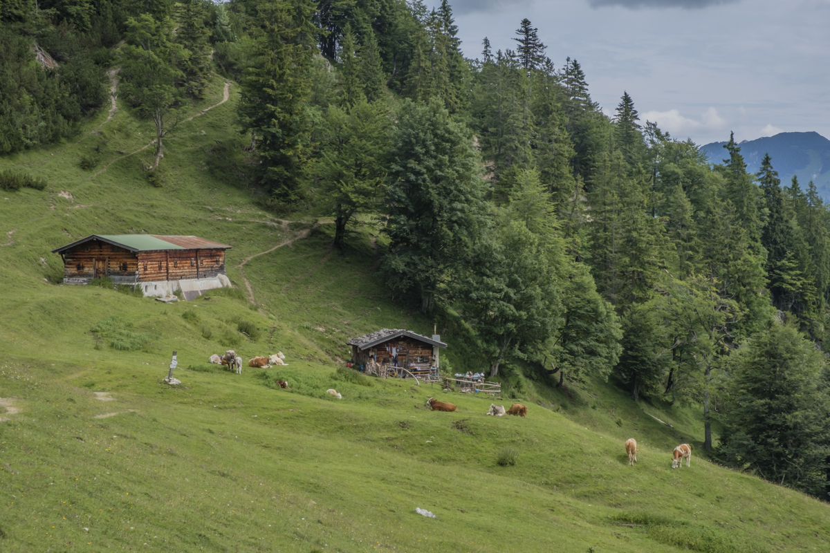 Farnbichlalm bei Wangenau nördlich von Inzell. Weder der Aufstieg am Siebersee vorbei noch der Abstieg über die Hubertus-Hütte sind …