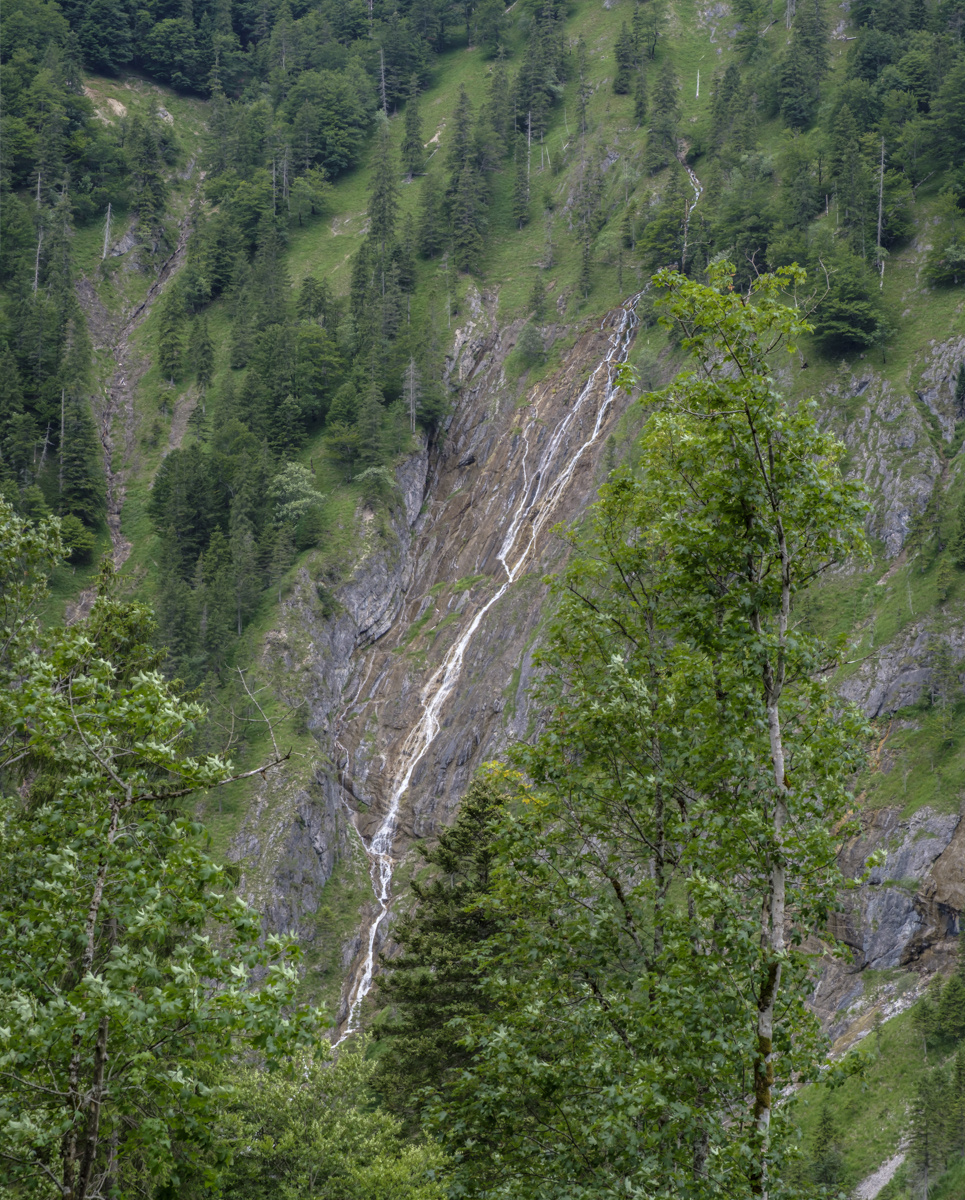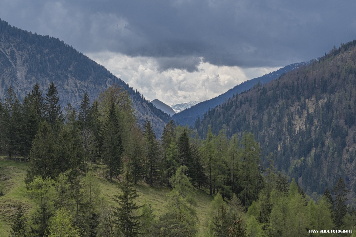 Start ist bei der Brücke über die Weiße Valepp kurz vor dem Forsthaus. Es ist schwül, dass ich schwitze, ist untertrieben. An der Trausnitzalm (eine Alm, zu der keine Straße führt!) vorbei zum Marterl, und dann hinab auf sehr undeutlichem Steig zur Erzherzog-Johann-Klause. Die Klause wird nicht erreicht, auf dem Wanderweg an der Valepp entlang, dann wieder in die Höhe und zurück zum Auto. Auf den letzten Metern gibt es ein Donner-Wetter.